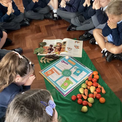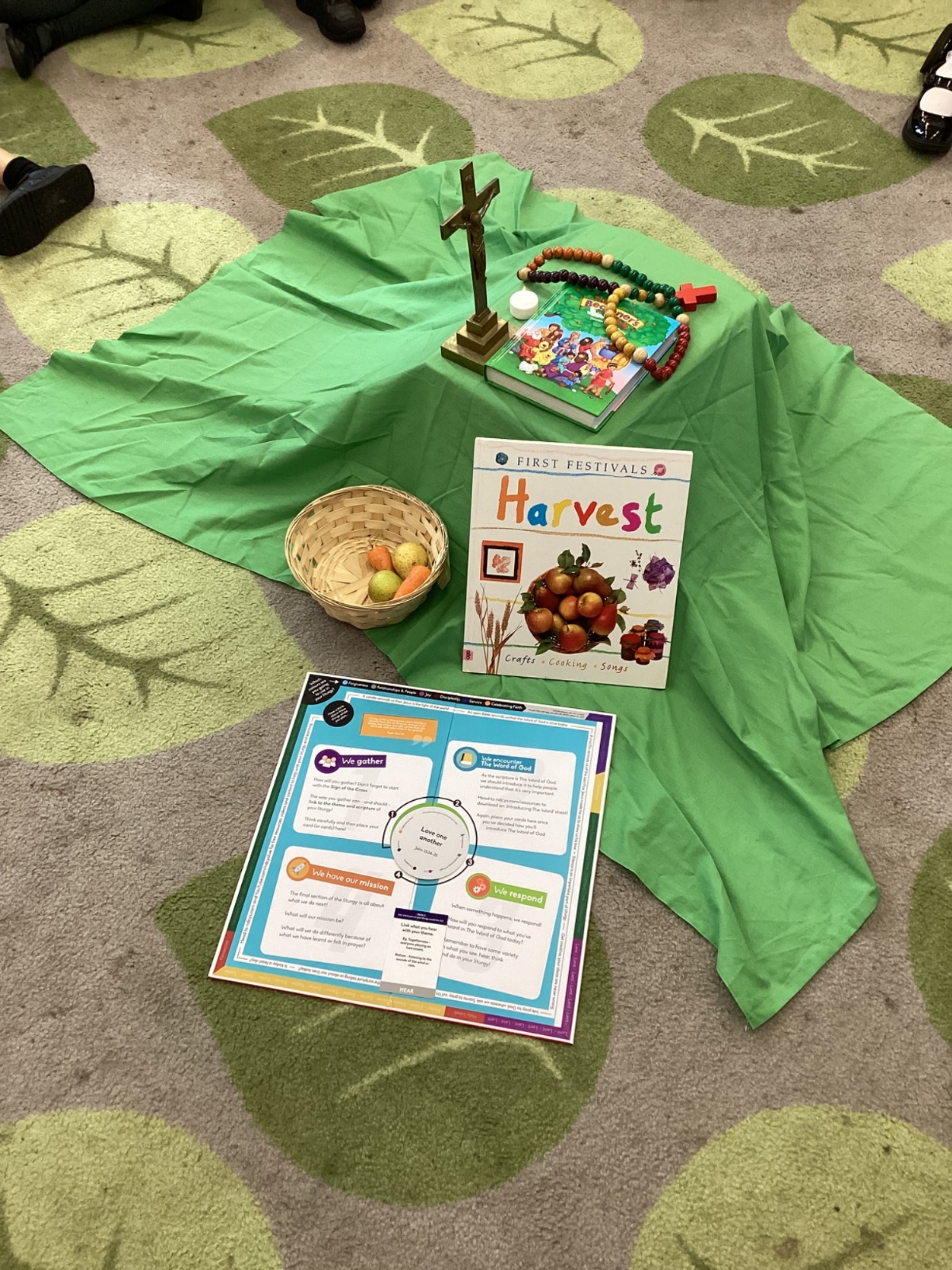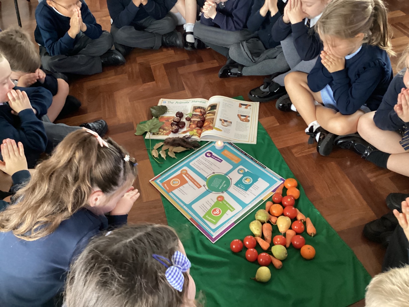 Class 4 took part in a Harvest Festival themed collective worship session. We shared prayers of thanks and explored how we can thank God for the Creation of the world.