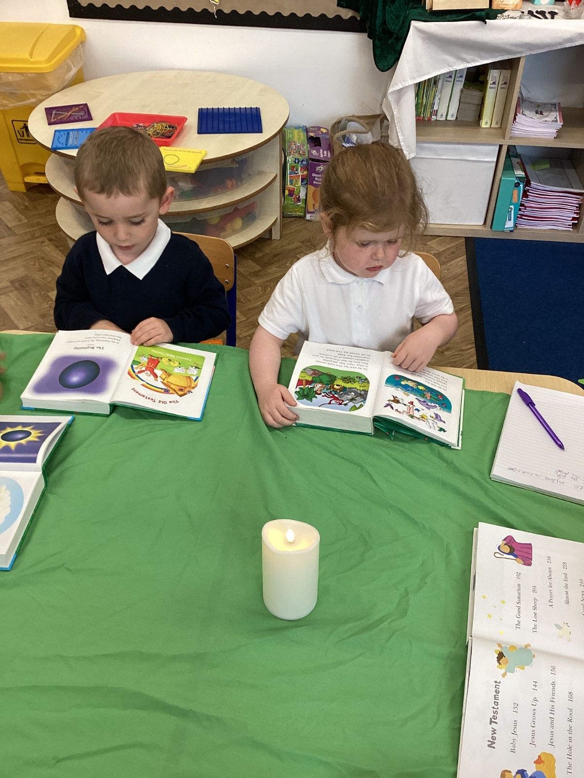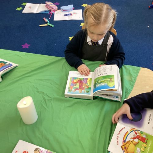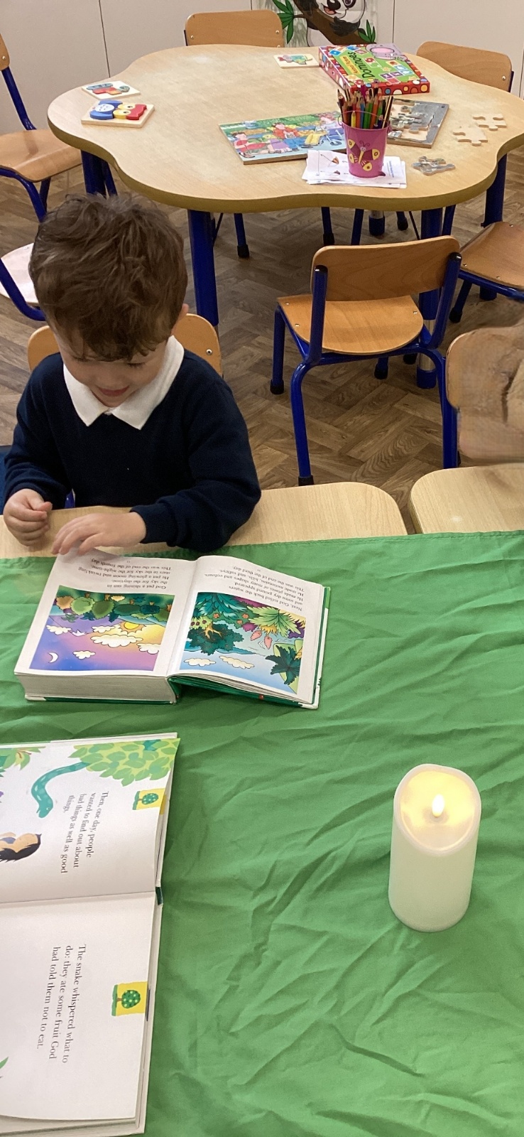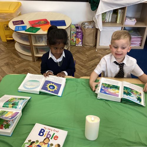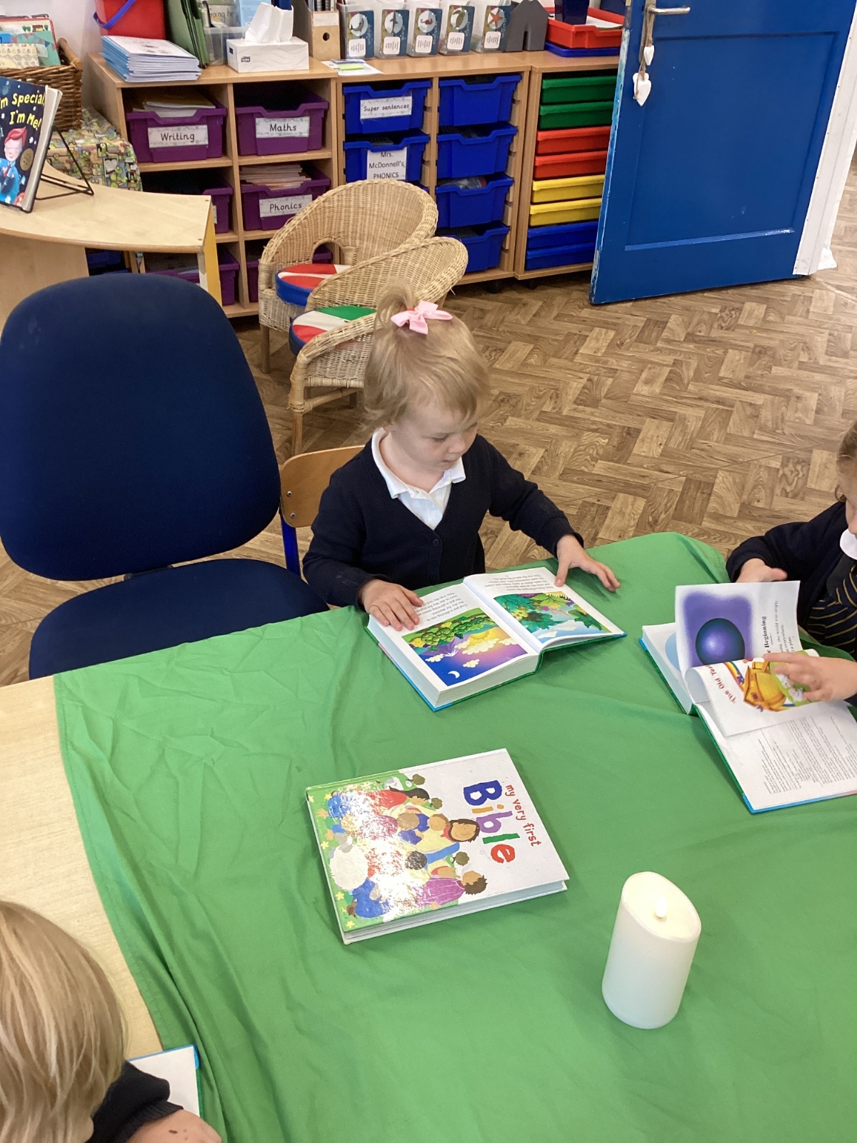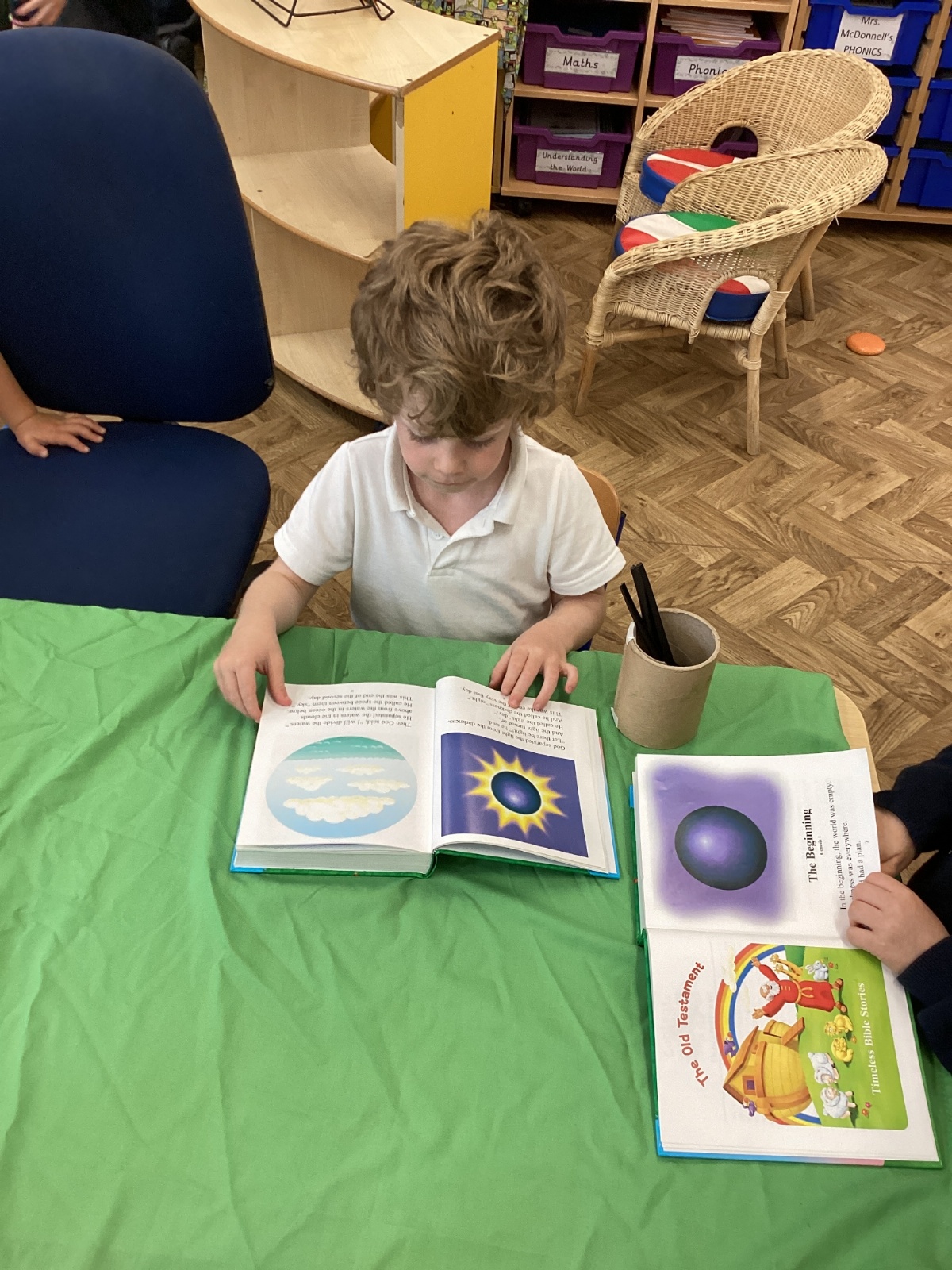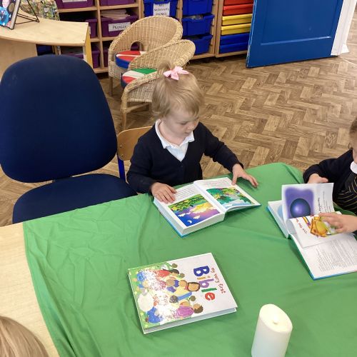 We talked about God's special book, the Bible and we looked at images from the story of Creation. We talked about how it is everyone's job to look after our planet and learned a song about Stewardship.