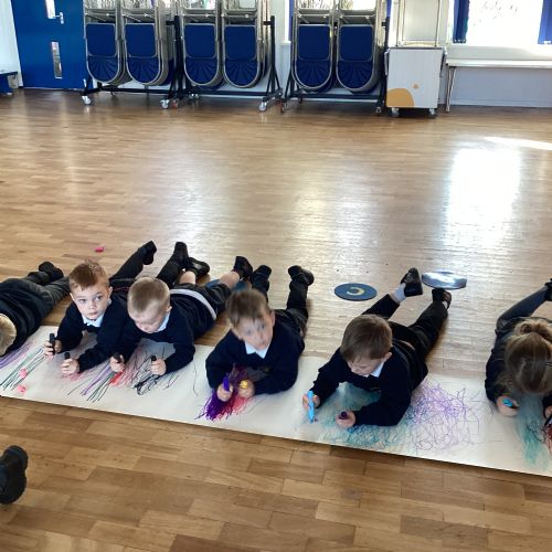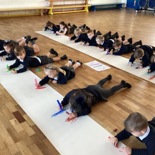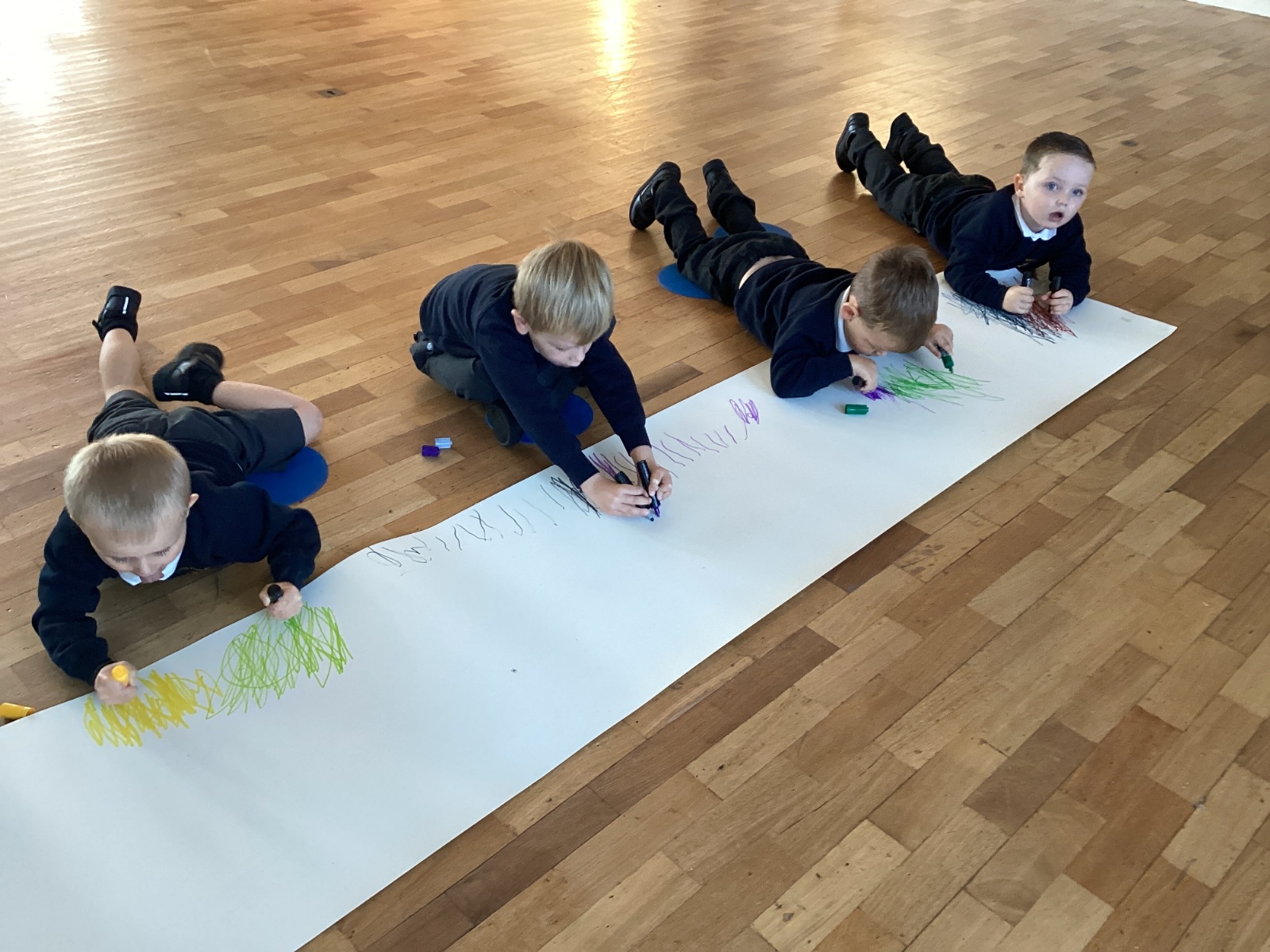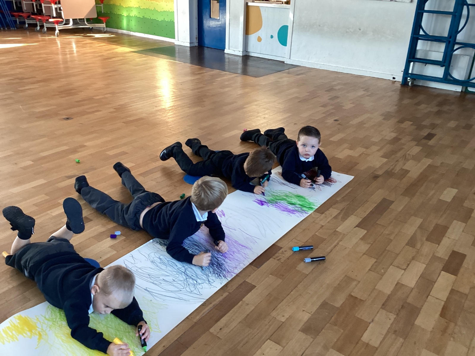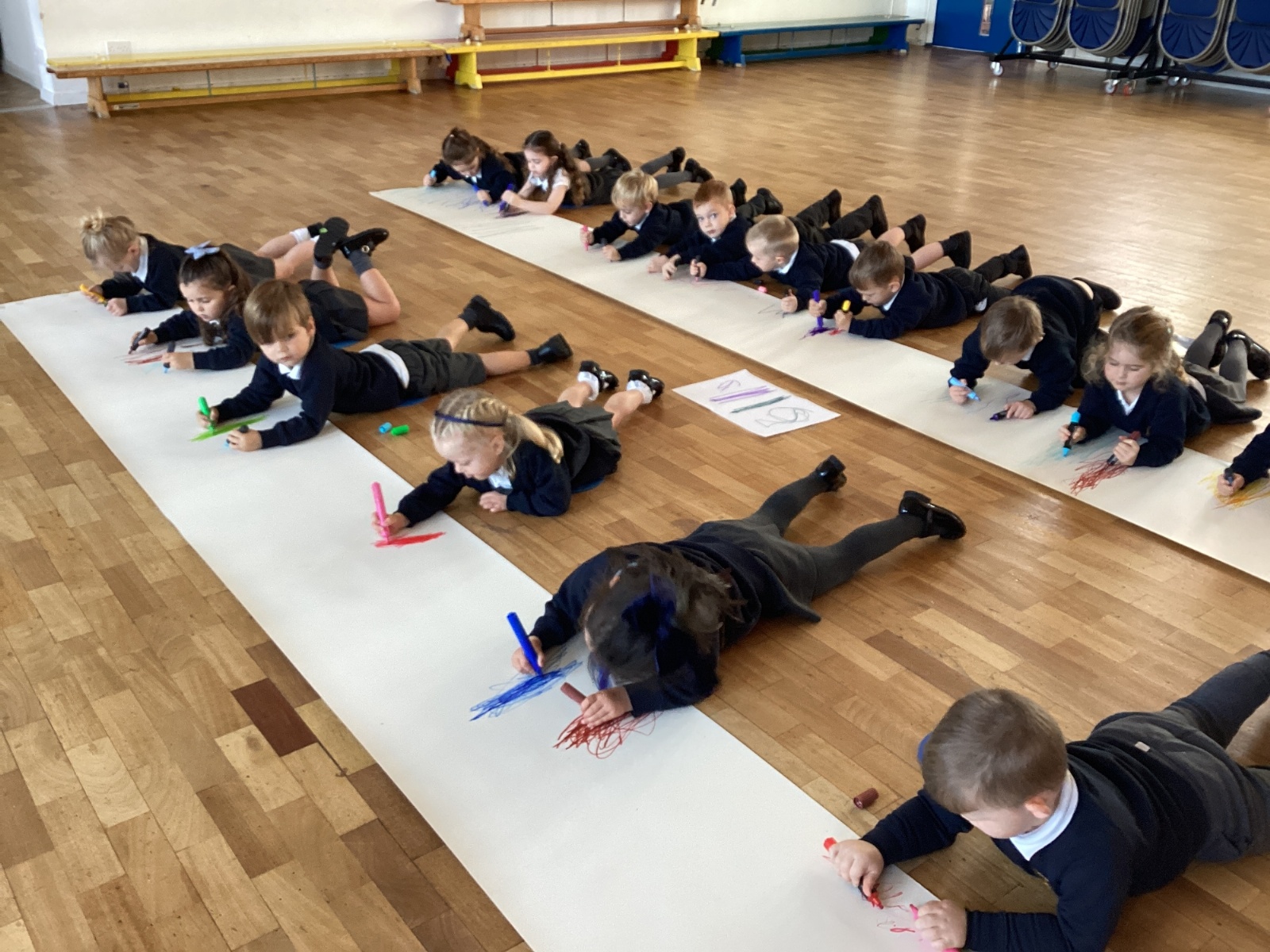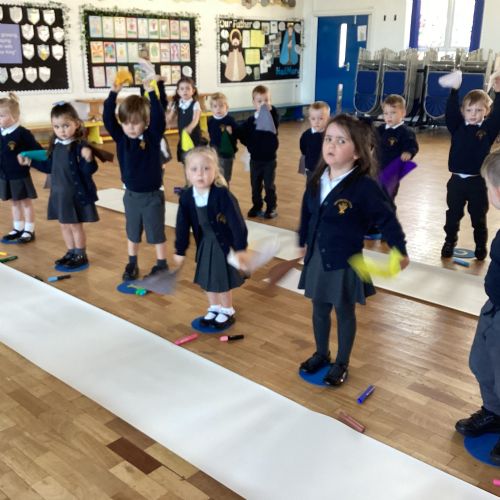 The children have enjoyed taking part in squiggle whilst you wiggle. Using our flipper flappers in both hands while making movements with our arms up and down and side to side. This helps with writing the letters i,l,t. Once we have danced we make these movements on paper holding a pen in both hands.