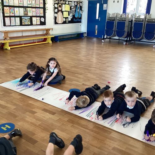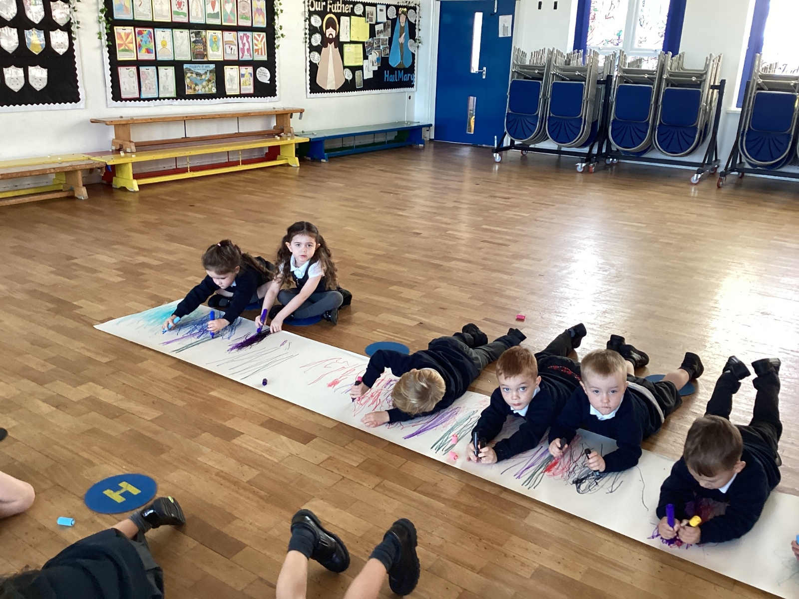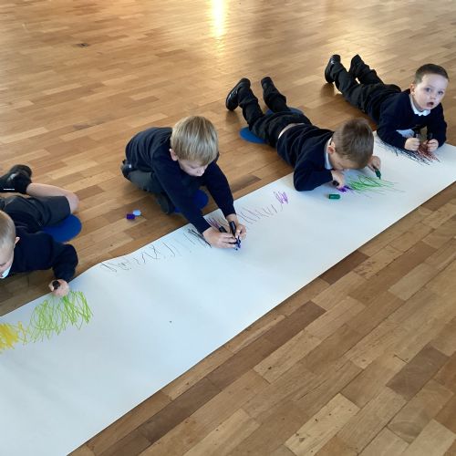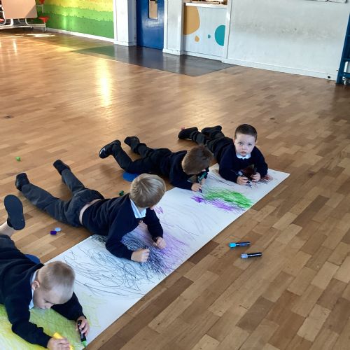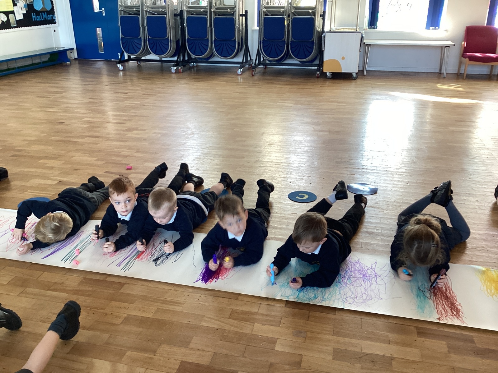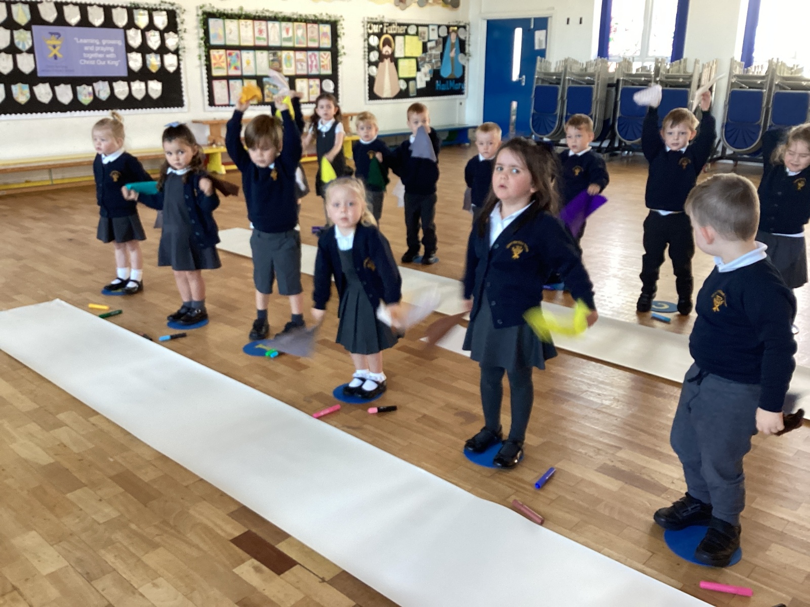 The children have enjoyed taking part in squiggle whilst you wiggle. Using our flipper flappers in both hands while making movements with our arms up and down and side to side. This helps with writing the letters i,l,t. Once we have danced we make these movements on paper holding a pen in both hands.