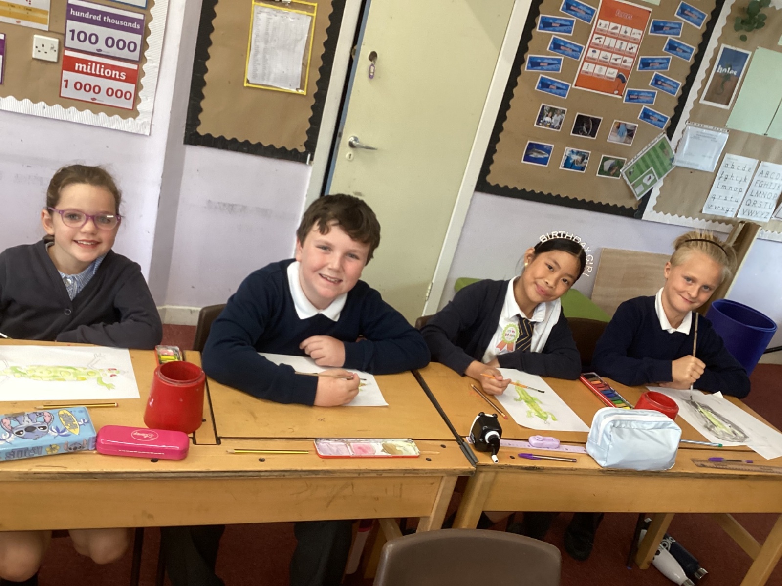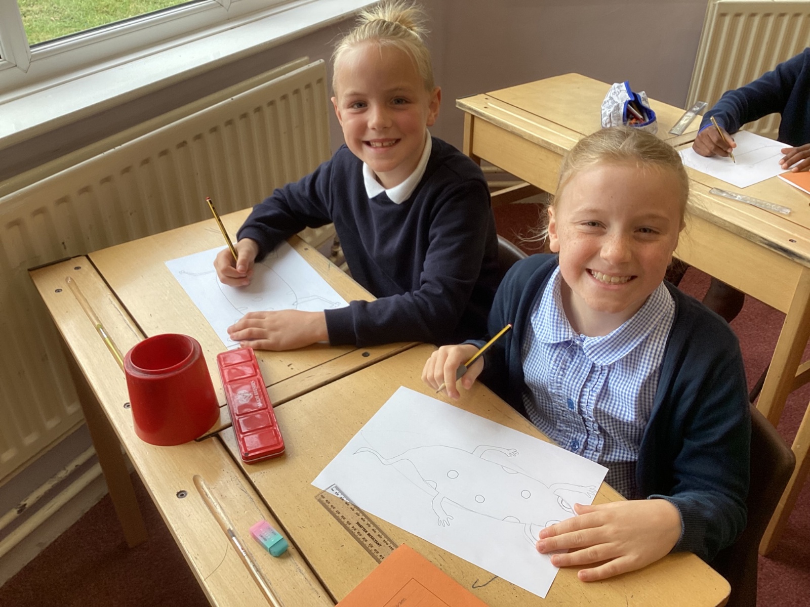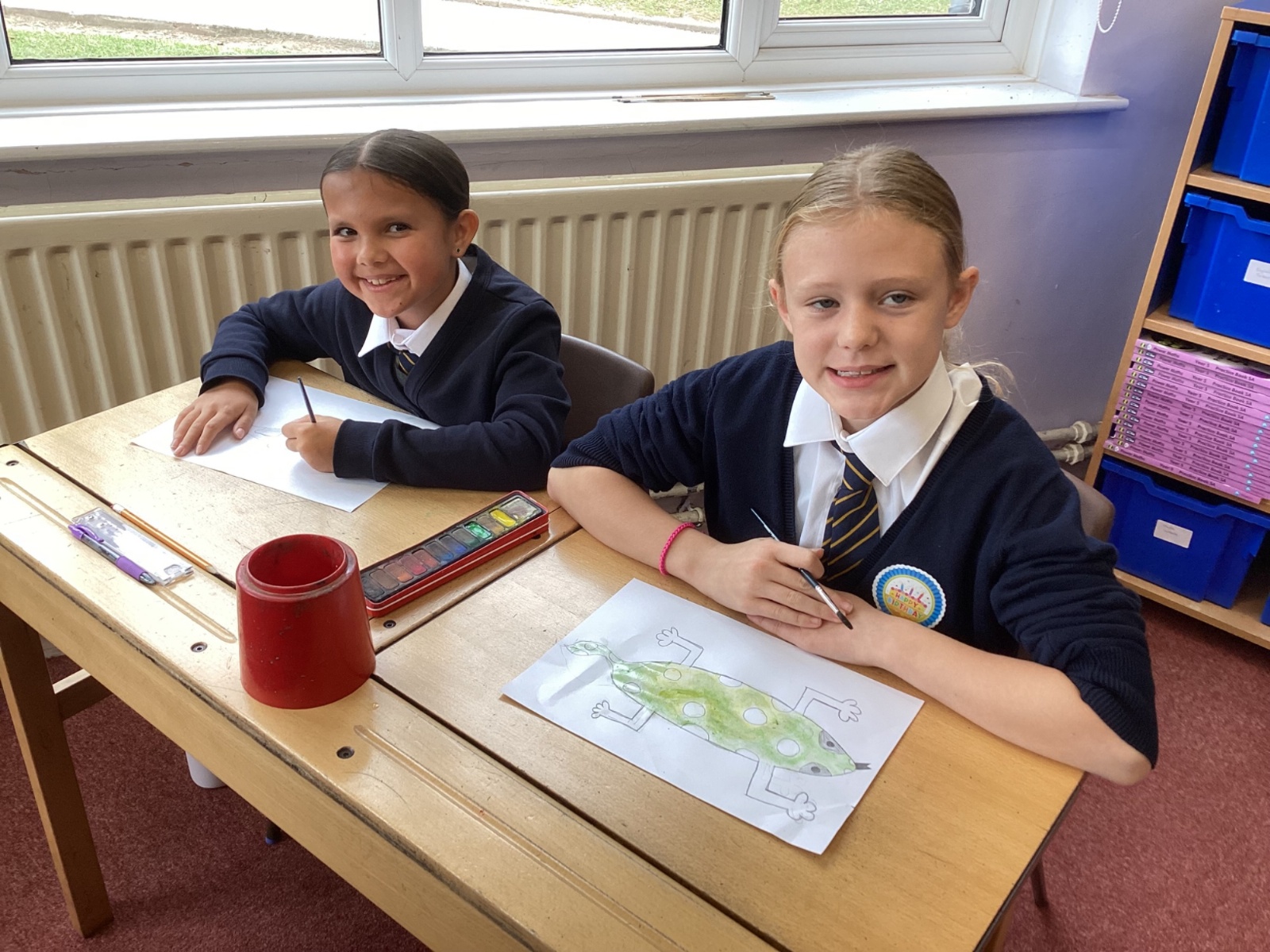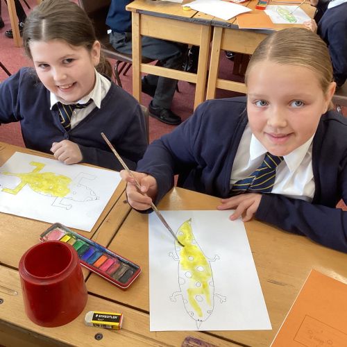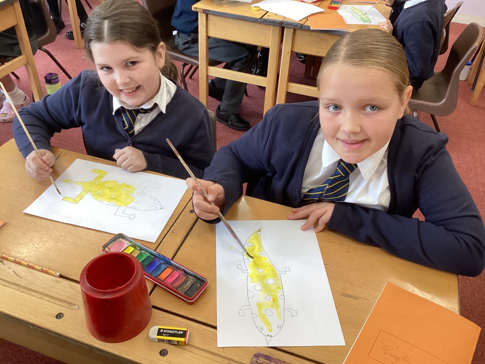 We used pencil and watercolour paint to create our own yellow spotted lizards, inspired by our reading of Holes.