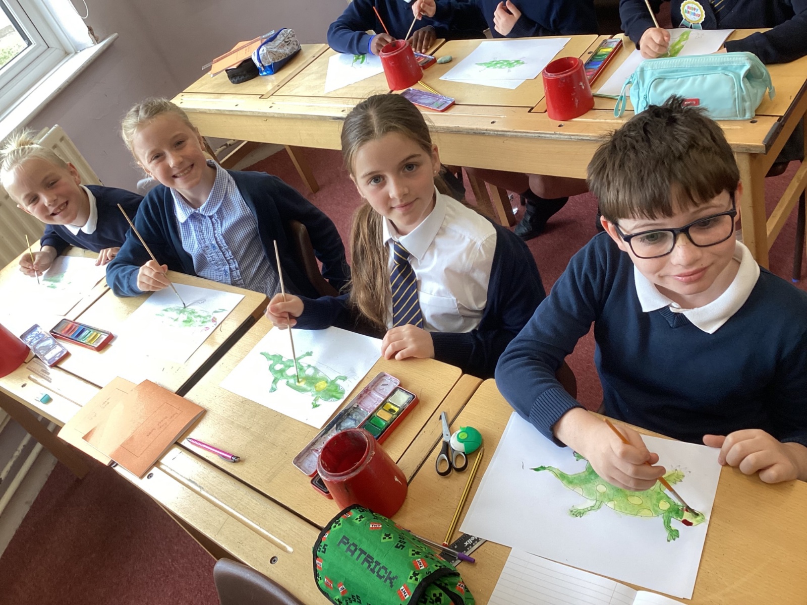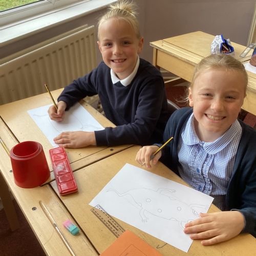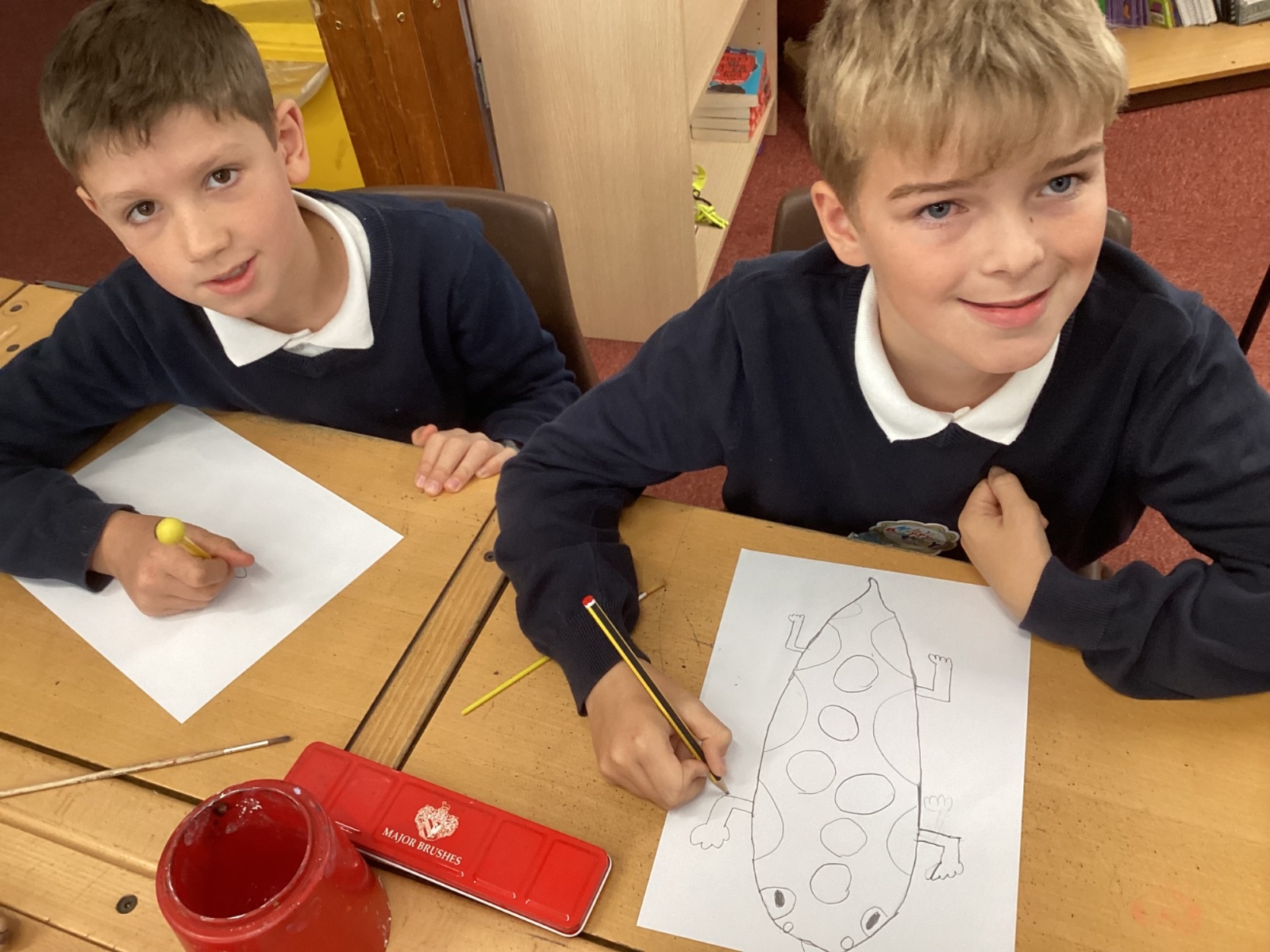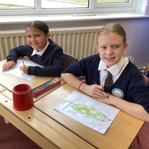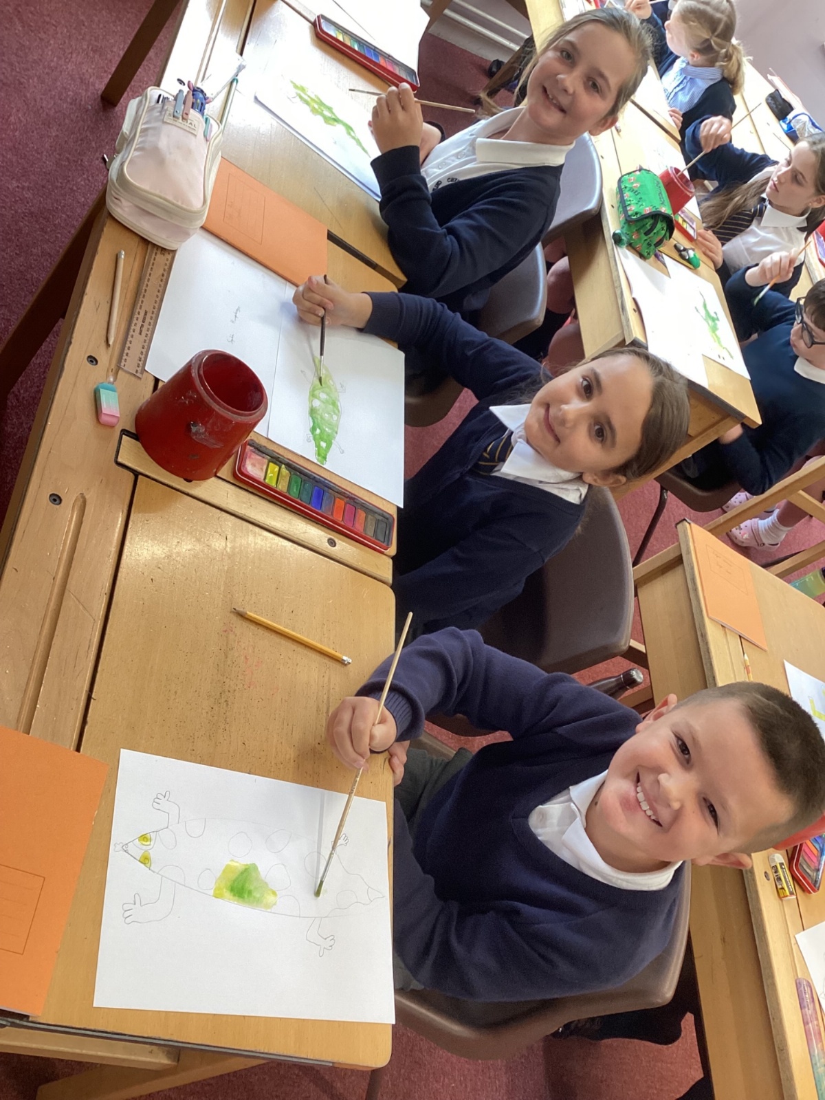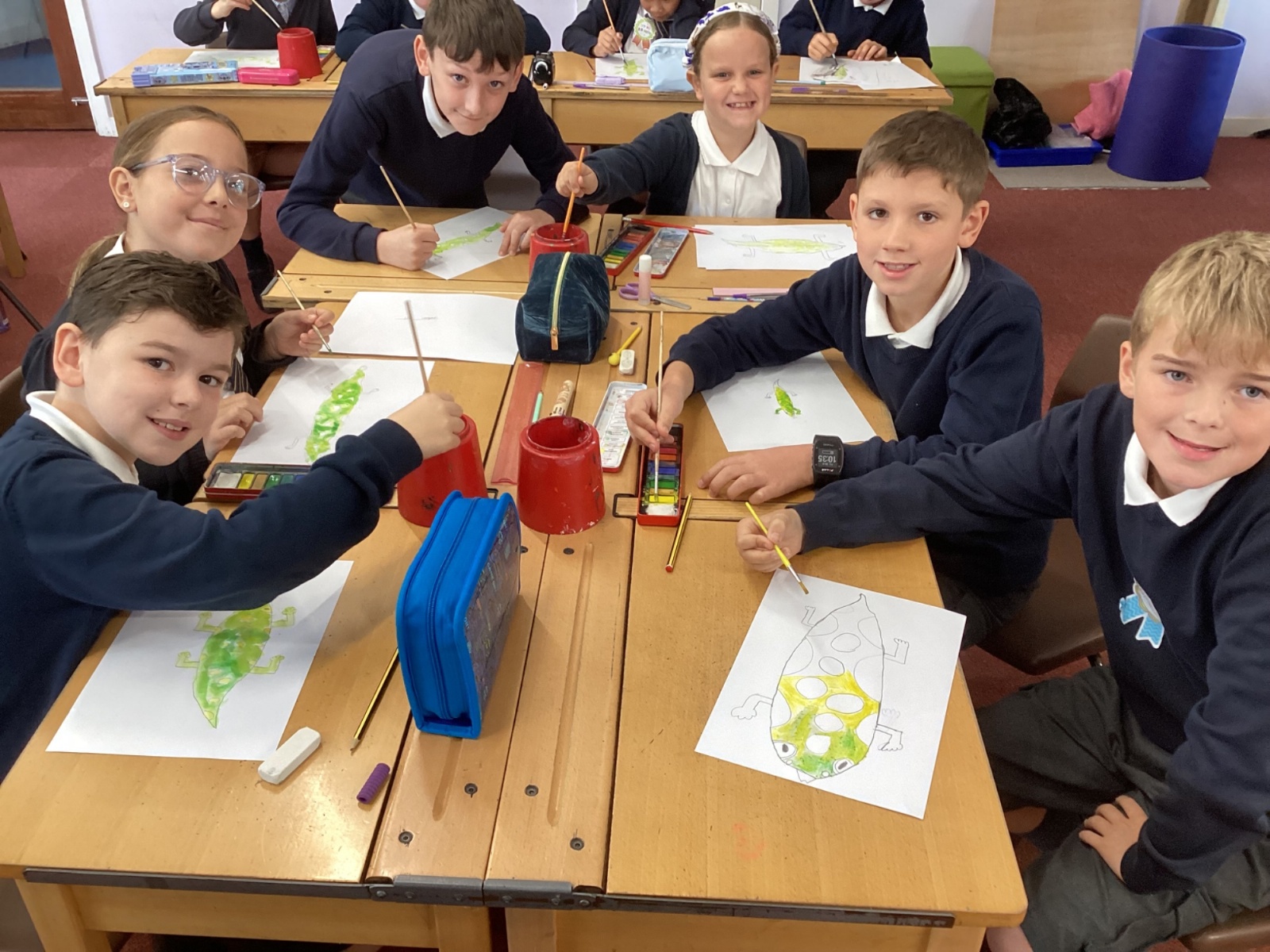 We used pencil and watercolour paint to create our own yellow spotted lizards, inspired by our reading of Holes.