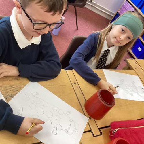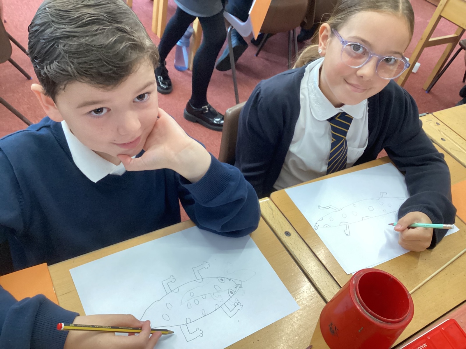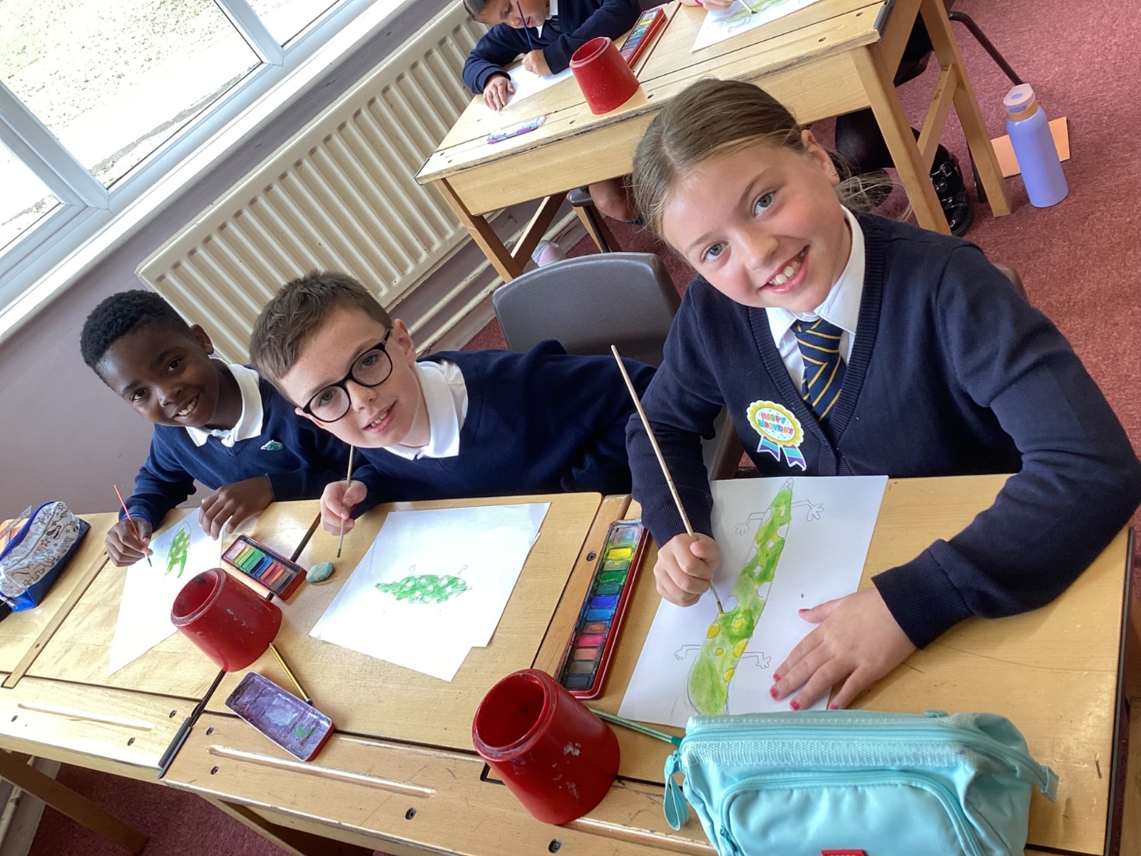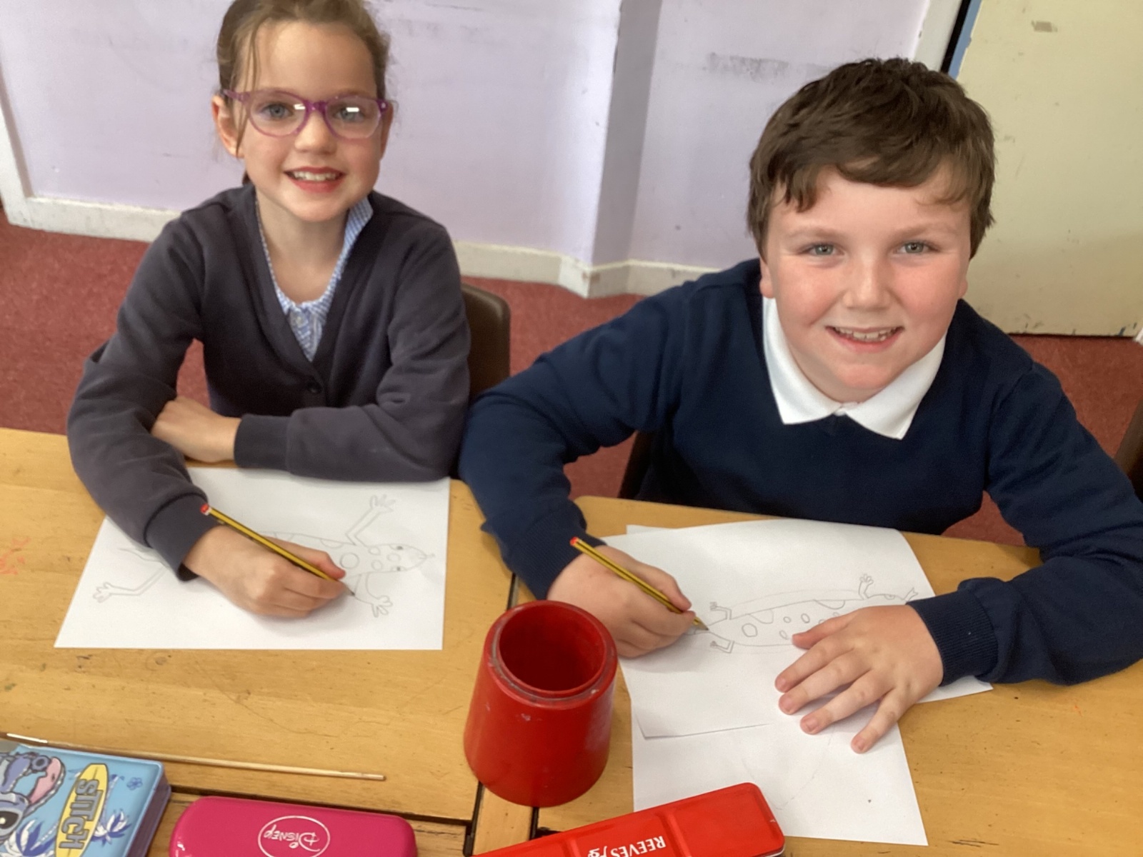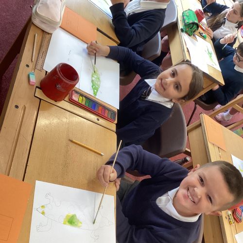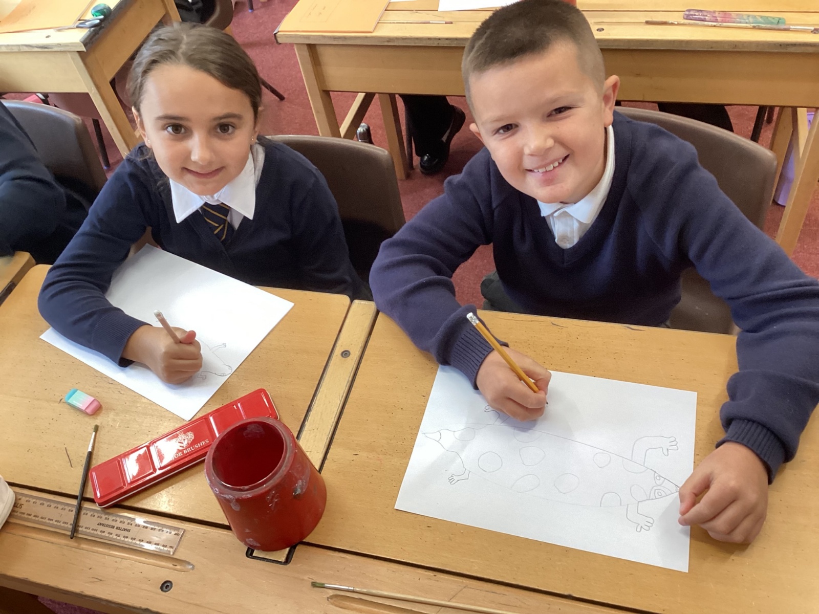 We used pencil and watercolour paint to create our own yellow spotted lizards, inspired by our reading of Holes.