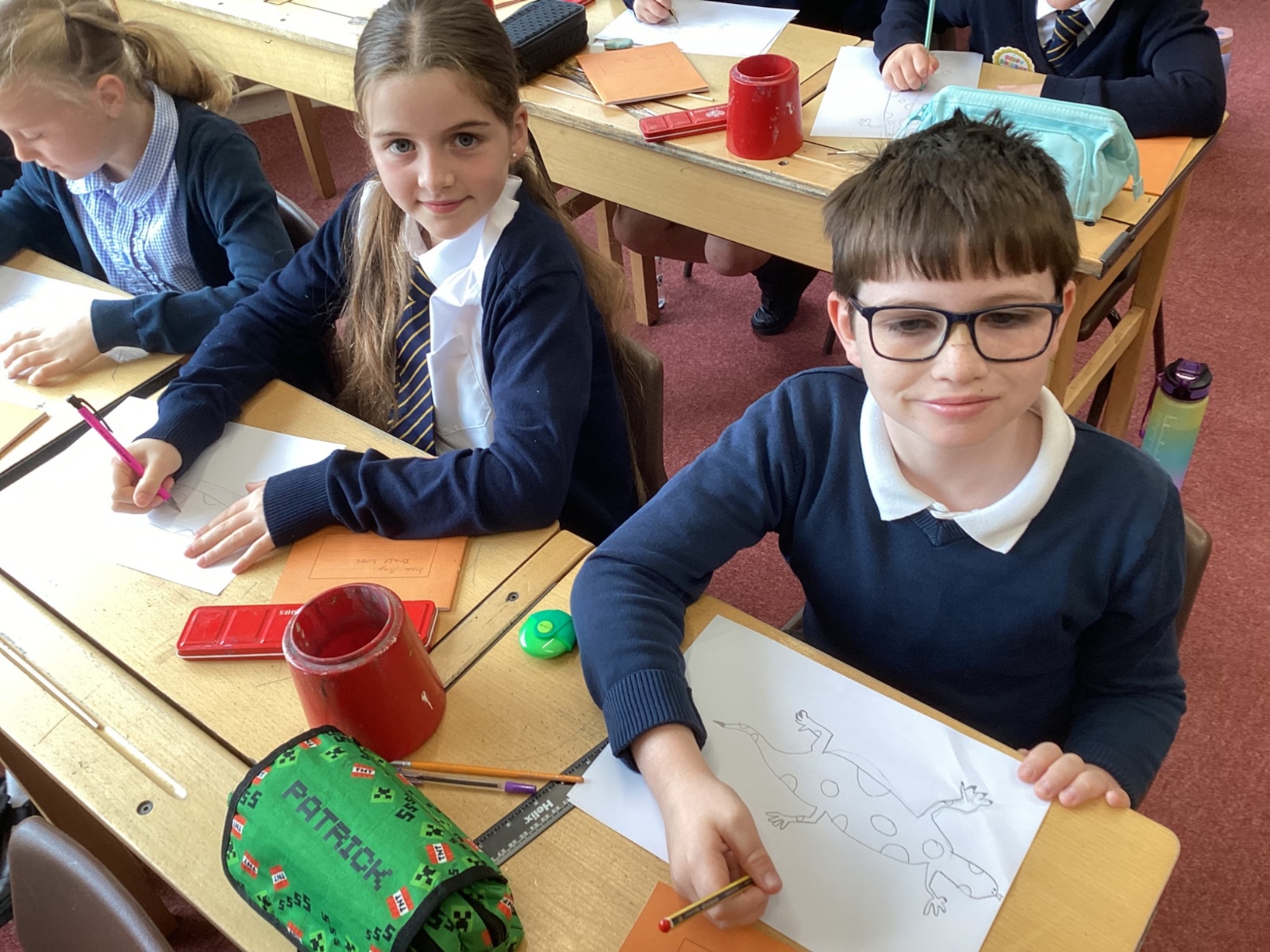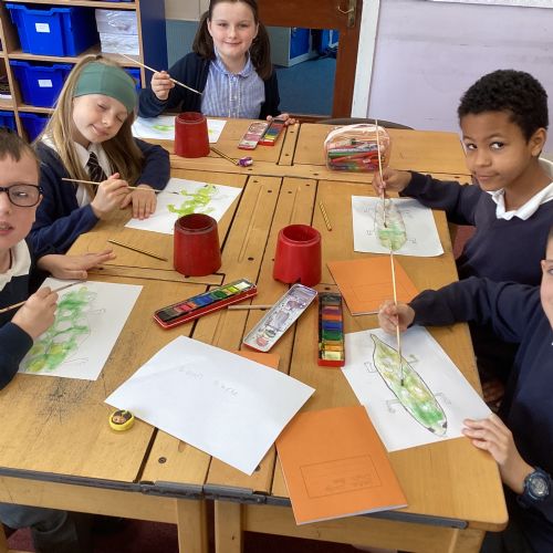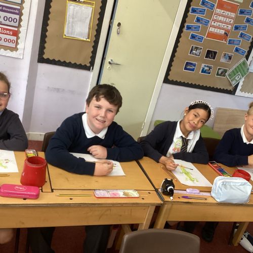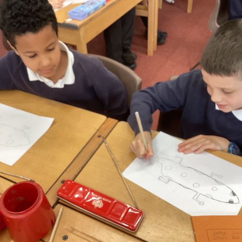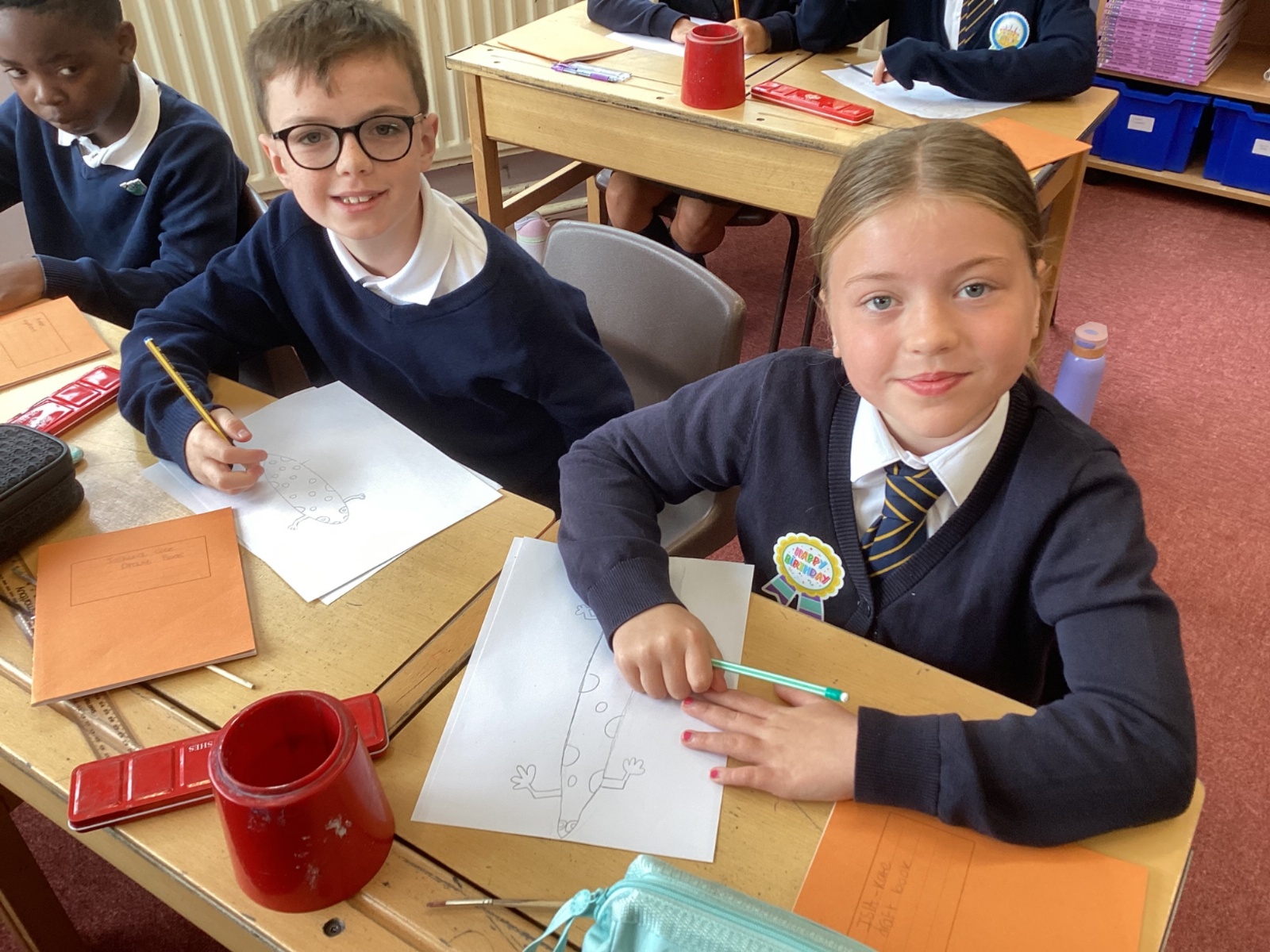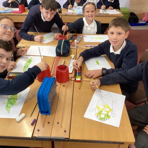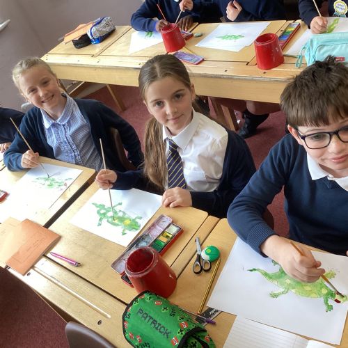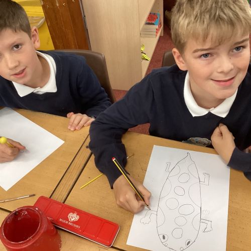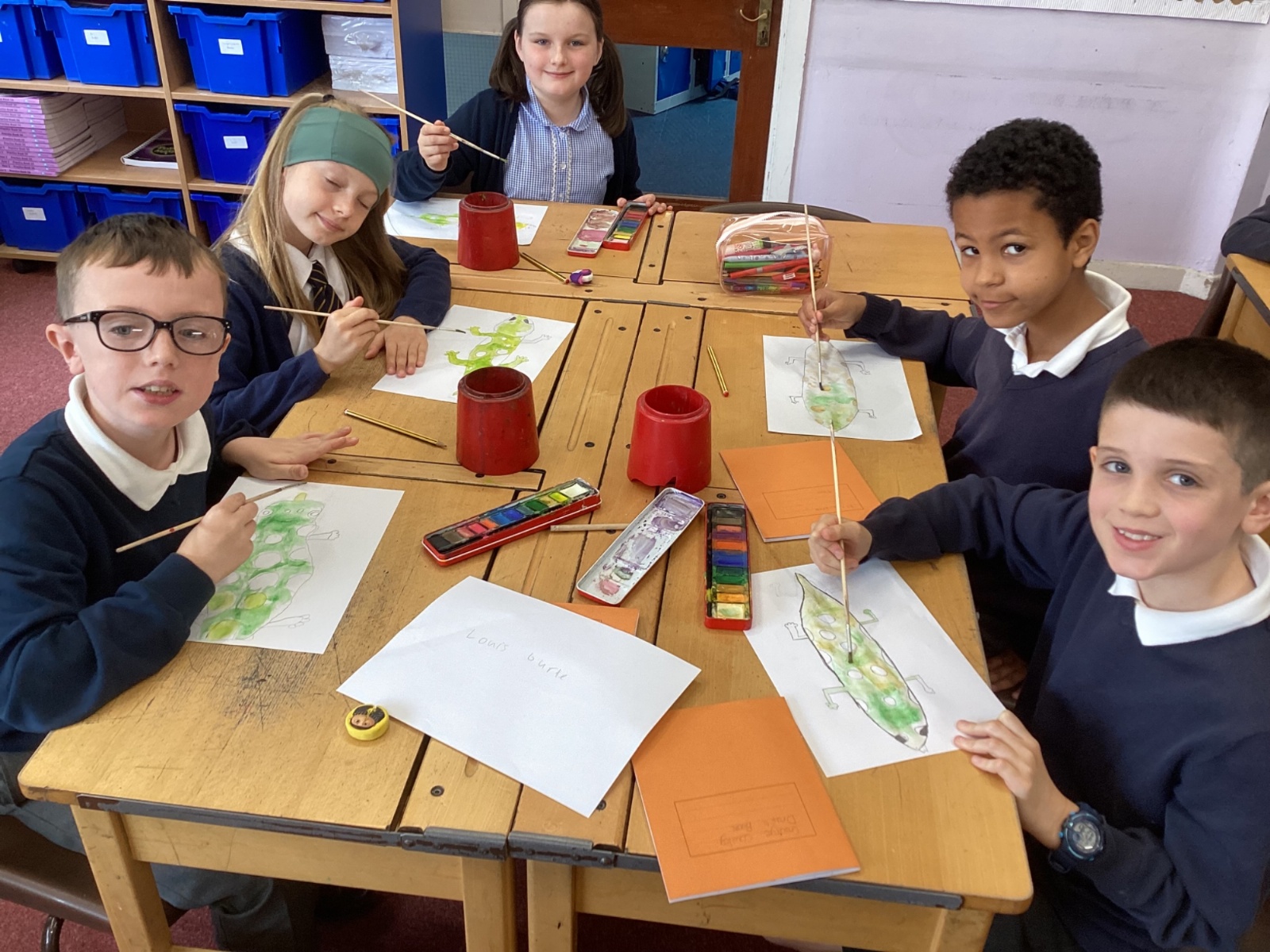 We used pencil and watercolour paint to create our own yellow spotted lizards, inspired by our reading of Holes.