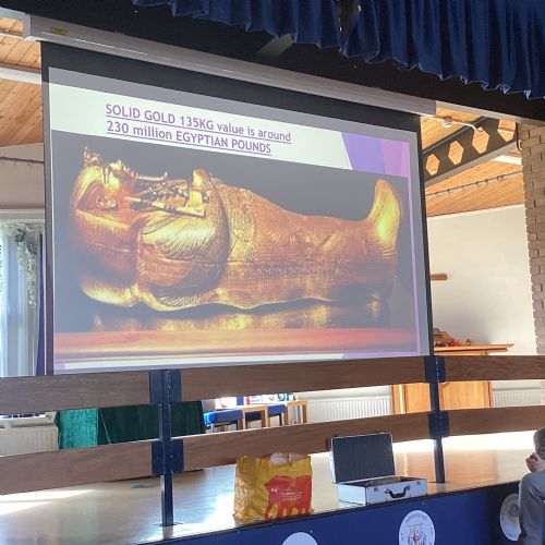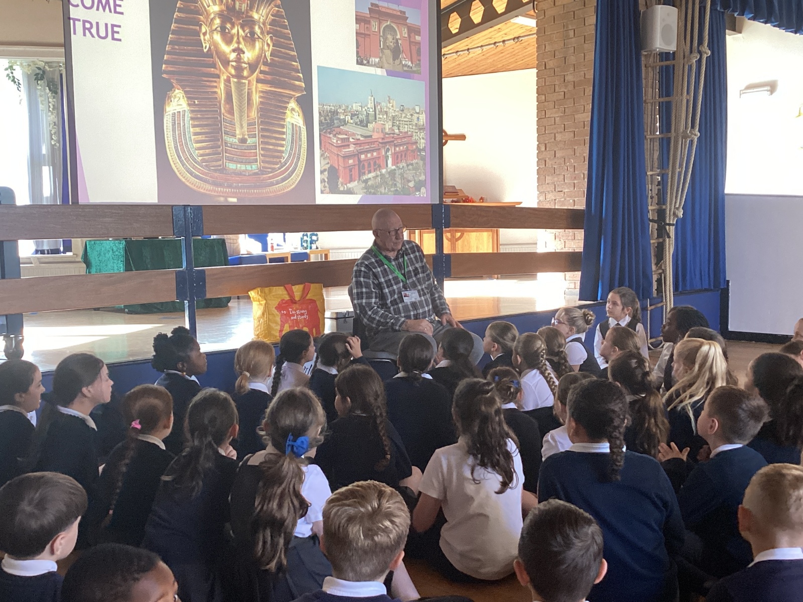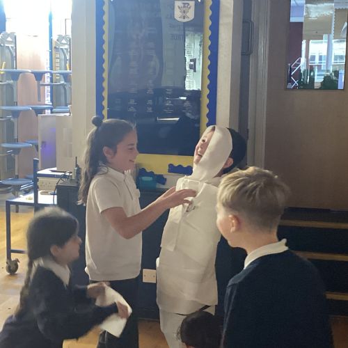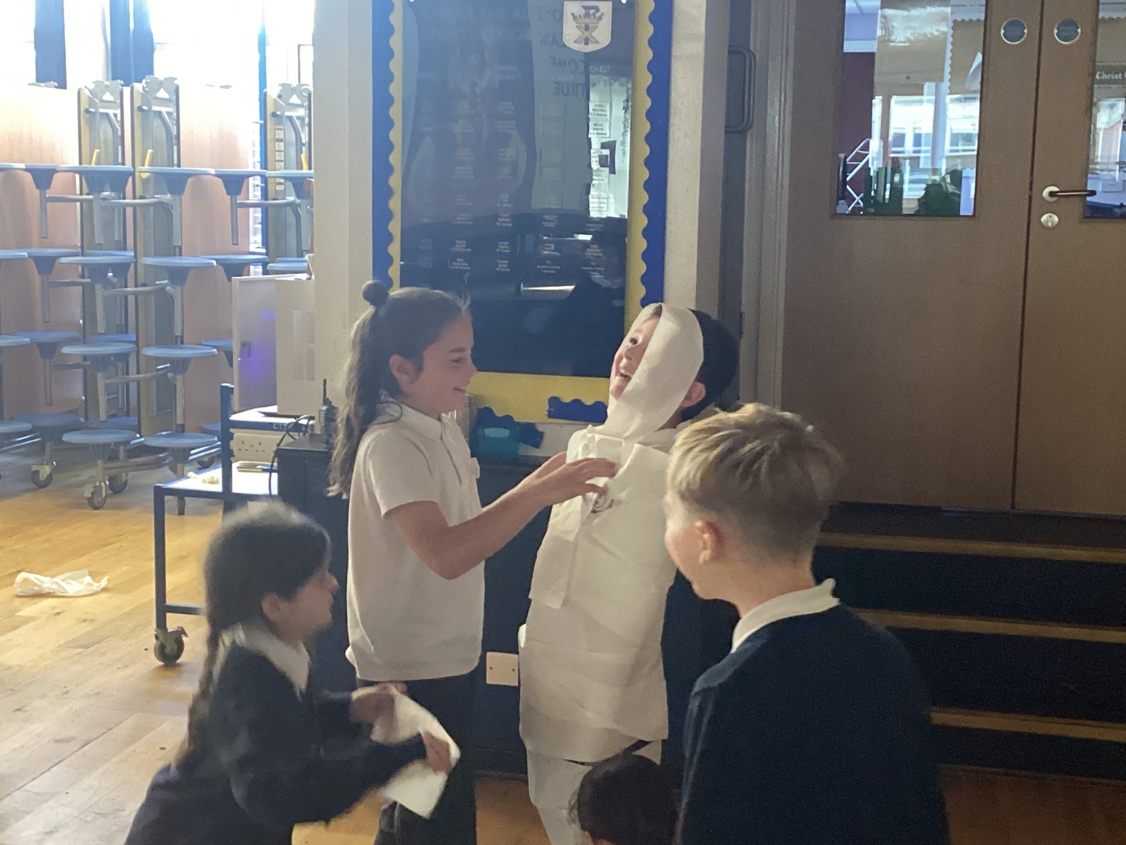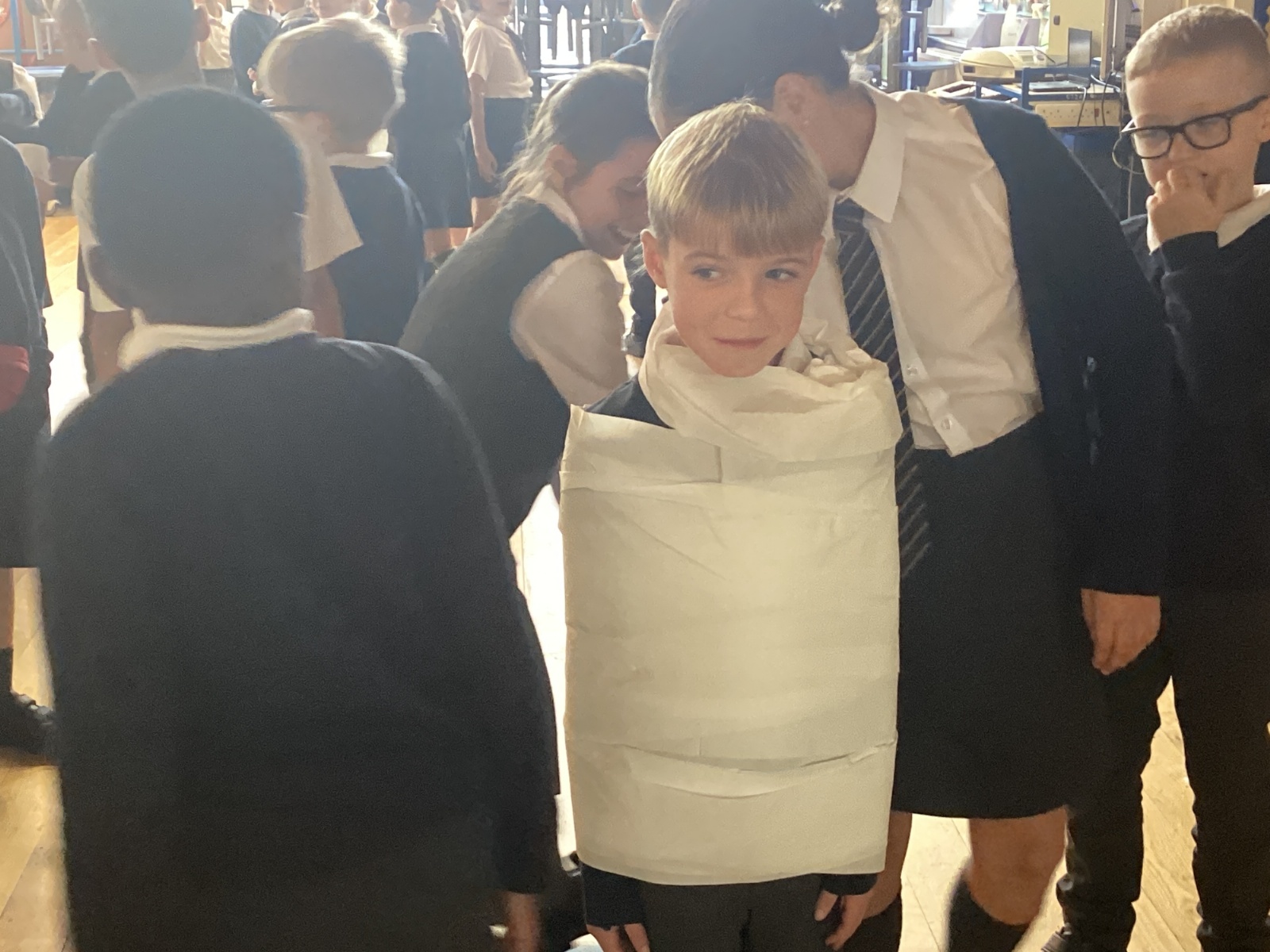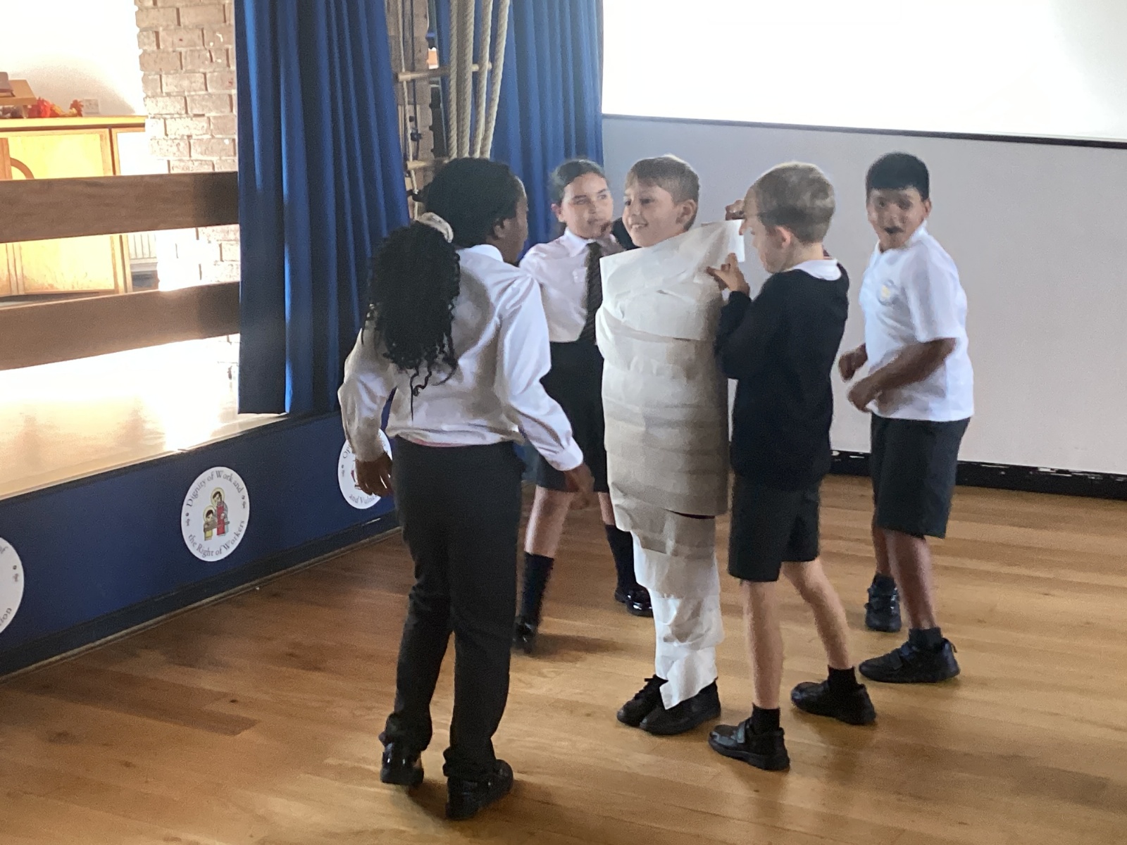 Today, Mr Egypt came into school to teach us all about the Ancient Egyptians and how they lived and died.  It was very interesting.  We were able to hold some ancient artifacts, including a coin once held by Alexander the Great!!  We did an Egyptian dance and mummified some of our friends.
