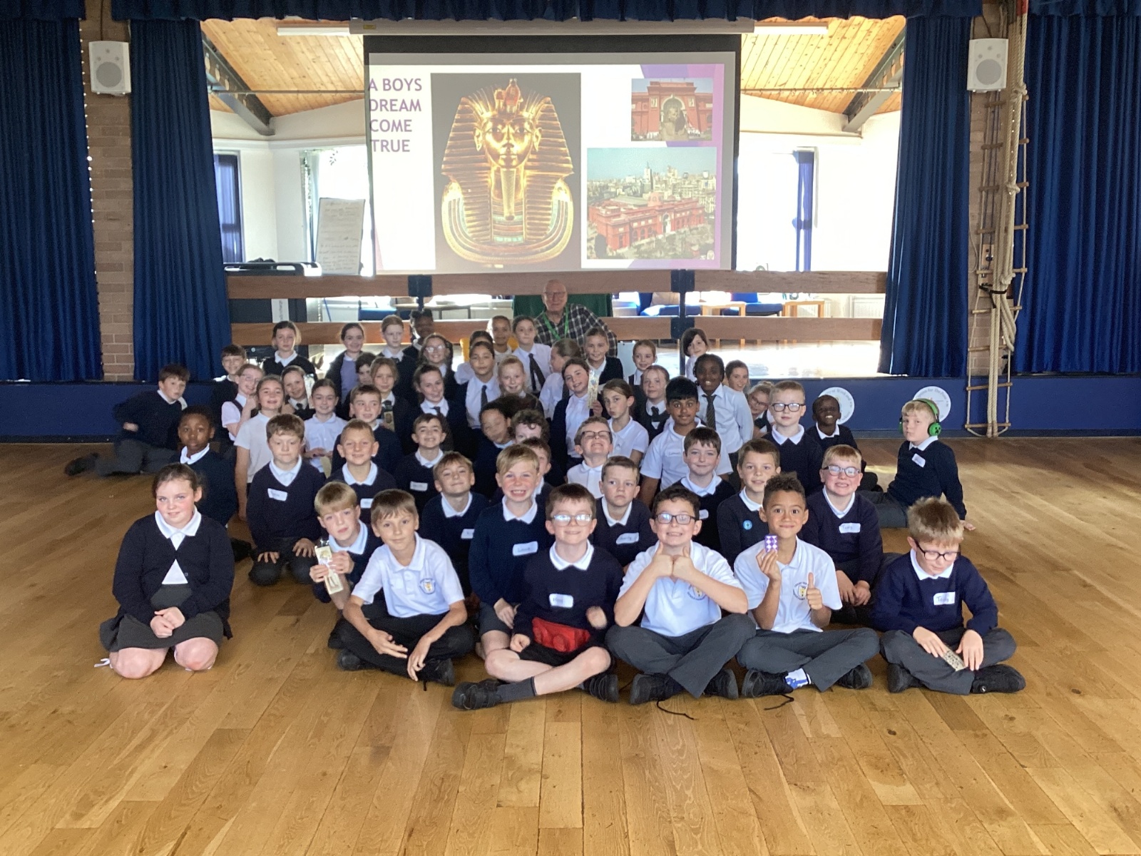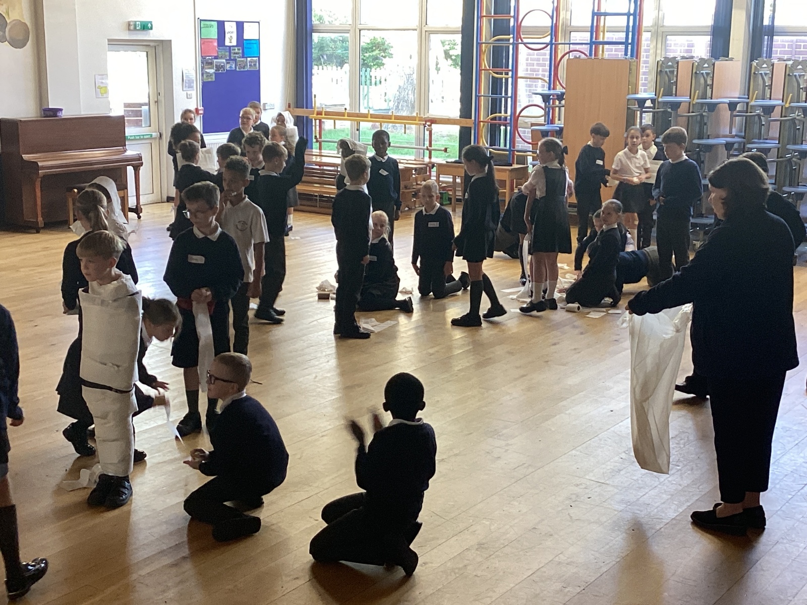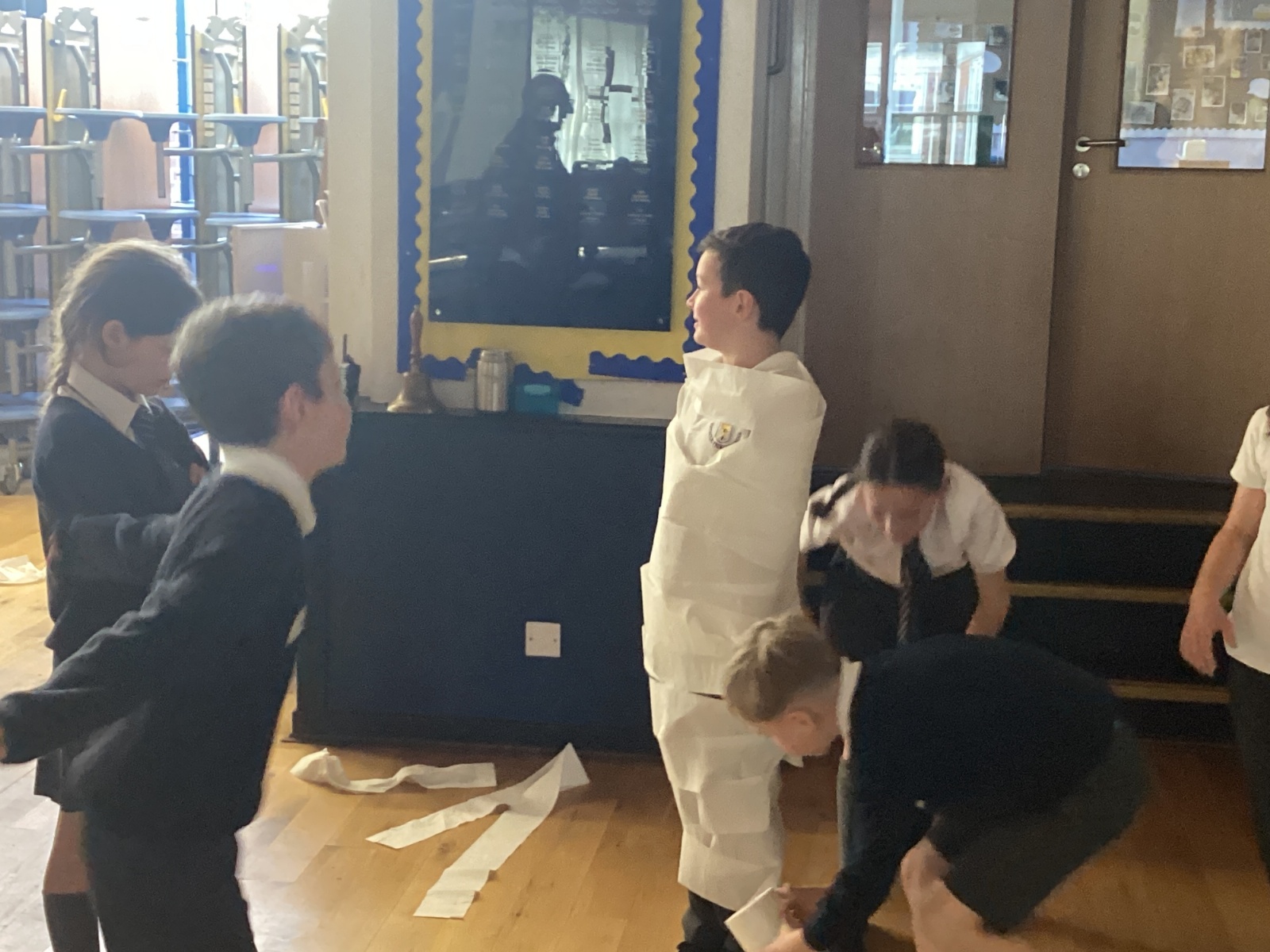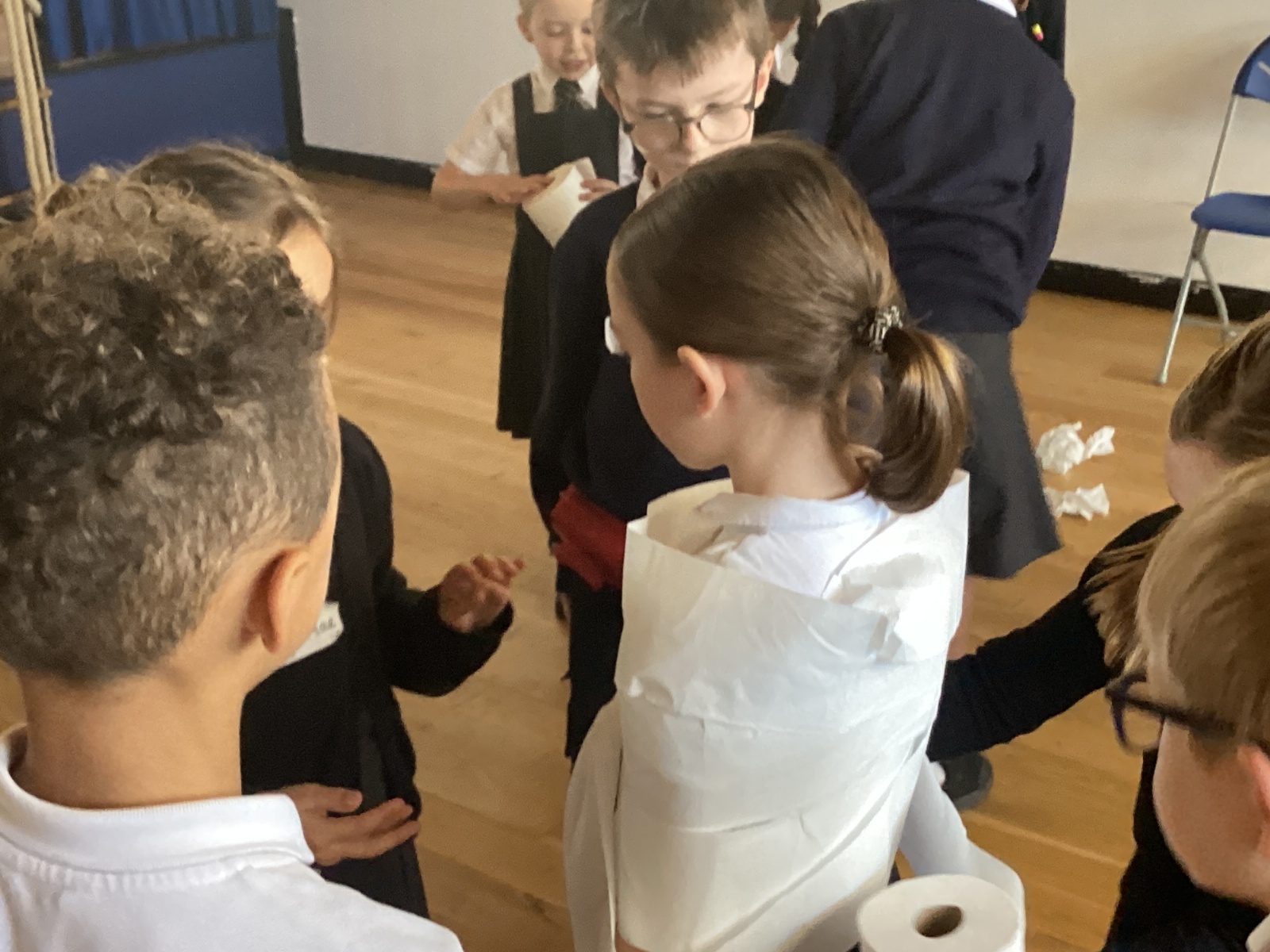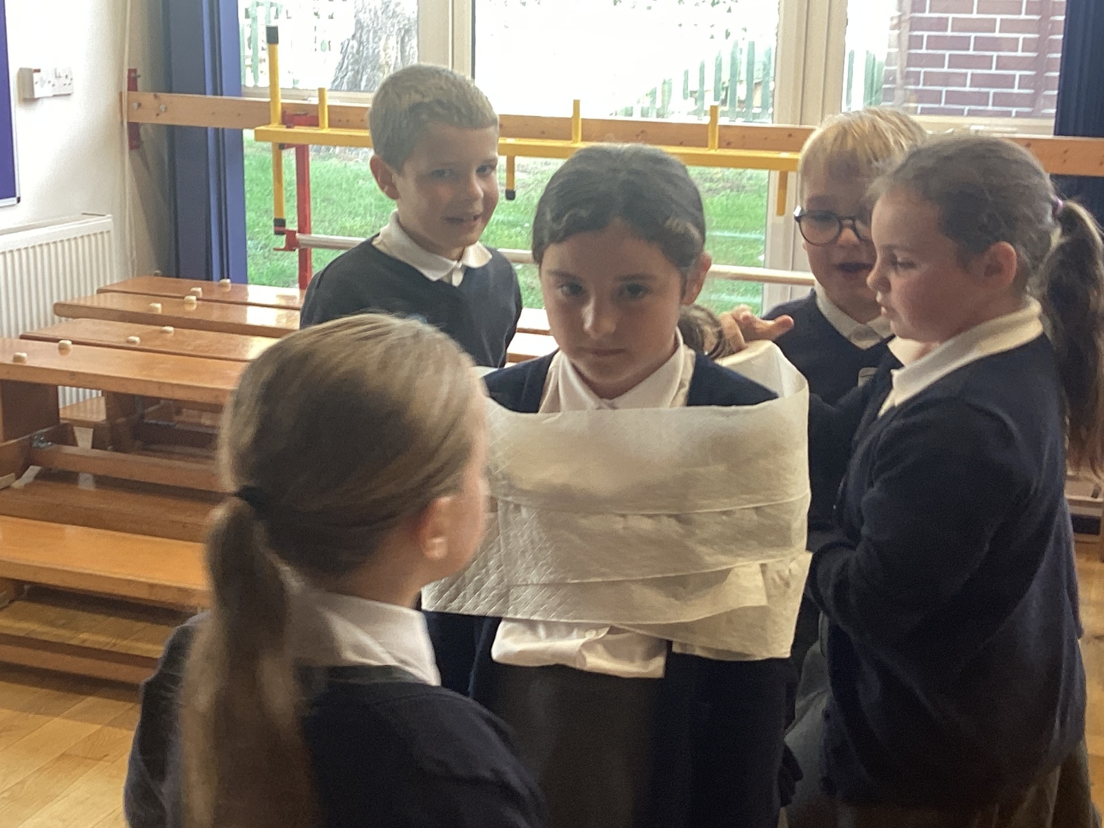 Today, Mr Egypt came into school to teach us all about the Ancient Egyptians and how they lived and died.  It was very interesting.  We were able to hold some ancient artifacts, including a coin once held by Alexander the Great!!  We did an Egyptian dance and mummified some of our friends.