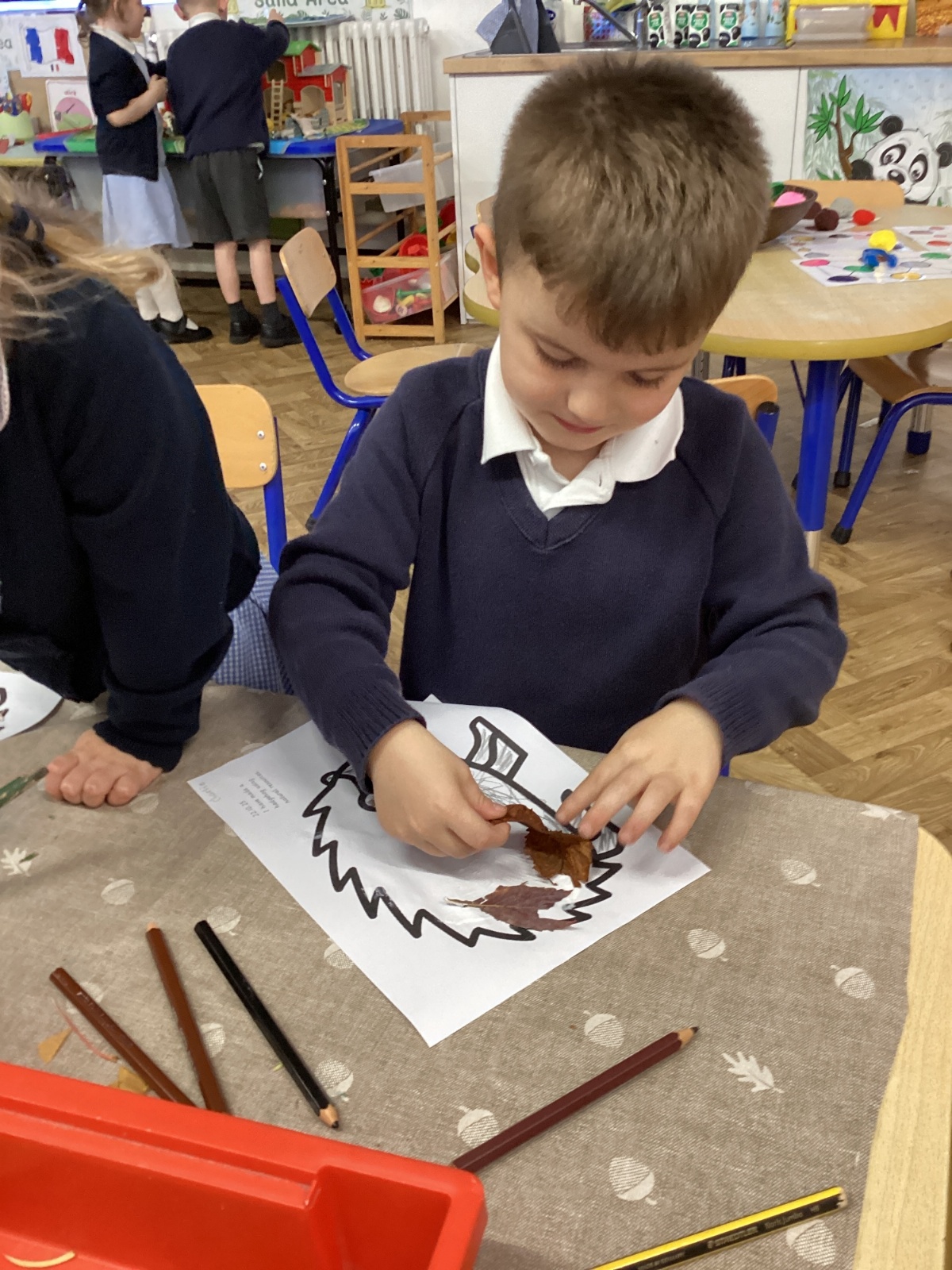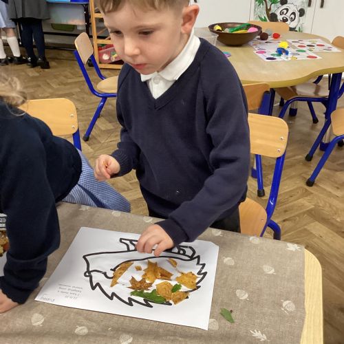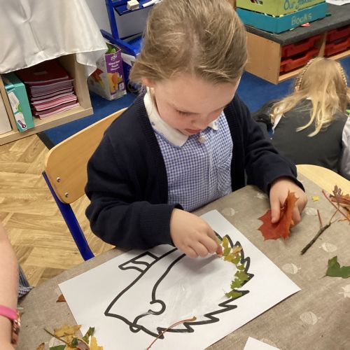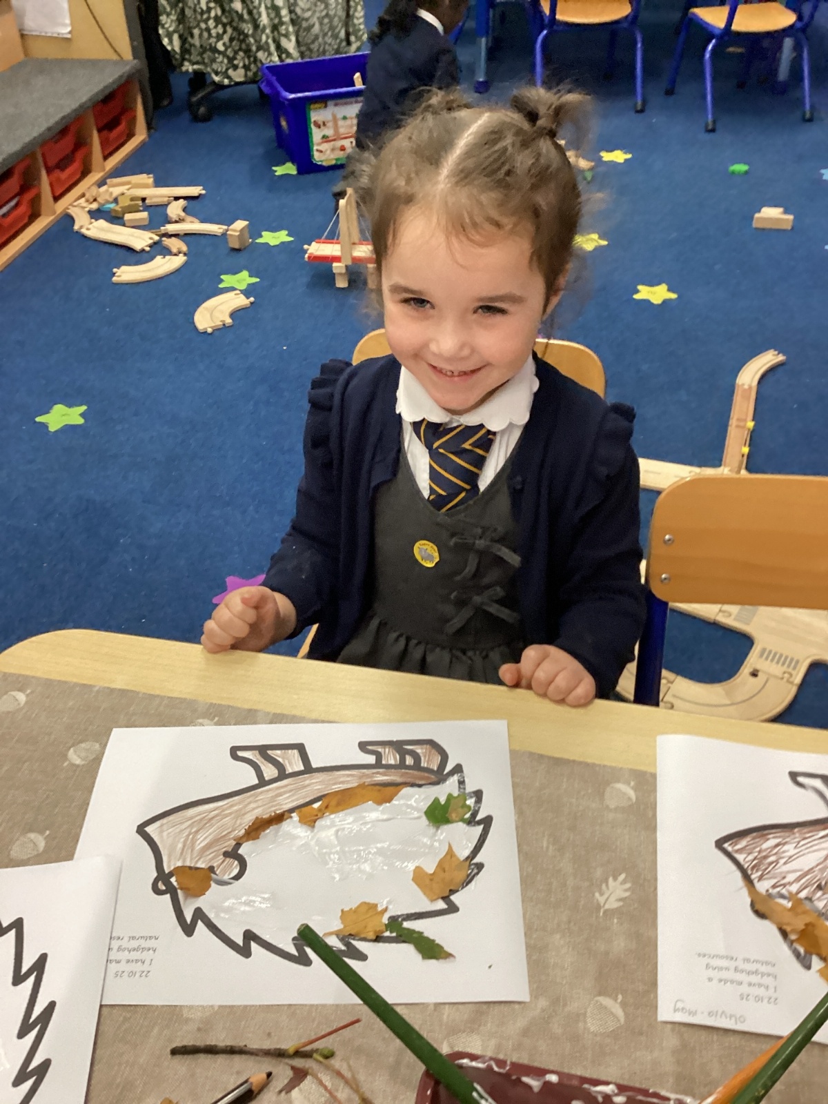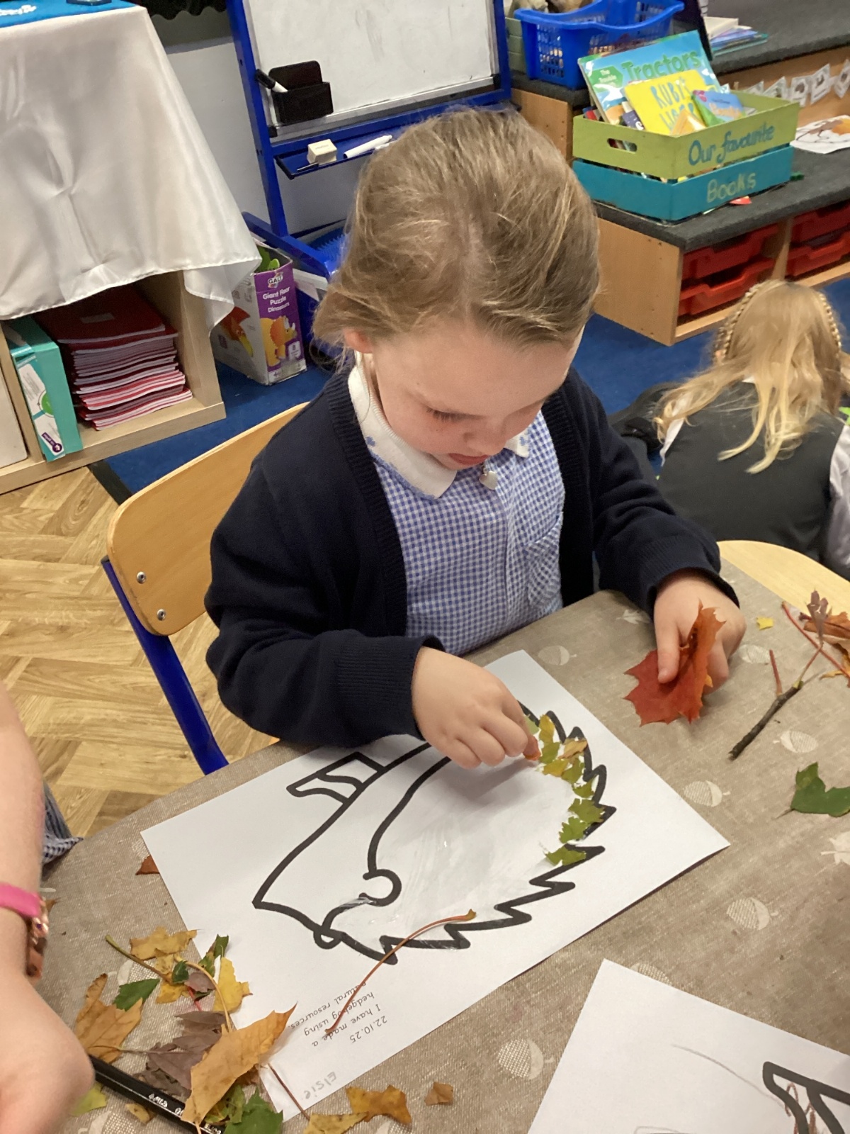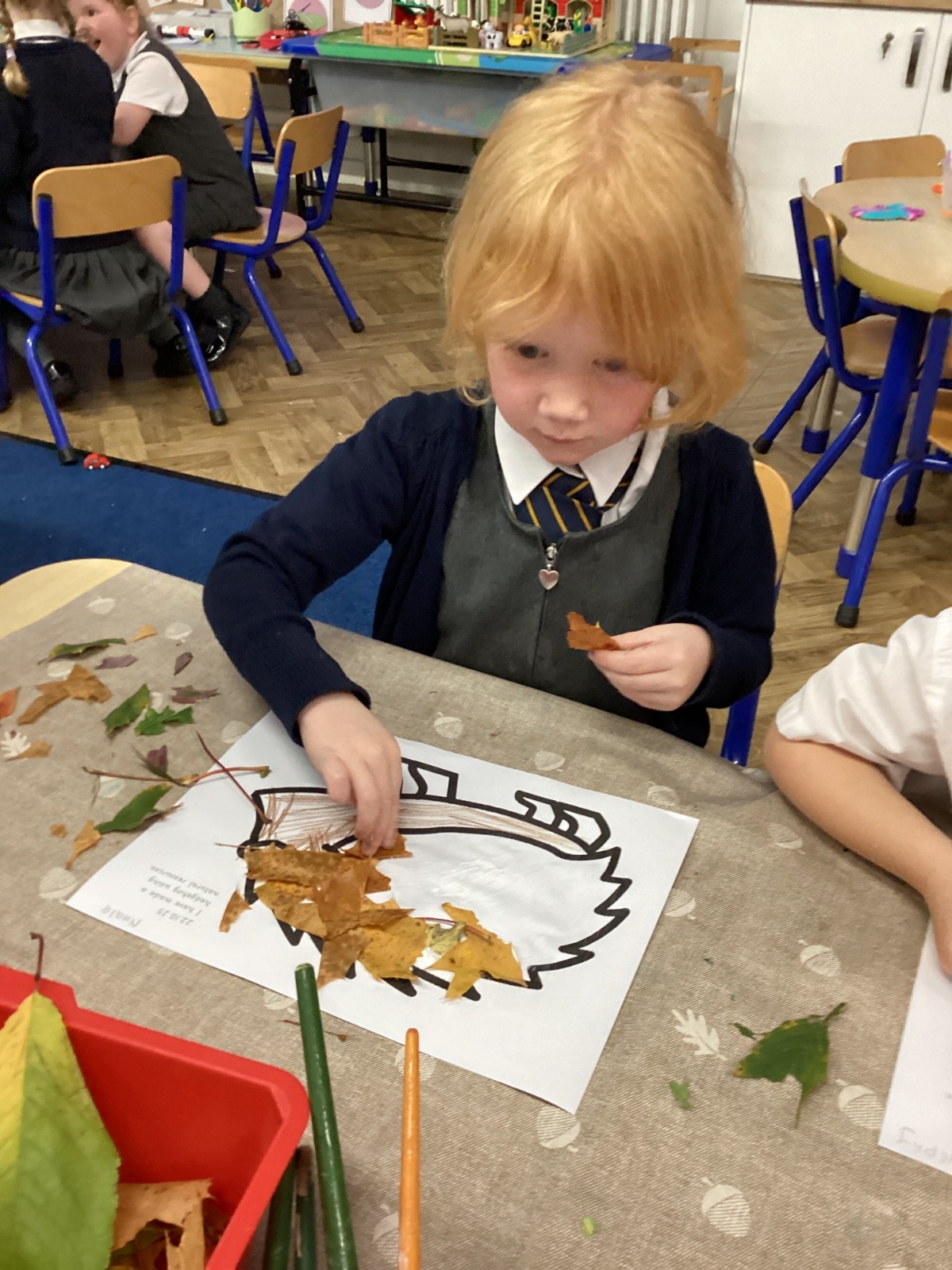 We have been learning about autumn and thinking about the changes in the season. We created hedgehog pictures using different autumnal leaves.