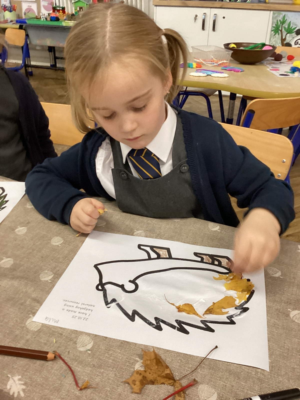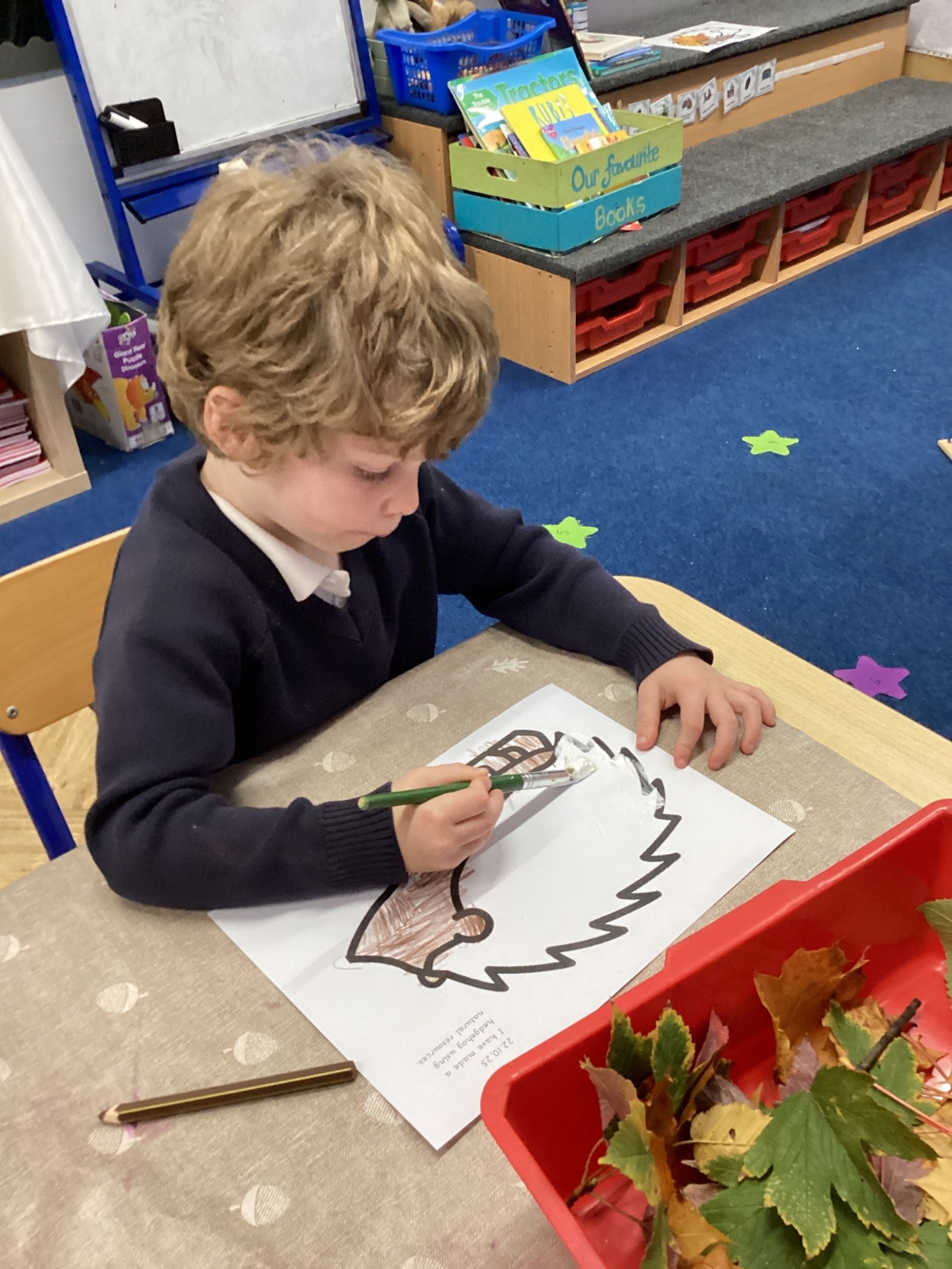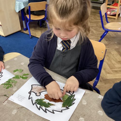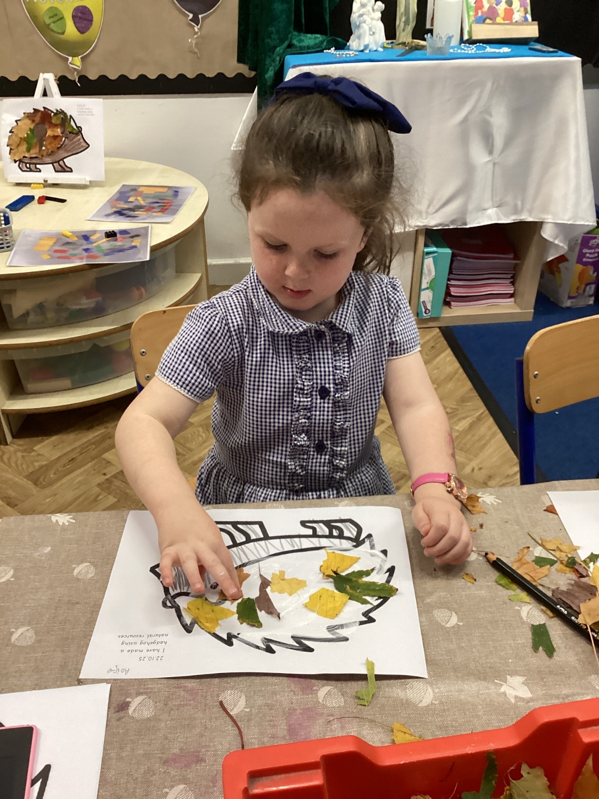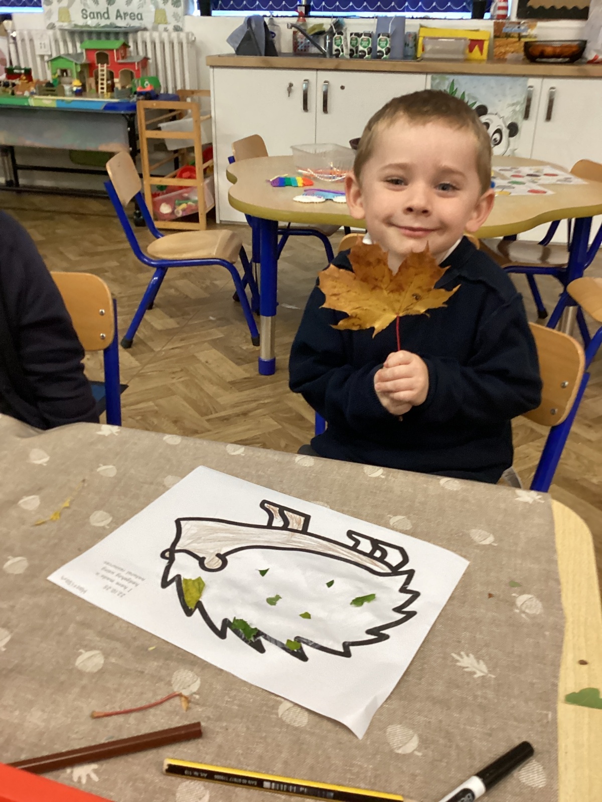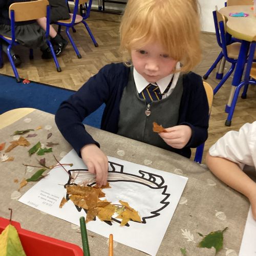 We have been learning about autumn and thinking about the changes in the season. We created hedgehog pictures using different autumnal leaves.