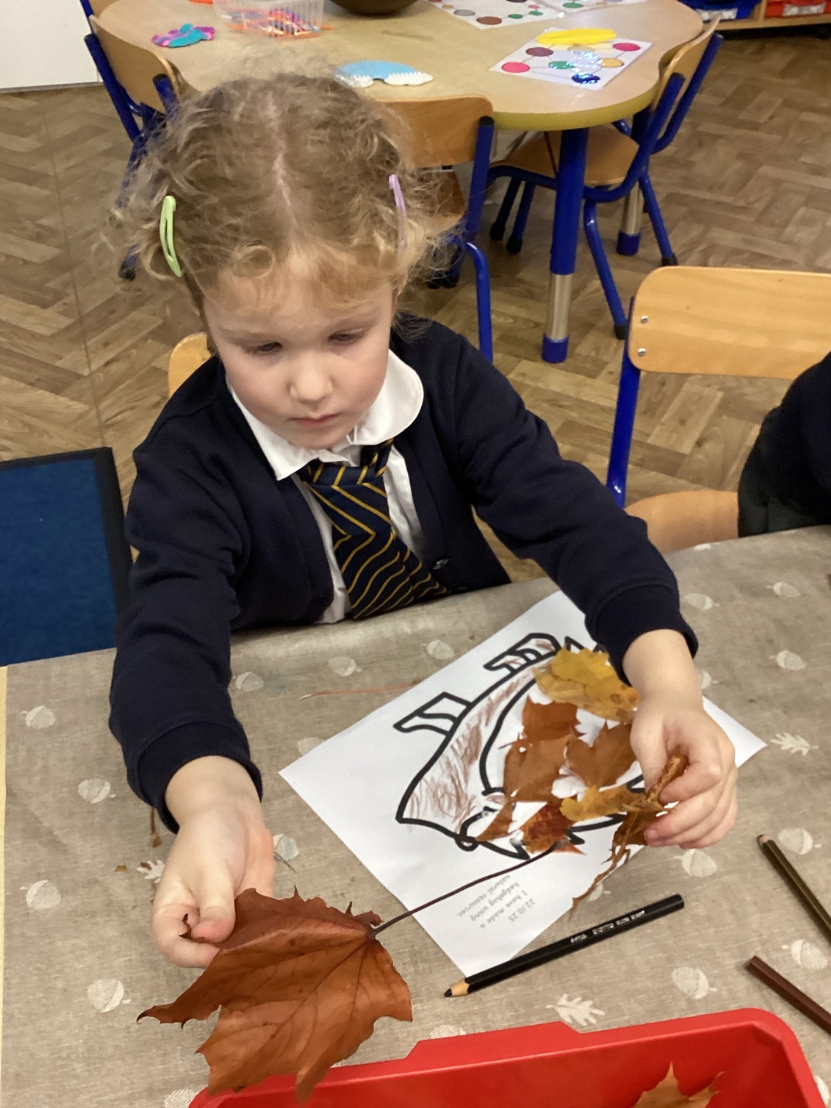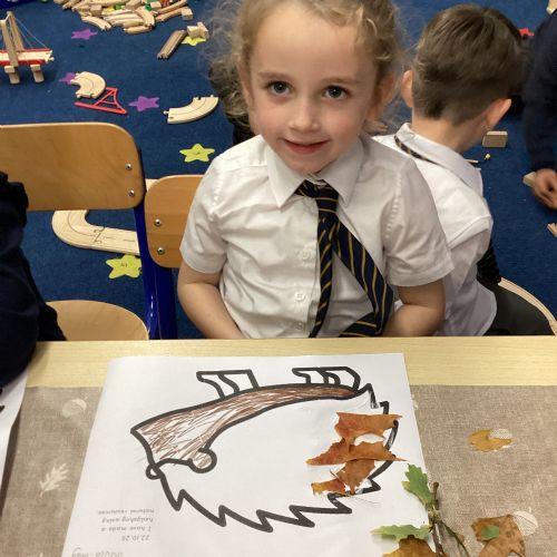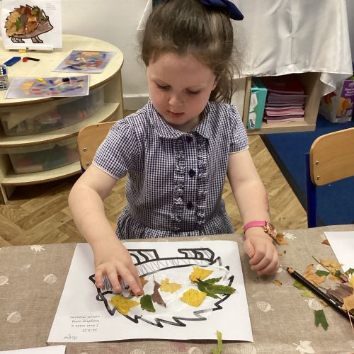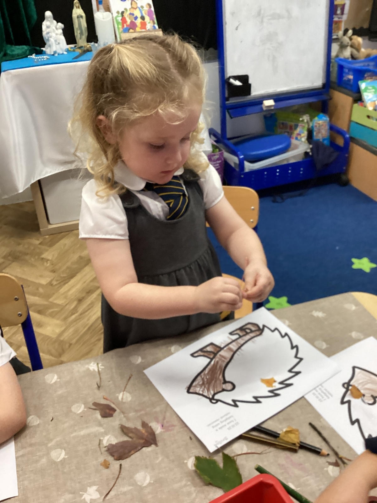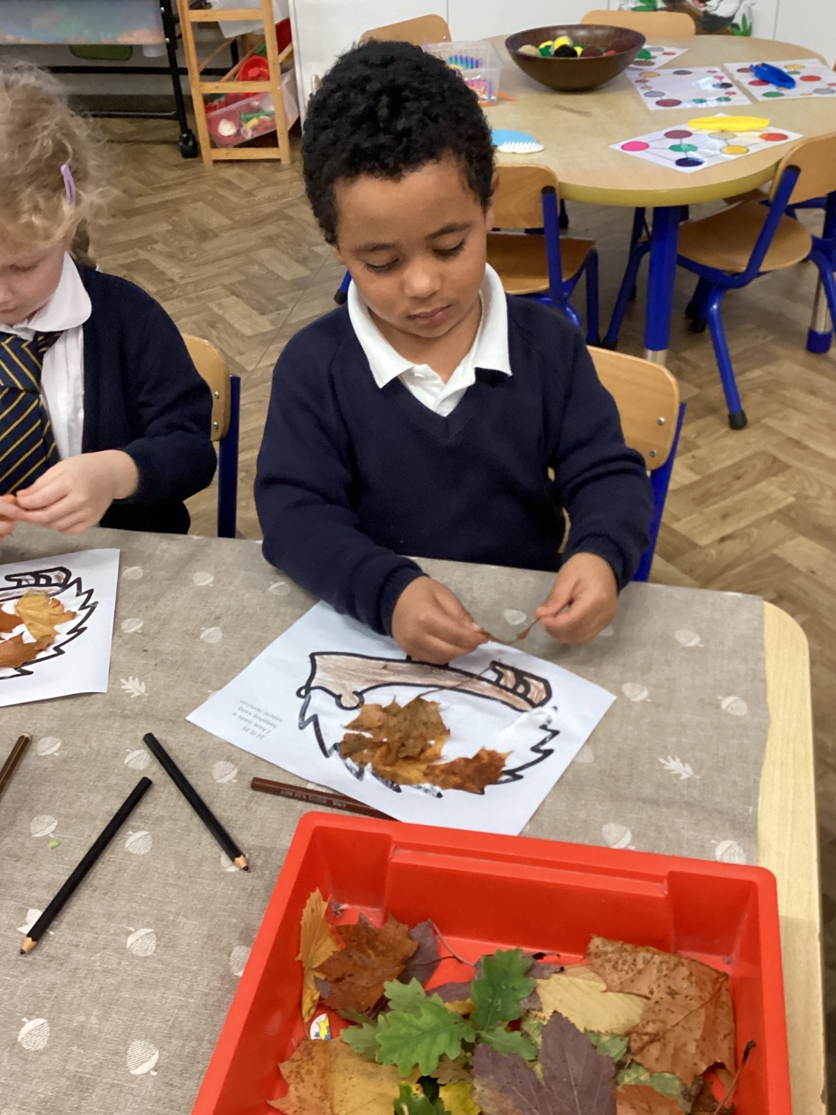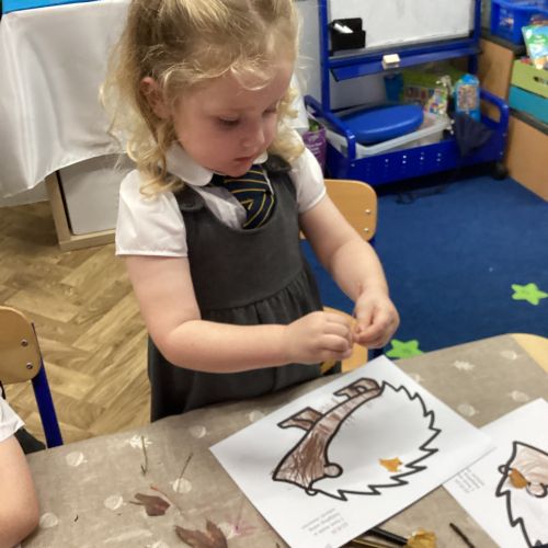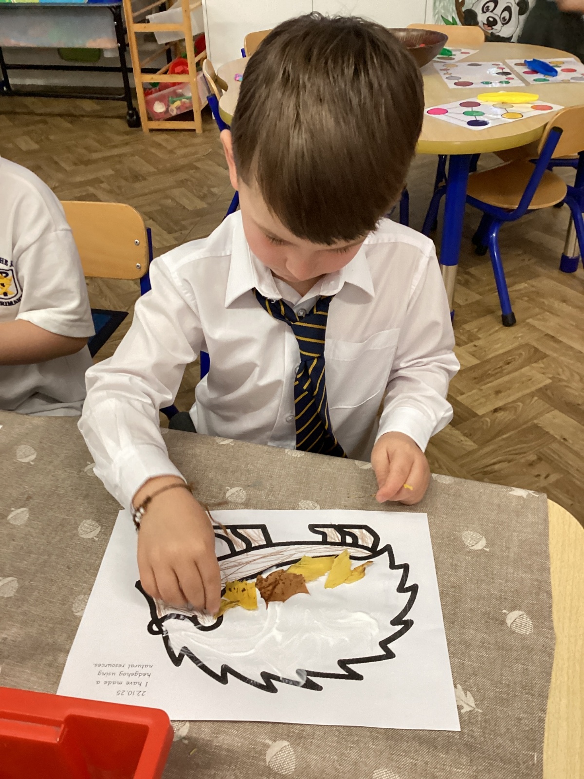 We have been learning about autumn and thinking about the changes in the season. We created hedgehog pictures using different autumnal leaves.