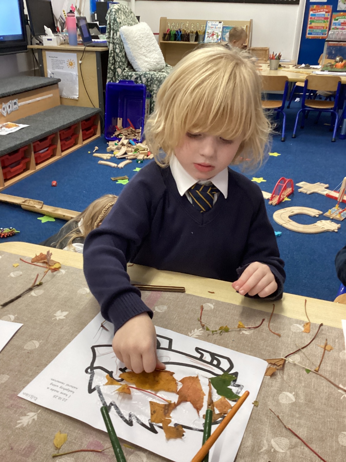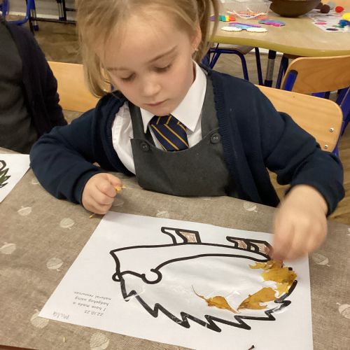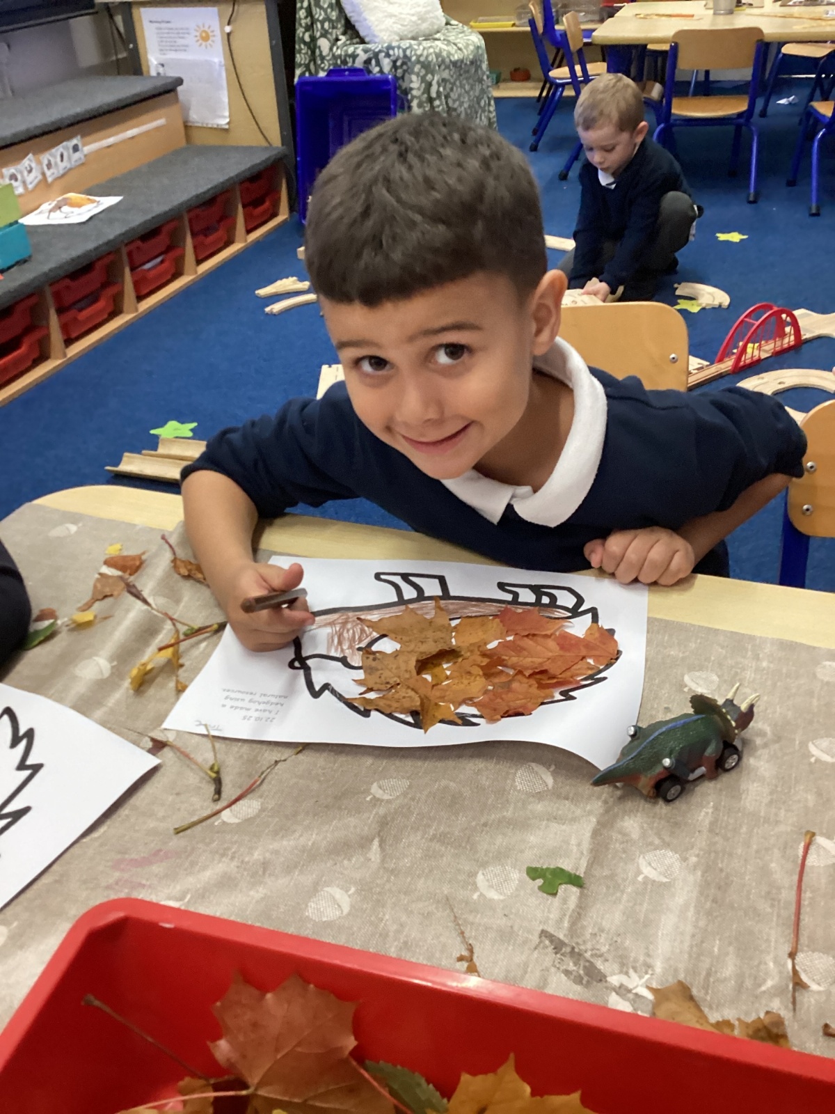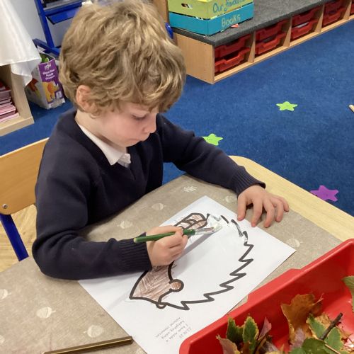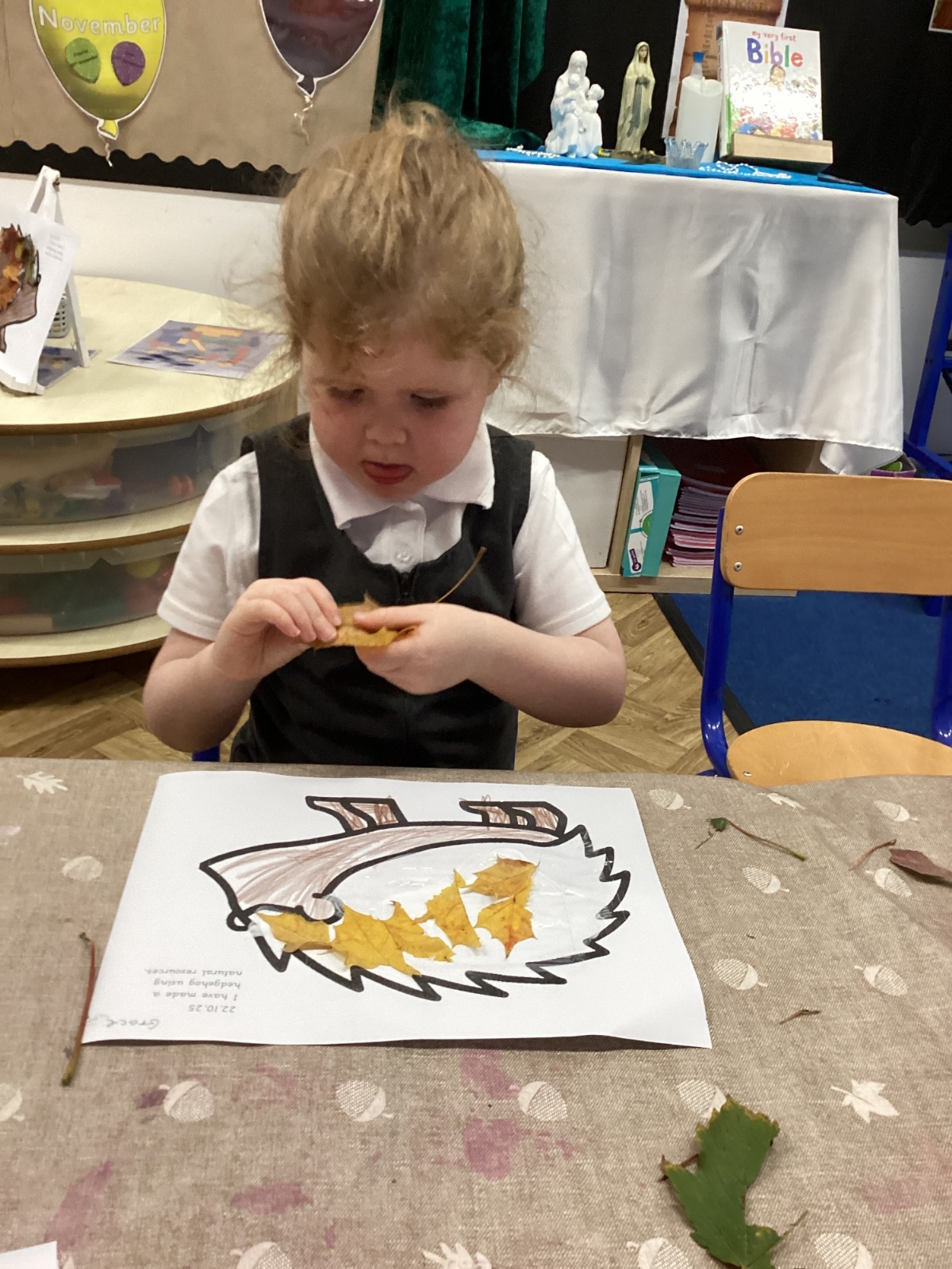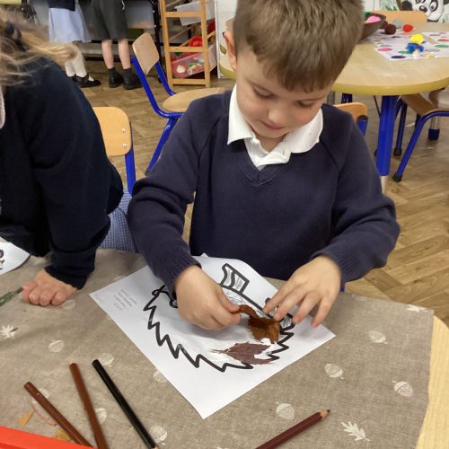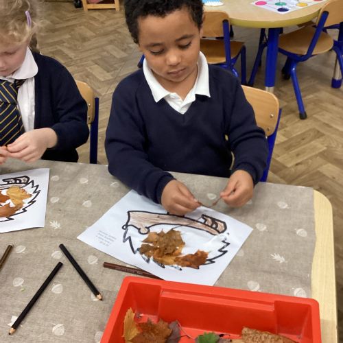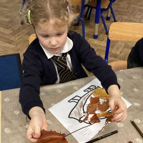 We have been learning about autumn and thinking about the changes in the season. We created hedgehog pictures using different autumnal leaves.