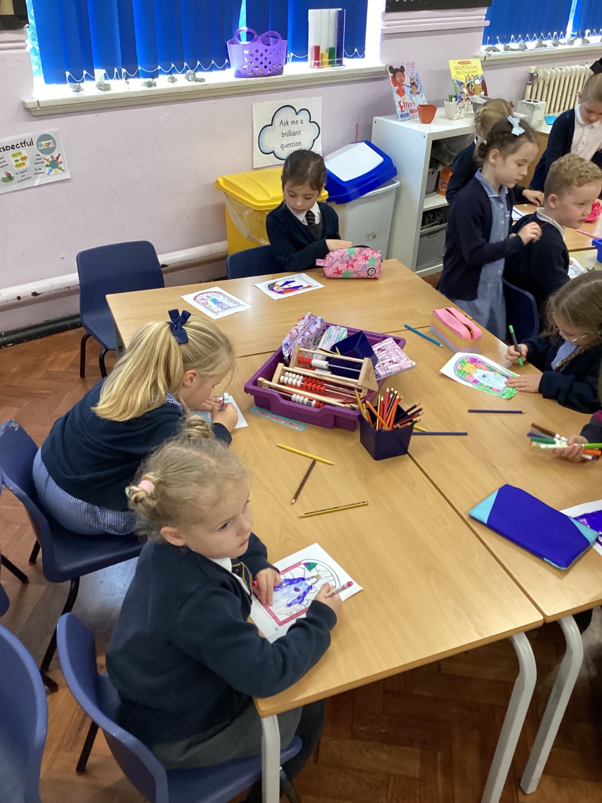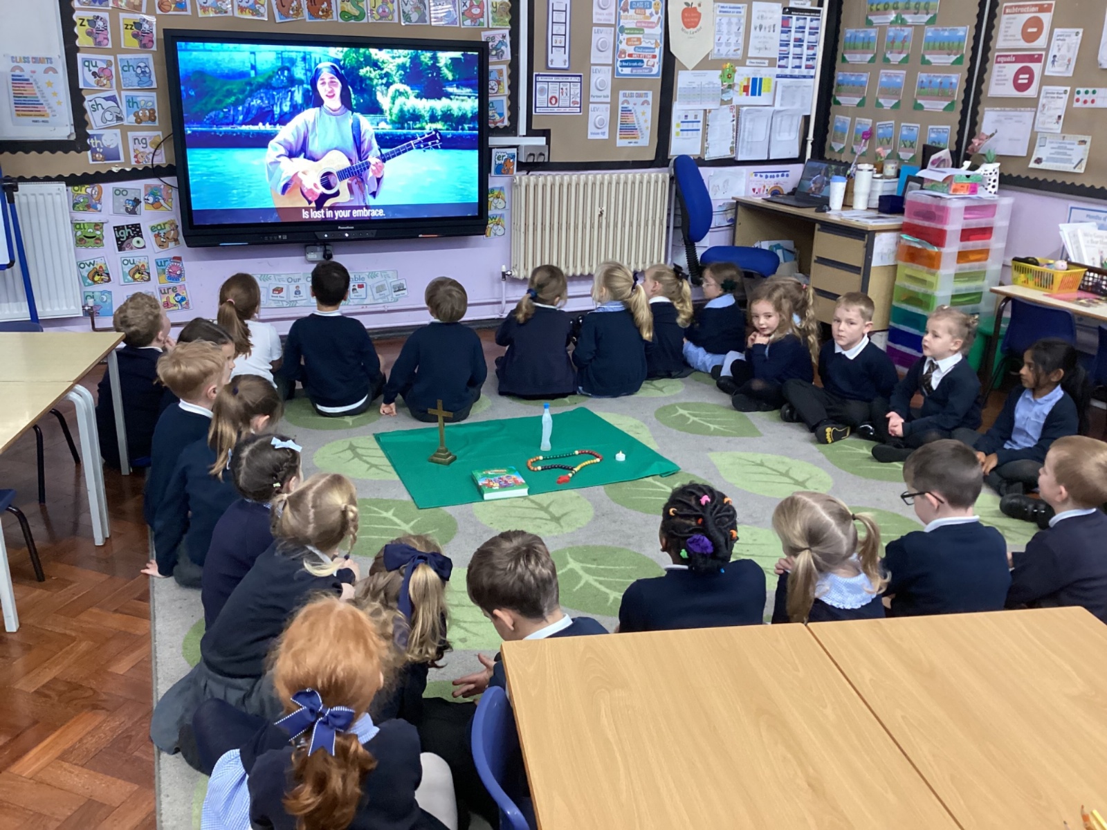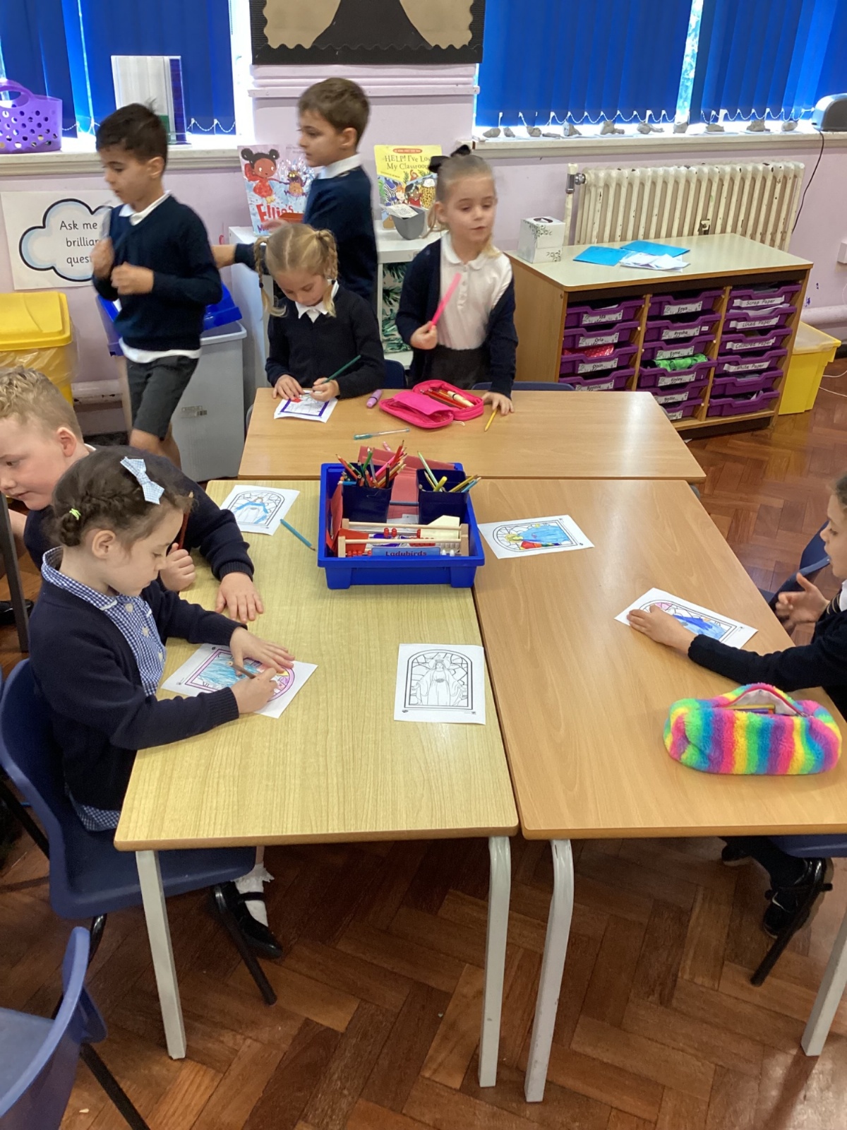 Today we took part in a whole class collective worship session. We focused on Mary as it is the month of October and we shared lots of insightful thoughts. We ended our celebration with singing a hymn for Mary and created beautiful pictures of Mary.