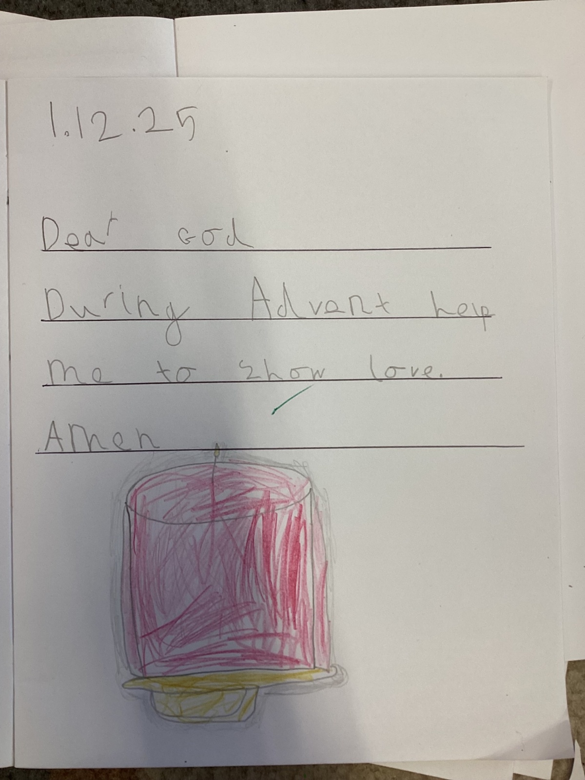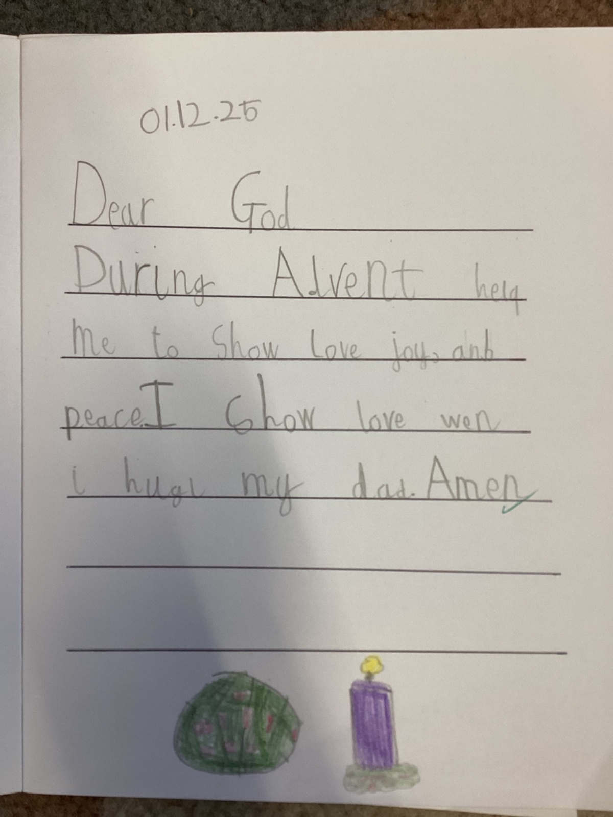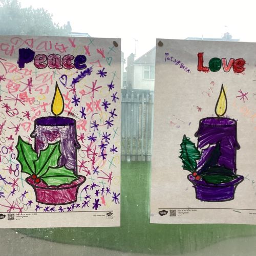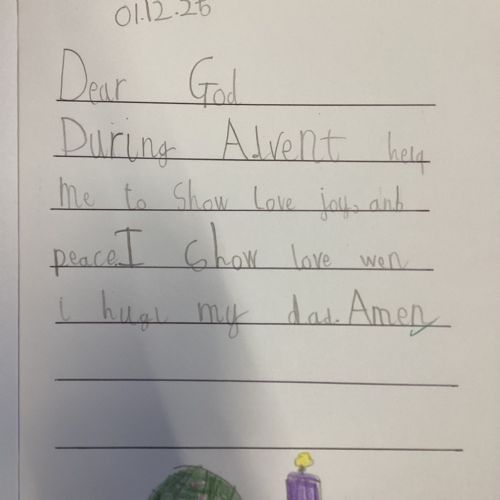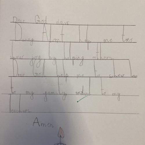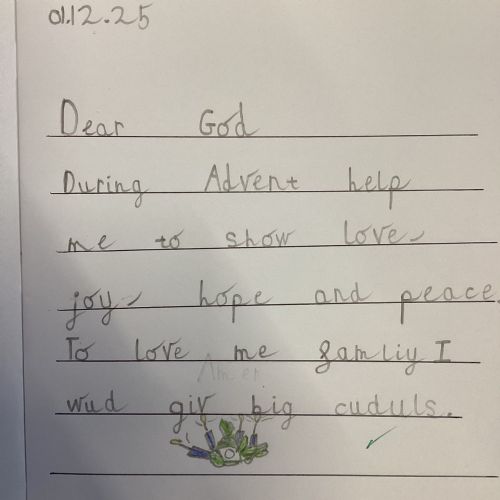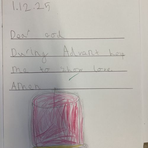 Today we celebrated the start of Advent. We explored each candle on the Advent wreath and created a class display. We wrote prayers asking God to help us be hopeful, joyful, loving and peaceful in the season of Advent. We also created our Christmas cards which we will share with our families and local community.