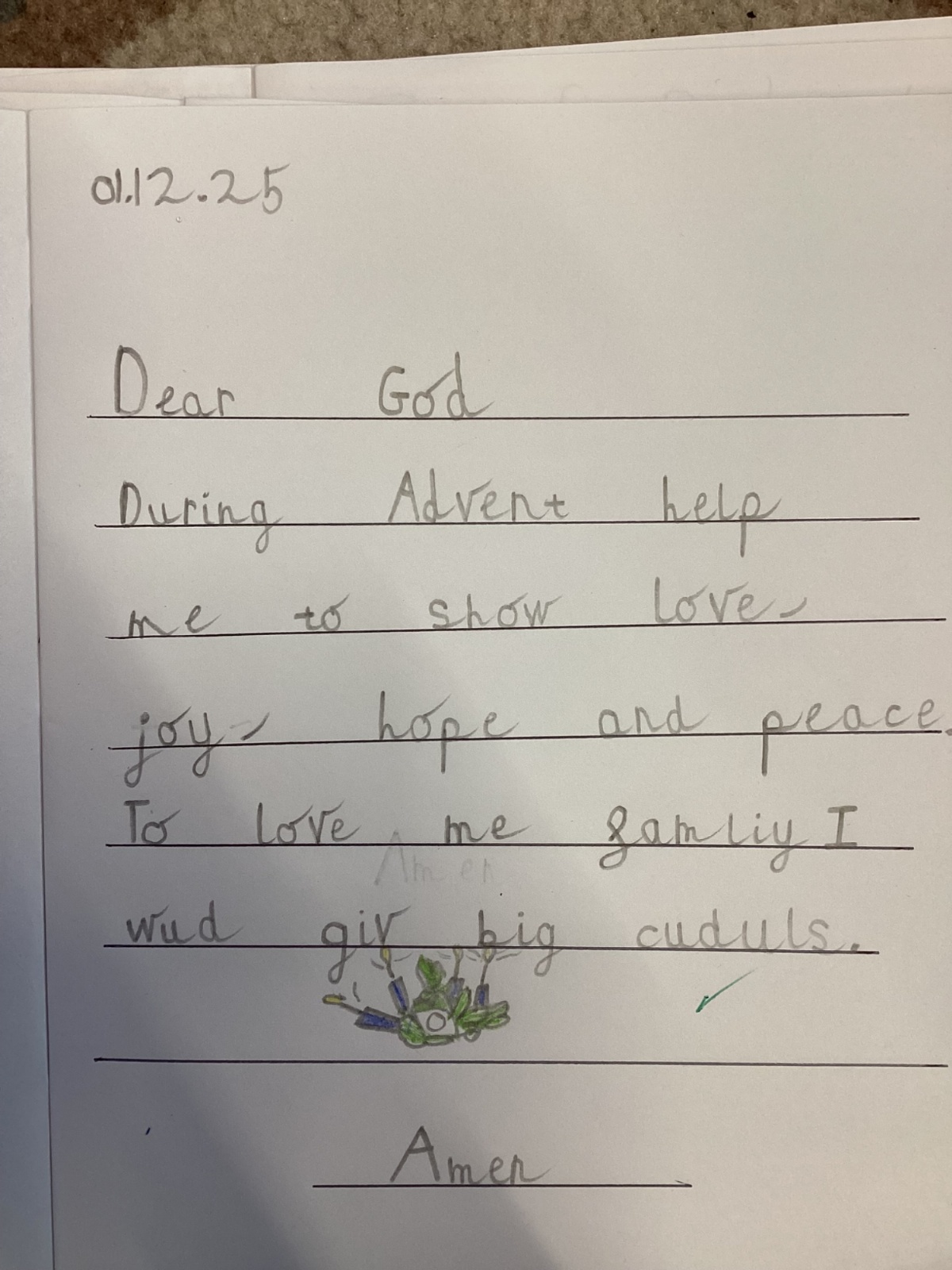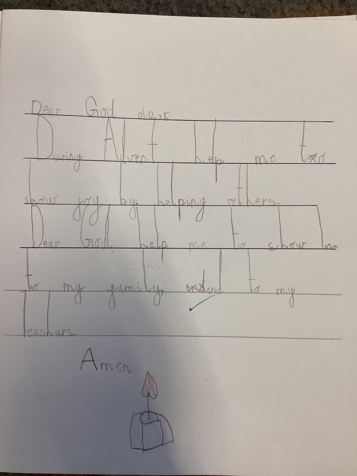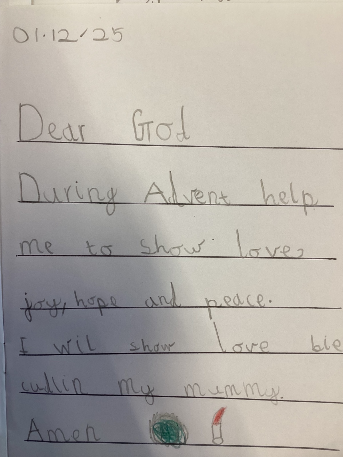 Today we celebrated the start of Advent. We explored each candle on the Advent wreath and created a class display. We wrote prayers asking God to help us be hopeful, joyful, loving and peaceful in the season of Advent. We also created our Christmas cards which we will share with our families and local community.