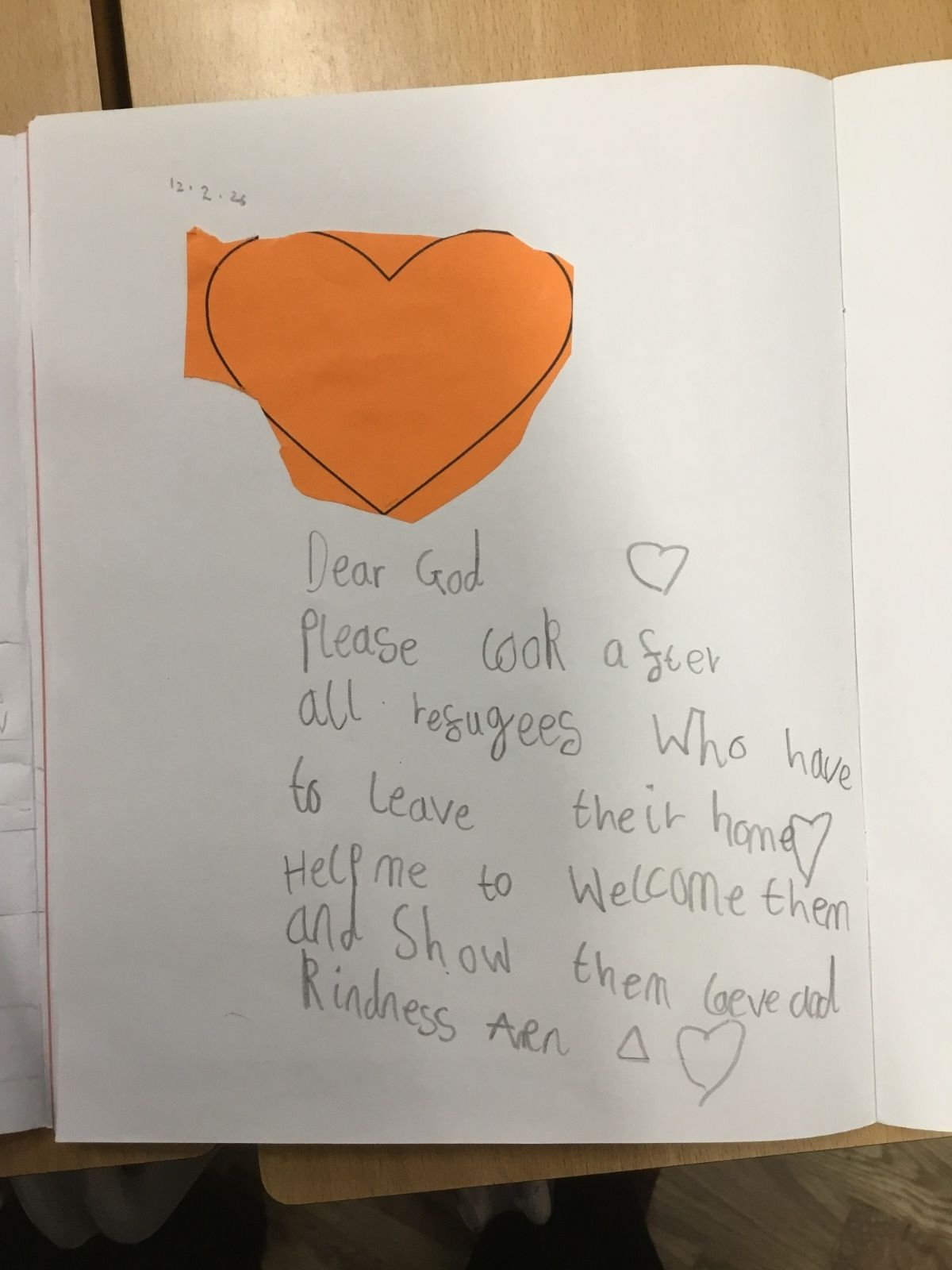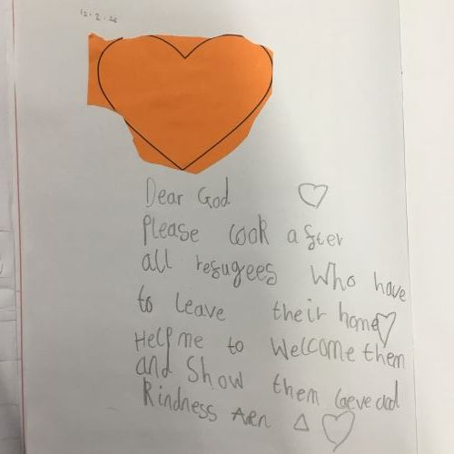 Today, class 5 showed their support for refugees by writing a prayer on orange hearts.