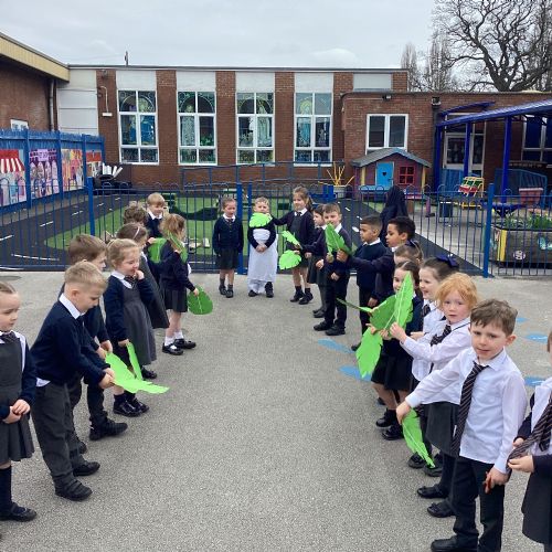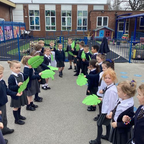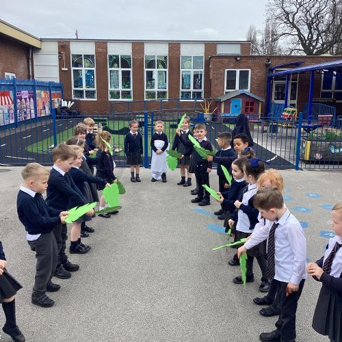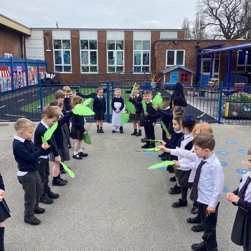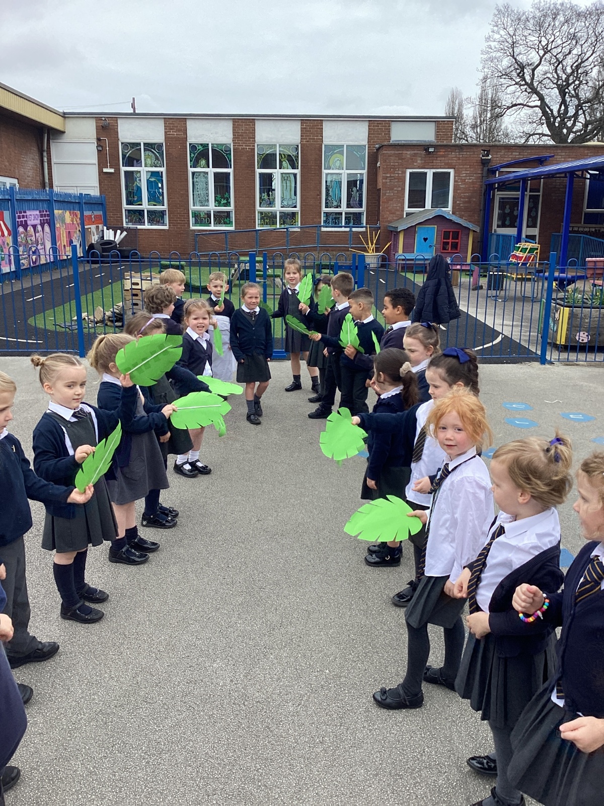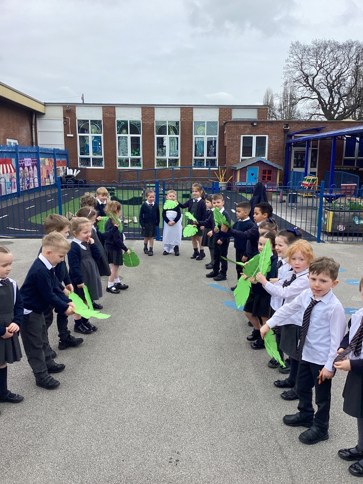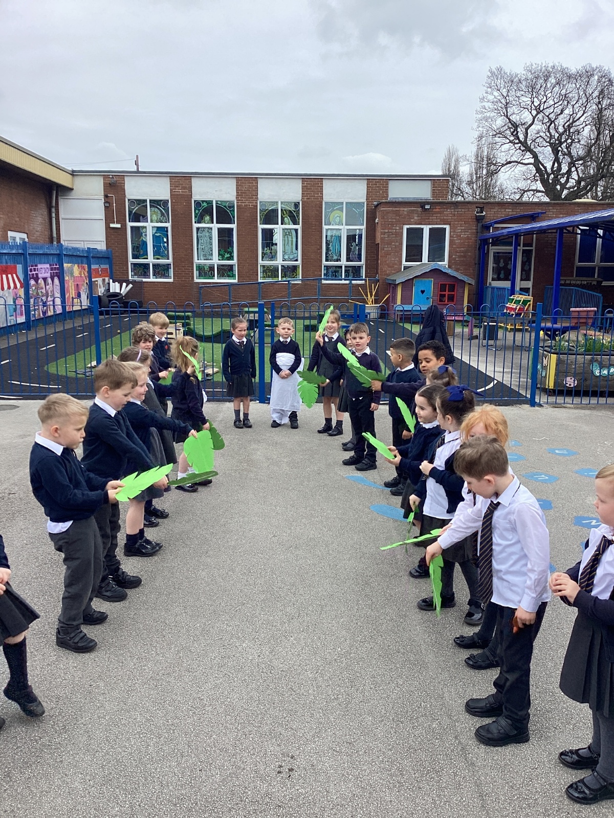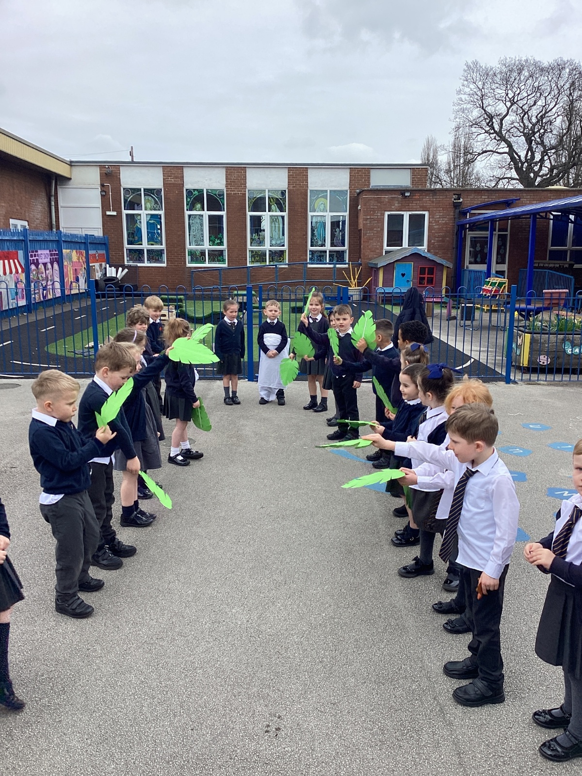We re-enacted the events of Palm Sunday when Jesus entered Jerusalem. We waved palm leaves and sang, "Hosanna."