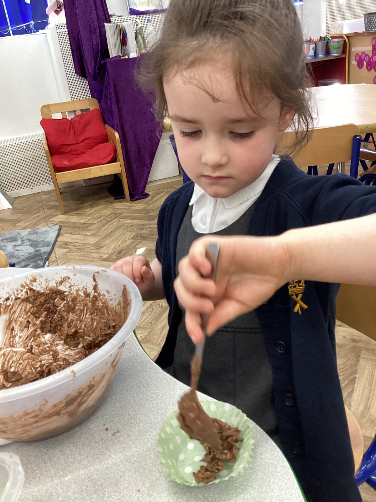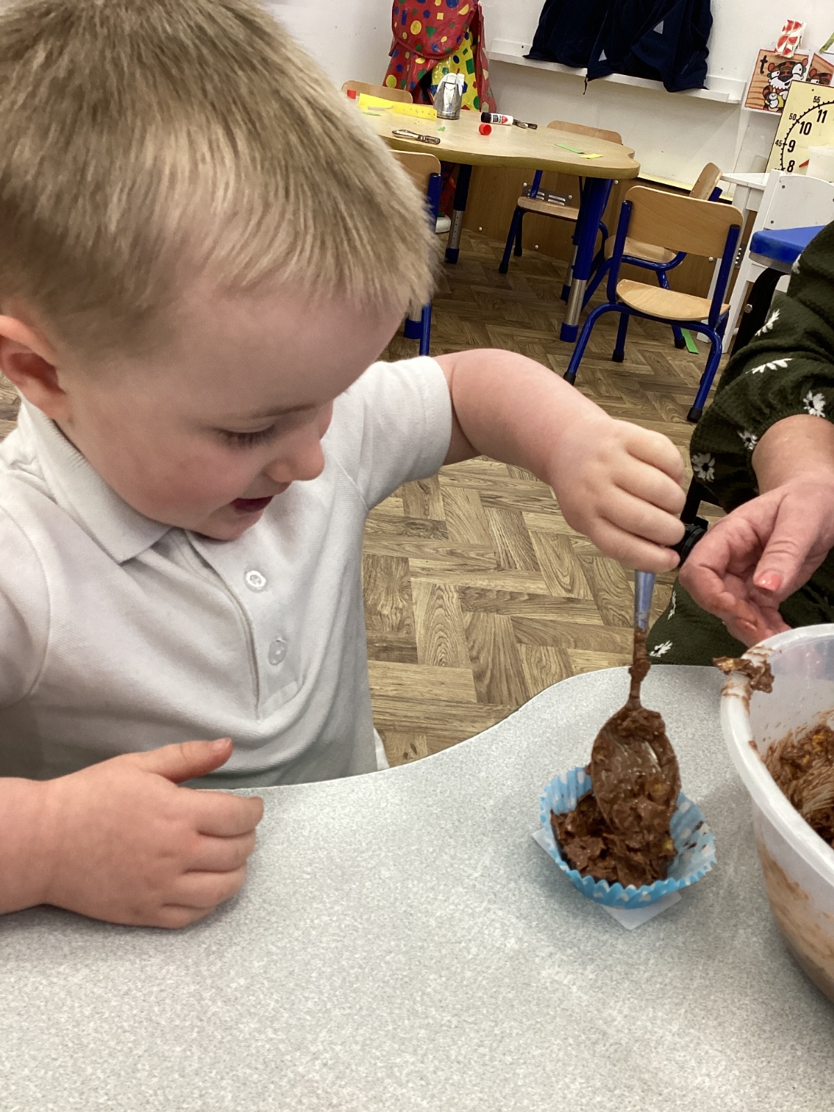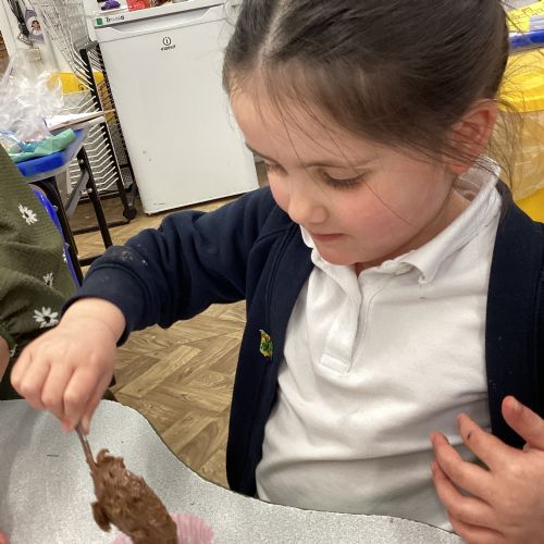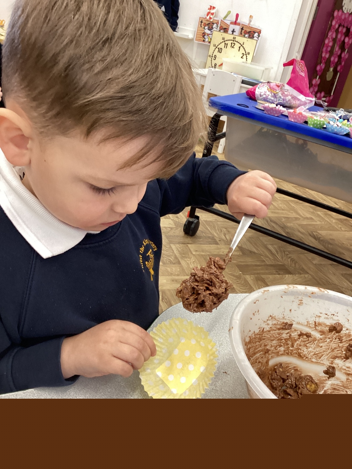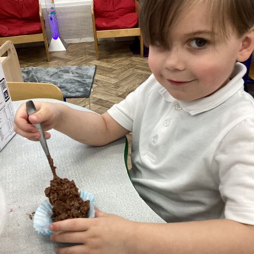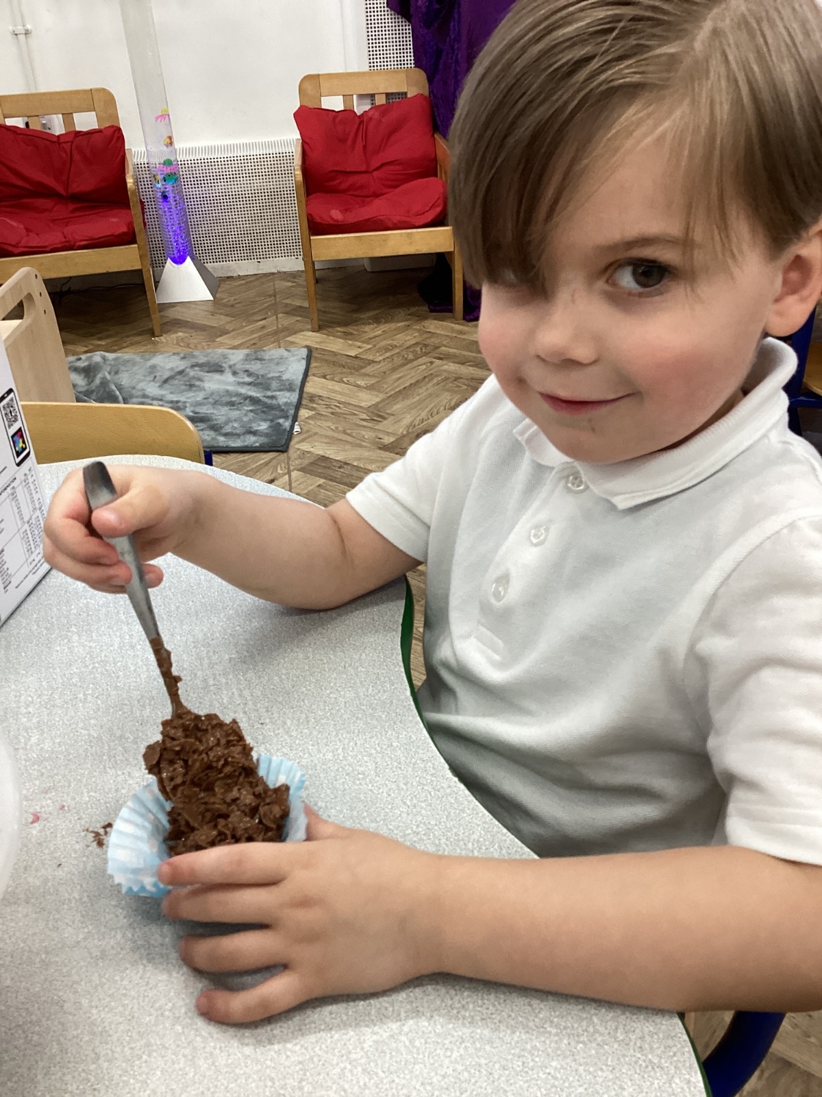 The children had a wonderful time making chocolate dinosaur krispie cakes. The children helped to melt the chocolate, watching carefully as it changed from a solid to smooth and runny. They talked about how the chocolate changed, using words like, 'melting' and 'hot' to describe what they could see.