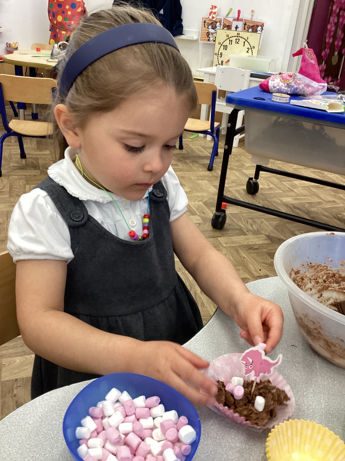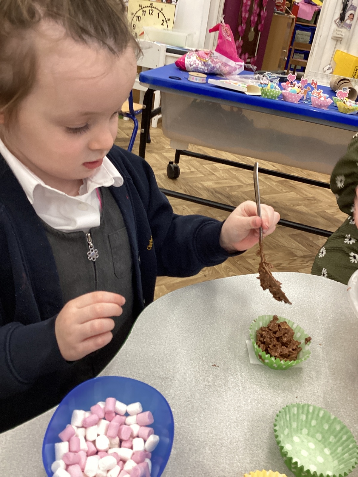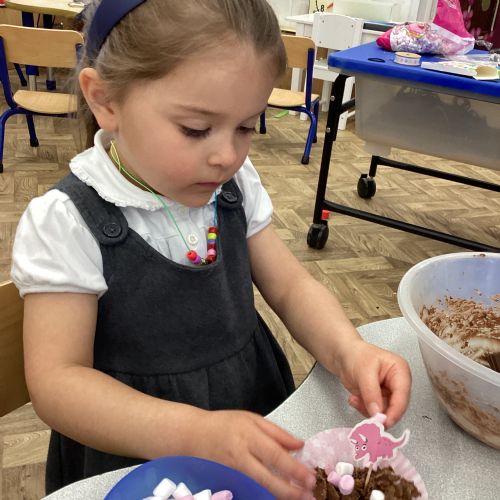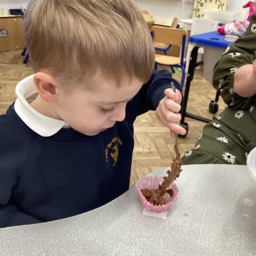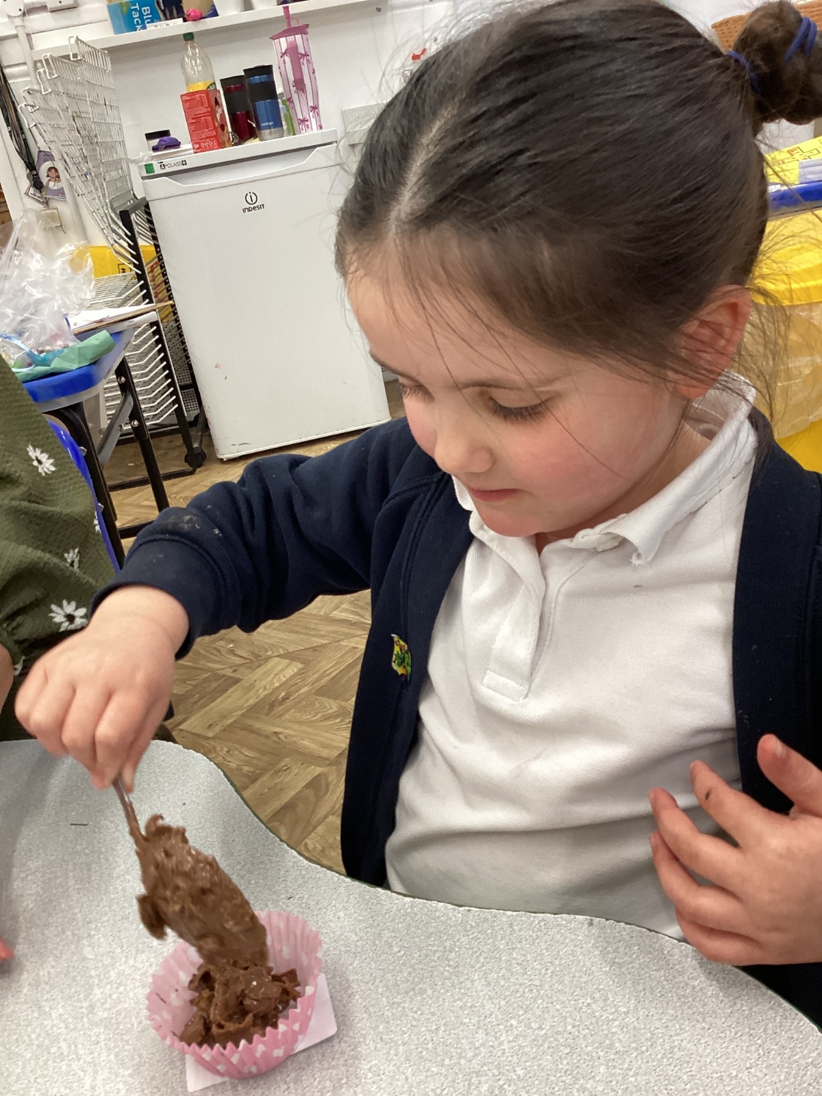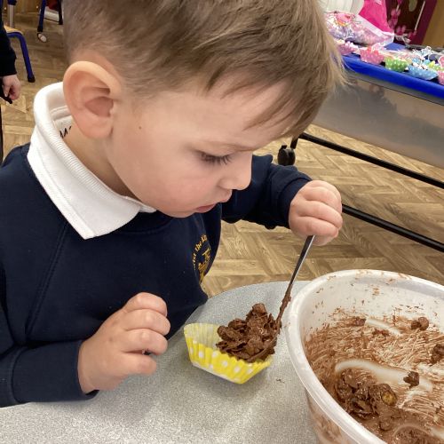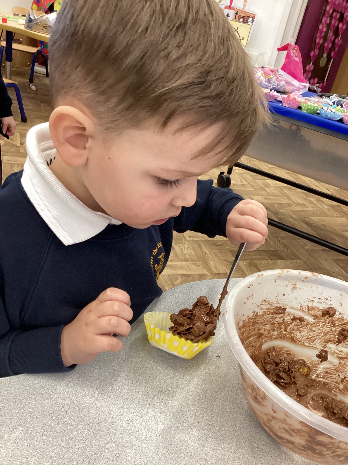 The children had a wonderful time making chocolate dinosaur krispie cakes. The children helped to melt the chocolate, watching carefully as it changed from a solid to smooth and runny. They talked about how the chocolate changed, using words like, 'melting' and 'hot' to describe what they could see.