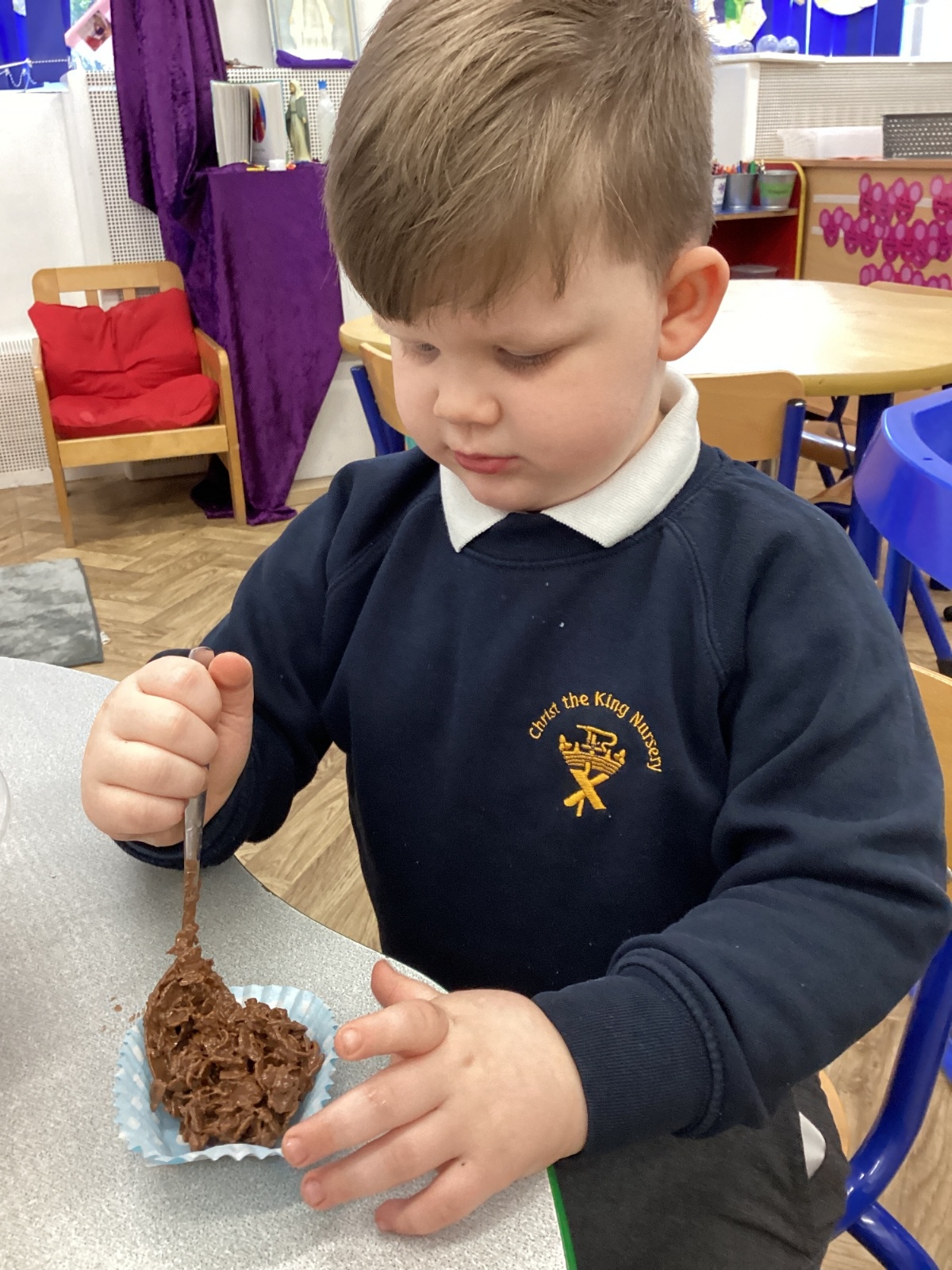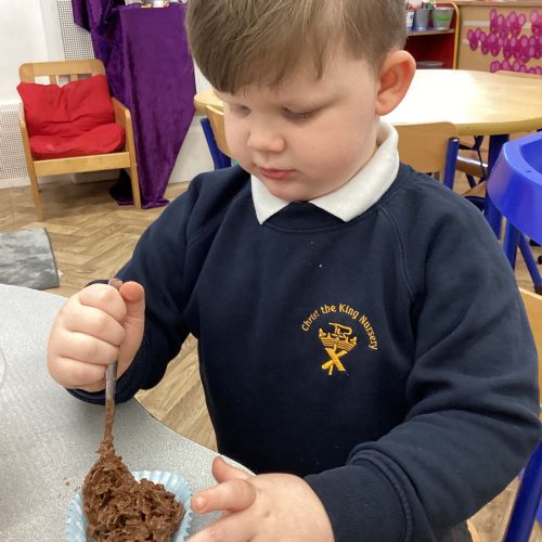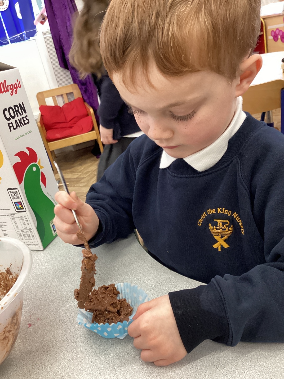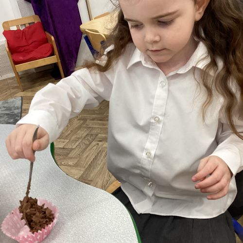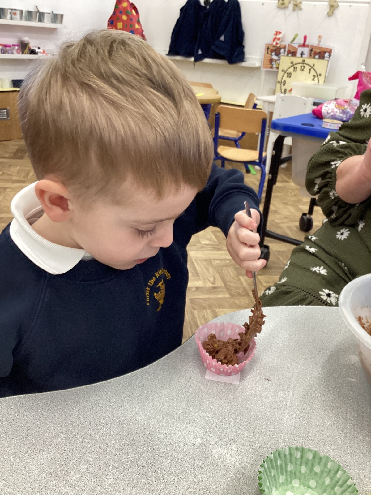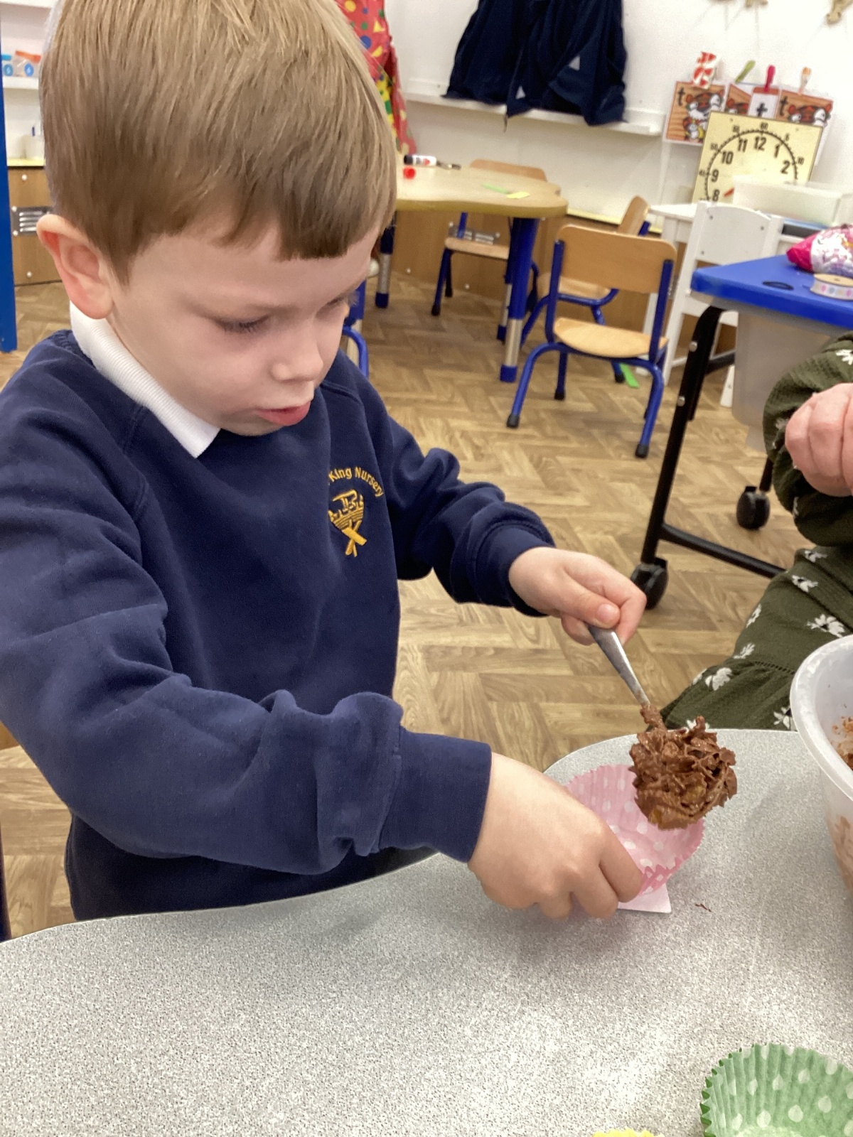 The children had a wonderful time making chocolate dinosaur krispie cakes. The children helped to melt the chocolate, watching carefully as it changed from a solid to smooth and runny. They talked about how the chocolate changed, using words like, 'melting' and 'hot' to describe what they could see.