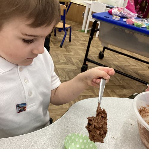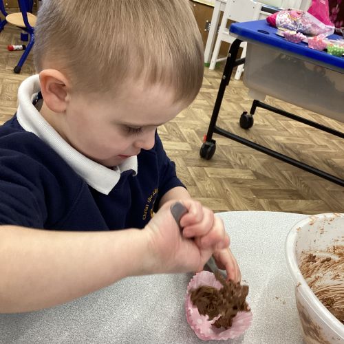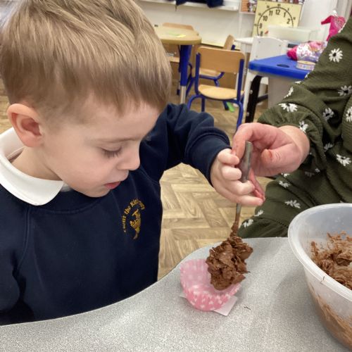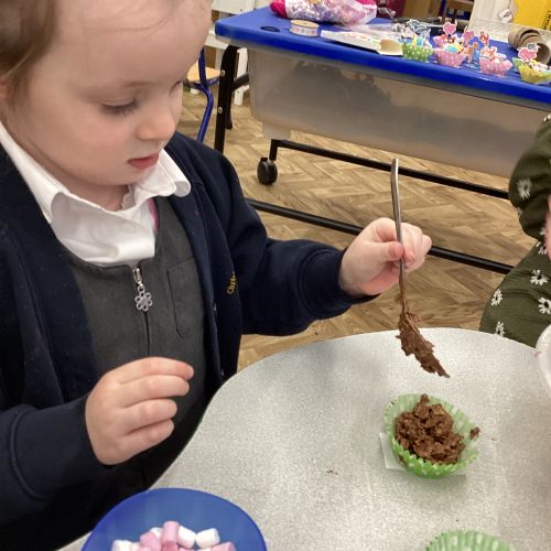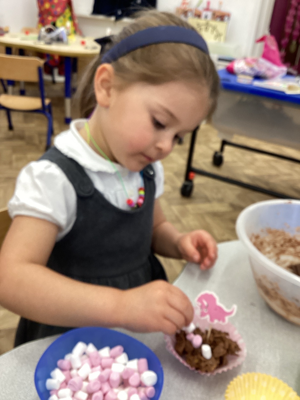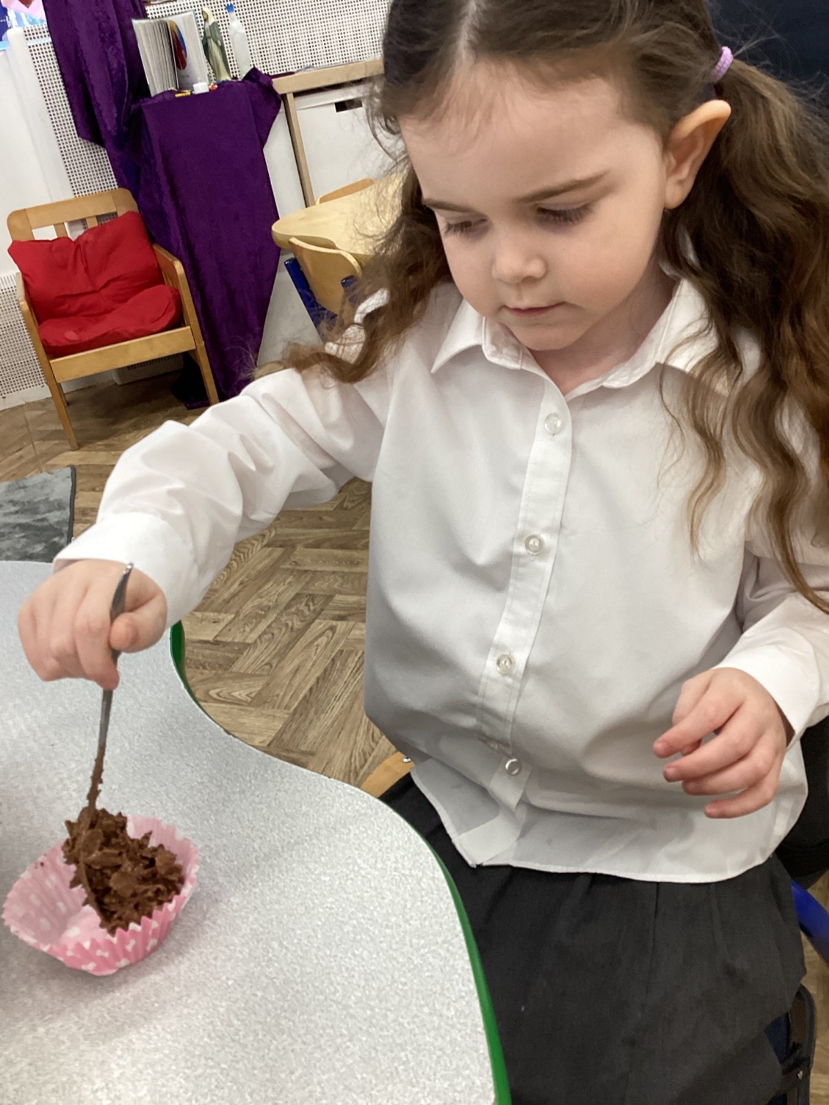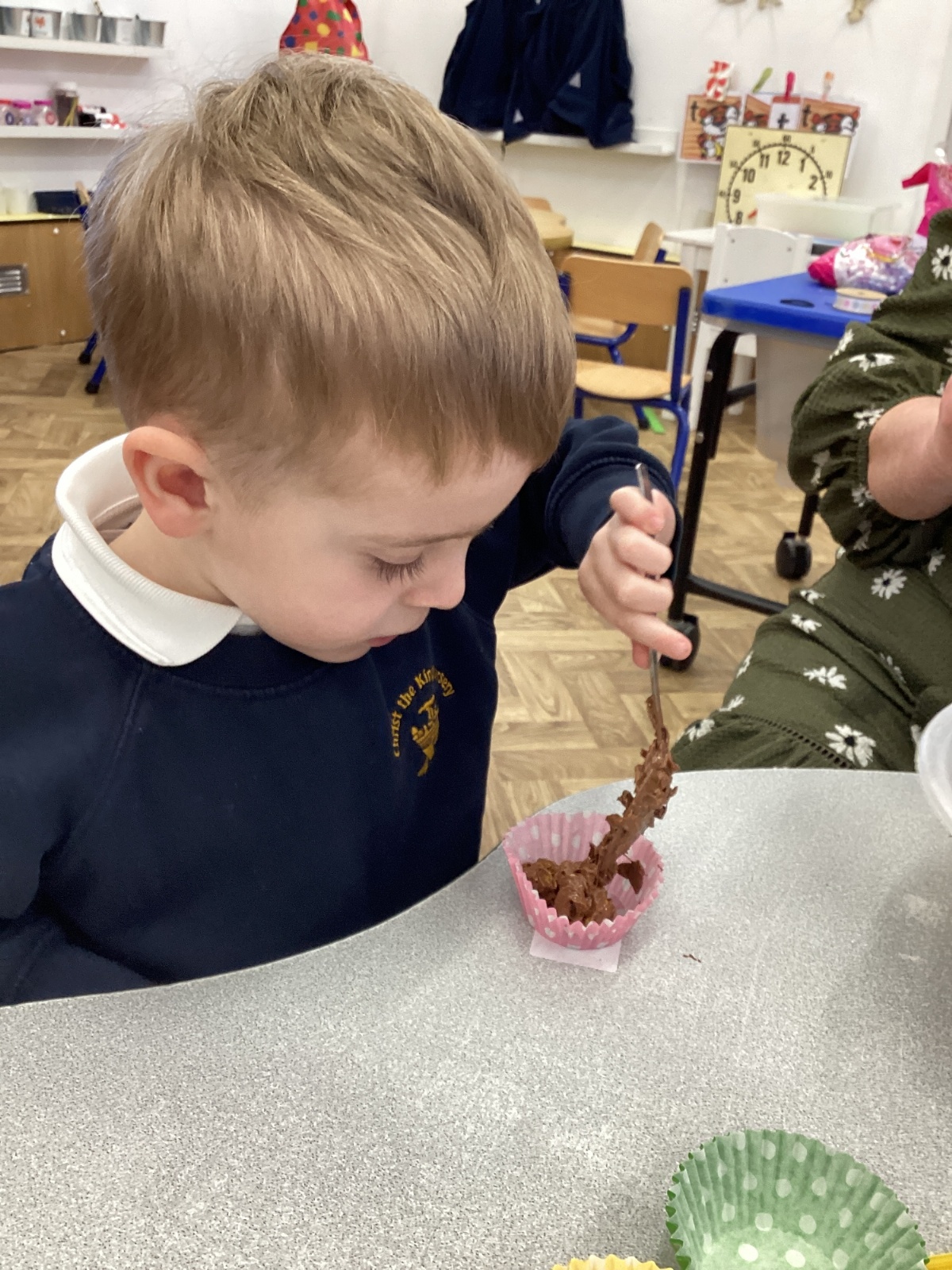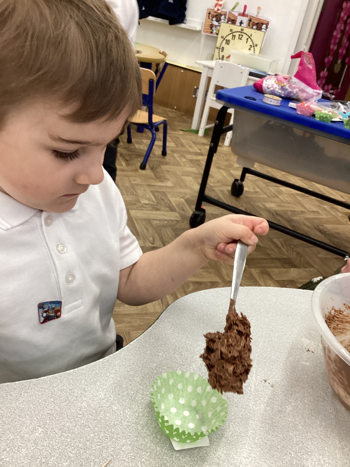 The children had a wonderful time making chocolate dinosaur krispie cakes. The children helped to melt the chocolate, watching carefully as it changed from a solid to smooth and runny. They talked about how the chocolate changed, using words like, 'melting' and 'hot' to describe what they could see.