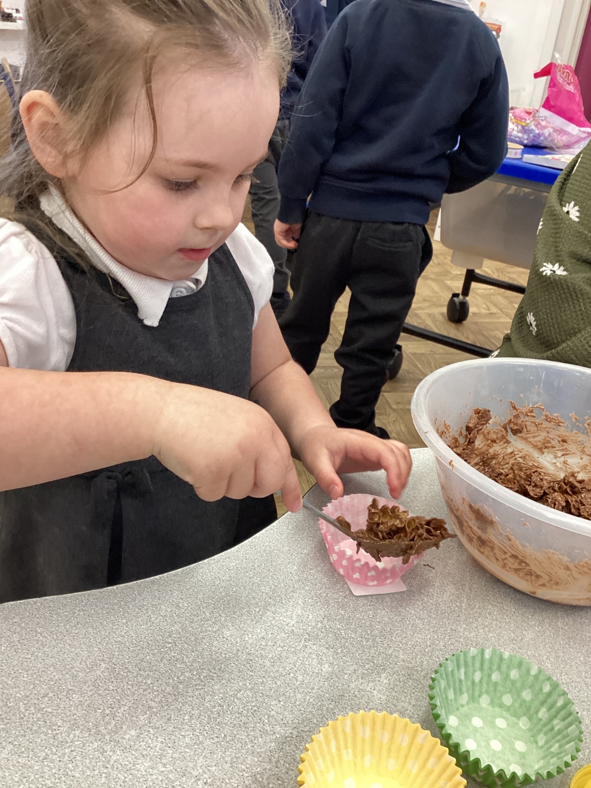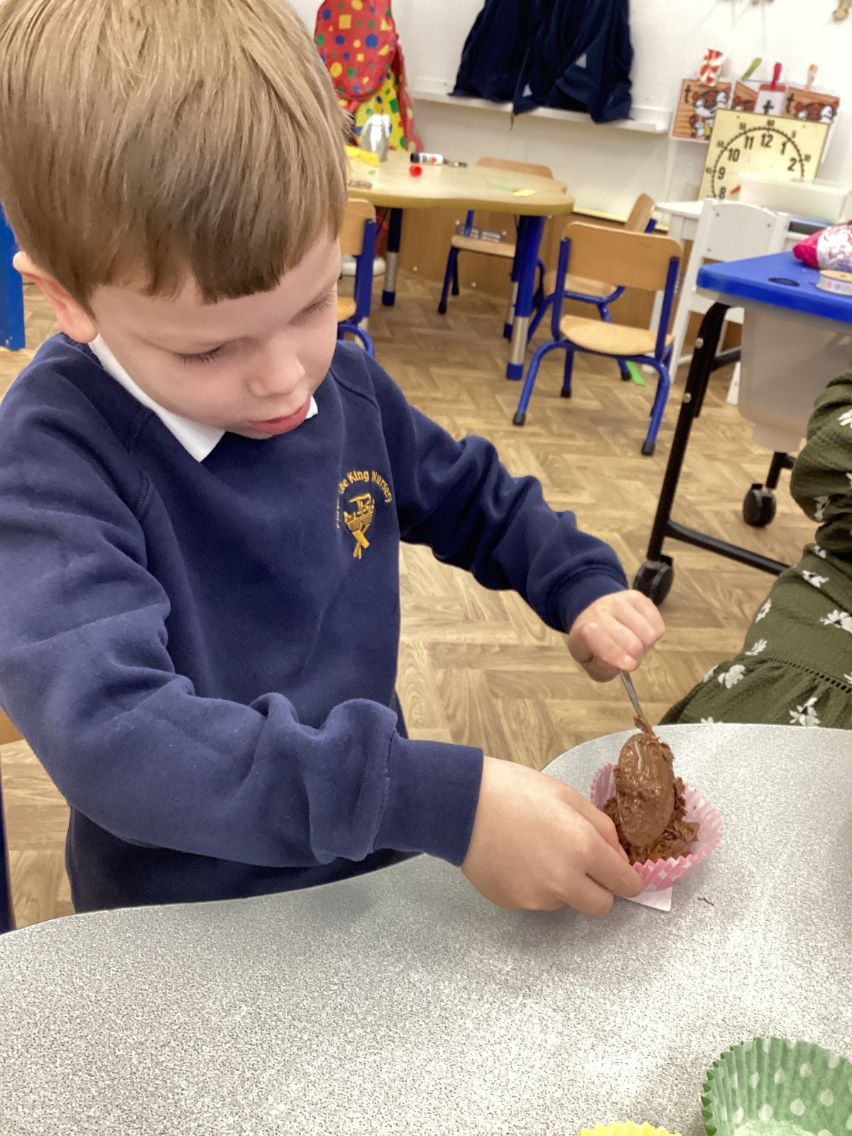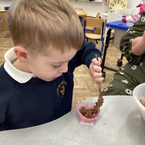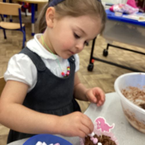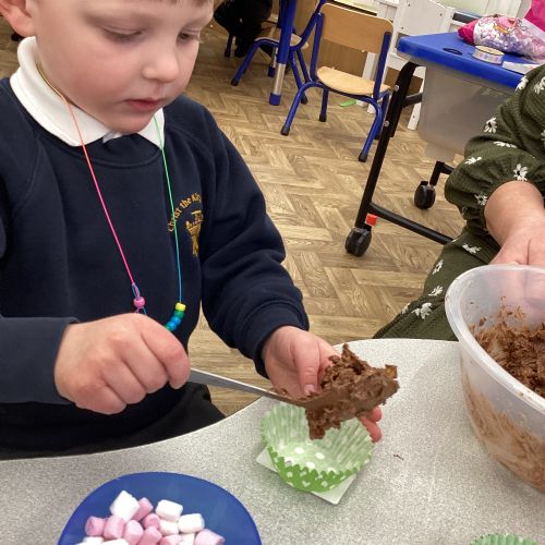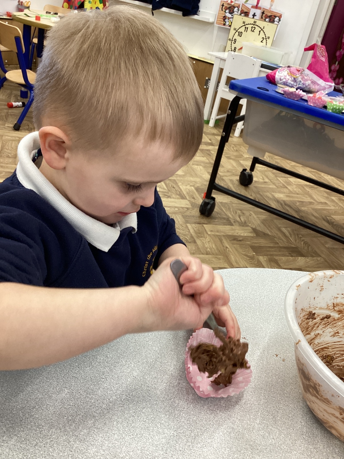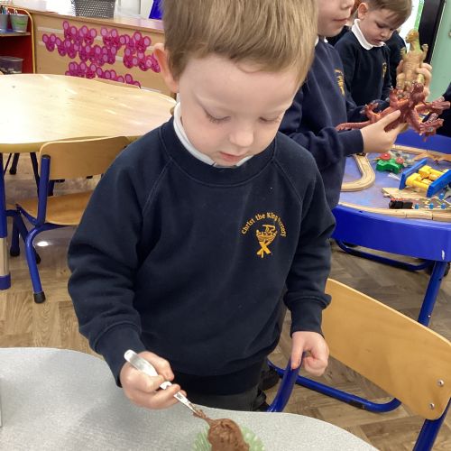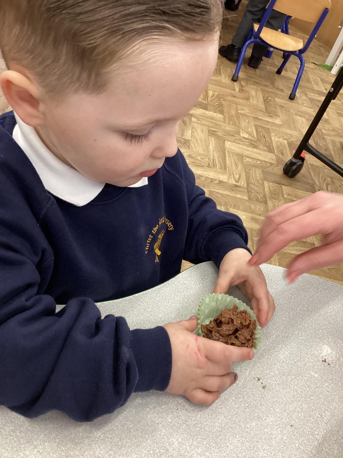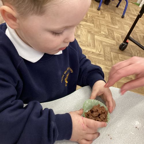 The children had a wonderful time making chocolate dinosaur krispie cakes. The children helped to melt the chocolate, watching carefully as it changed from a solid to smooth and runny. They talked about how the chocolate changed, using words like, 'melting' and 'hot' to describe what they could see.