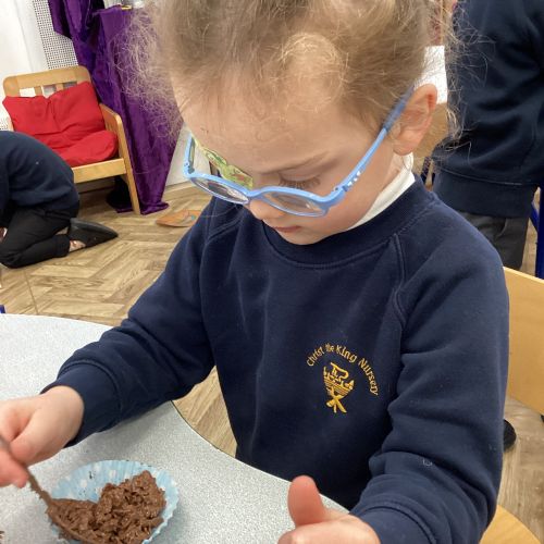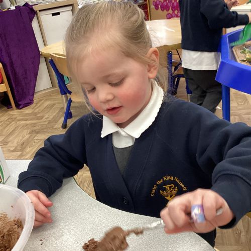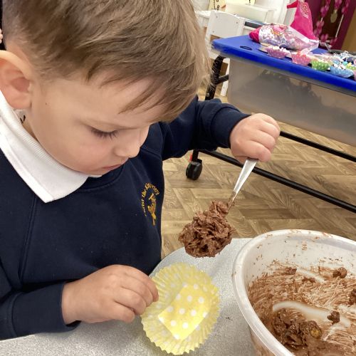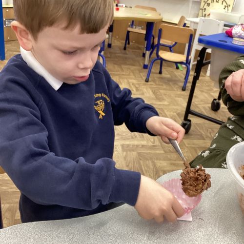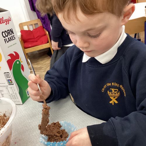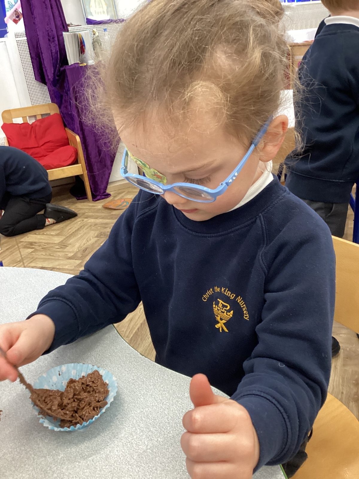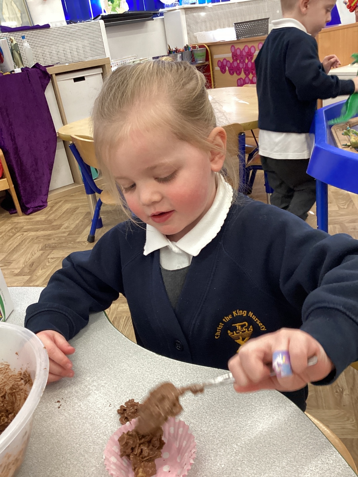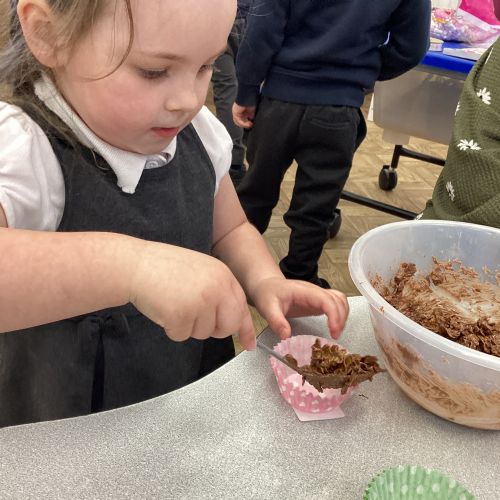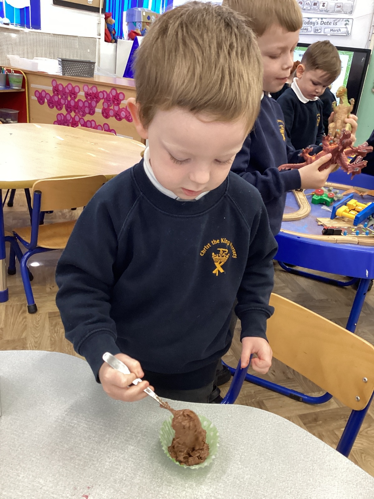 The children had a wonderful time making chocolate dinosaur krispie cakes. The children helped to melt the chocolate, watching carefully as it changed from a solid to smooth and runny. They talked about how the chocolate changed, using words like, 'melting' and 'hot' to describe what they could see.