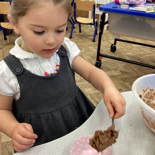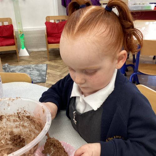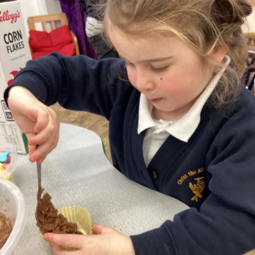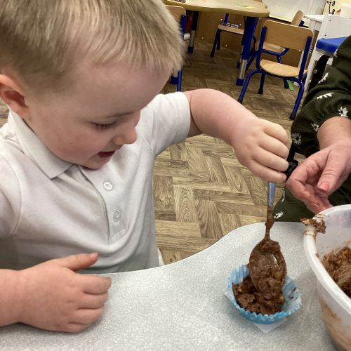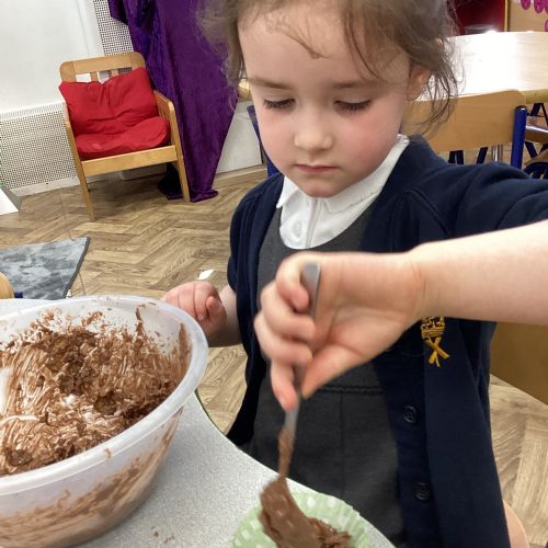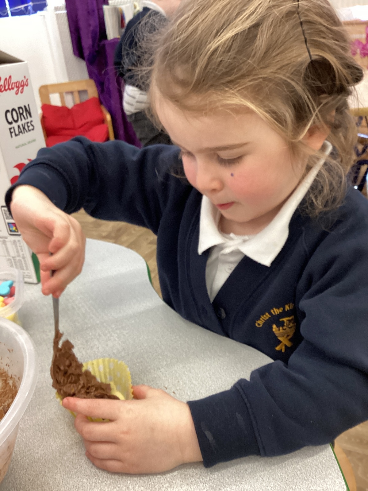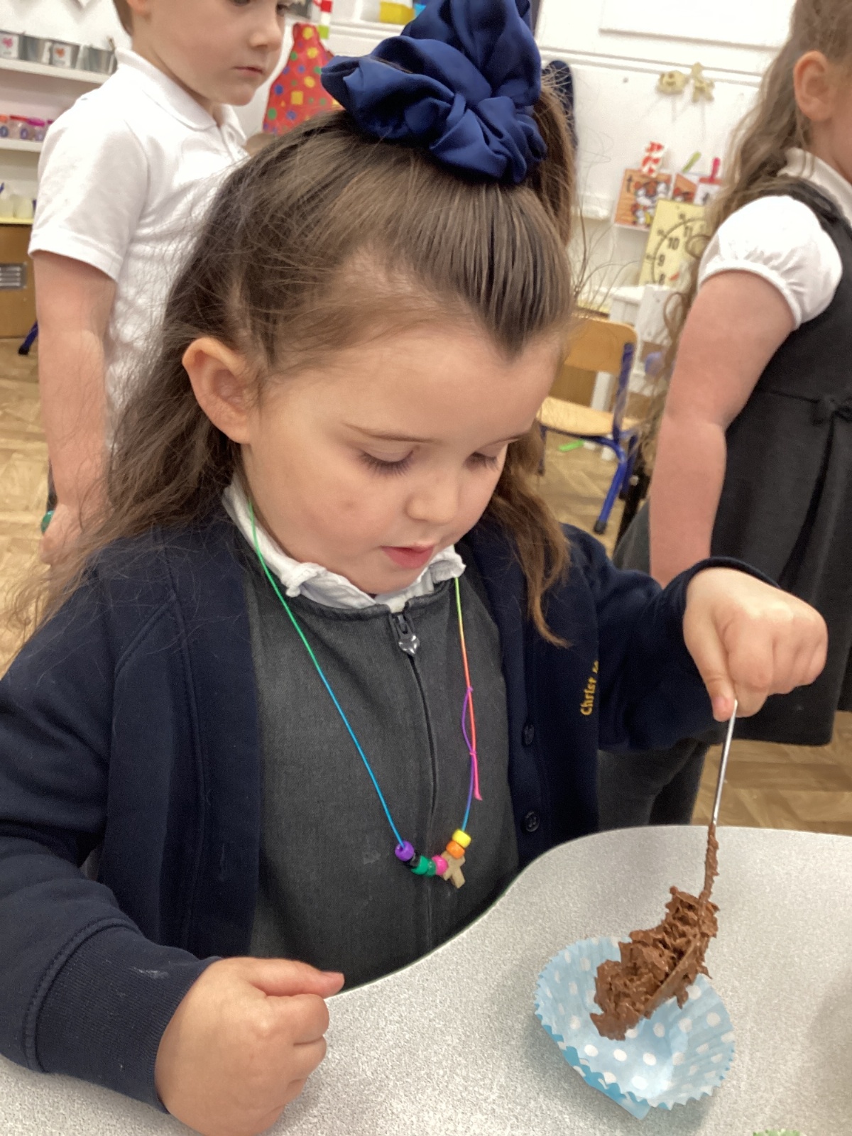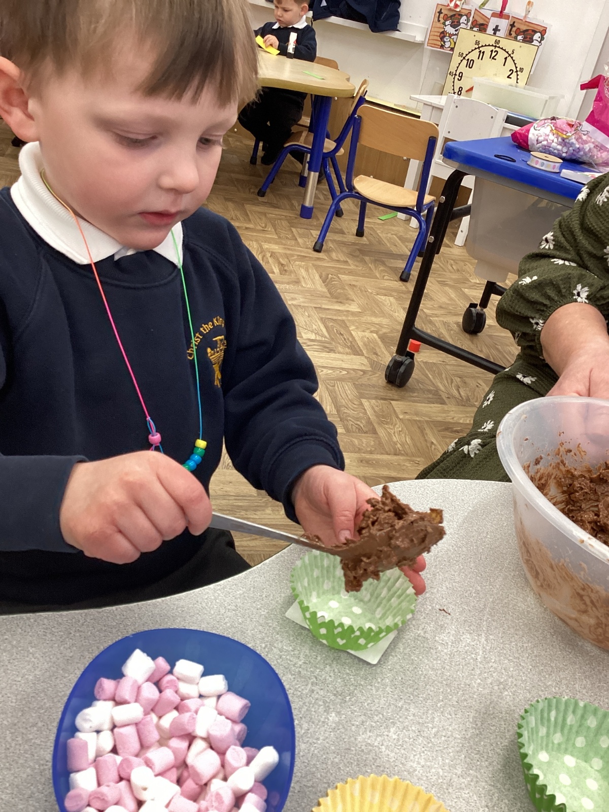 The children had a wonderful time making chocolate dinosaur krispie cakes. The children helped to melt the chocolate, watching carefully as it changed from a solid to smooth and runny. They talked about how the chocolate changed, using words like, 'melting' and 'hot' to describe what they could see.