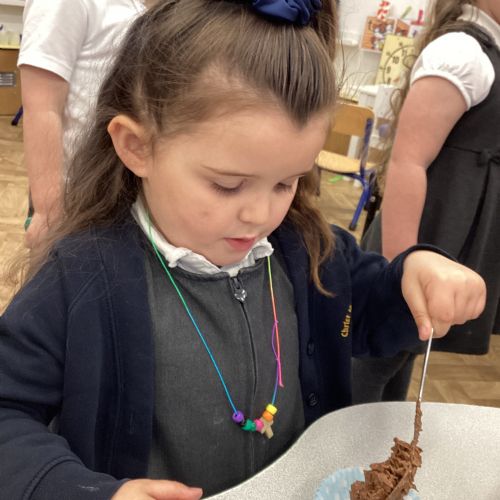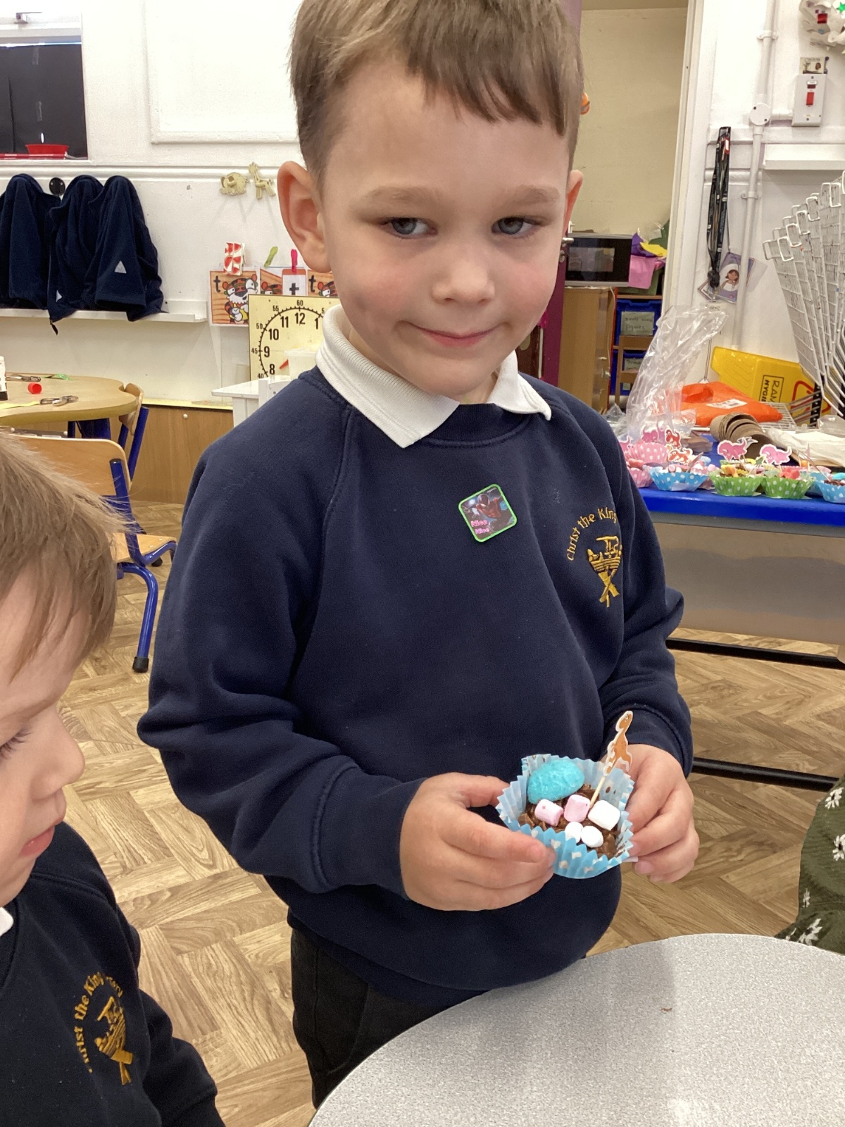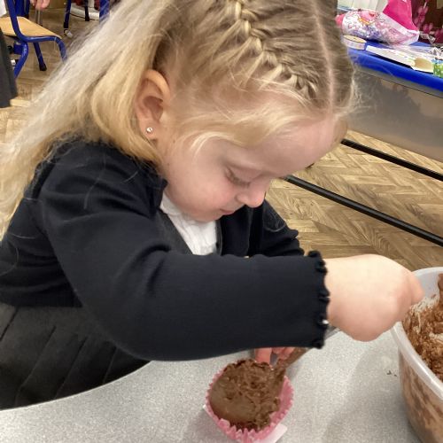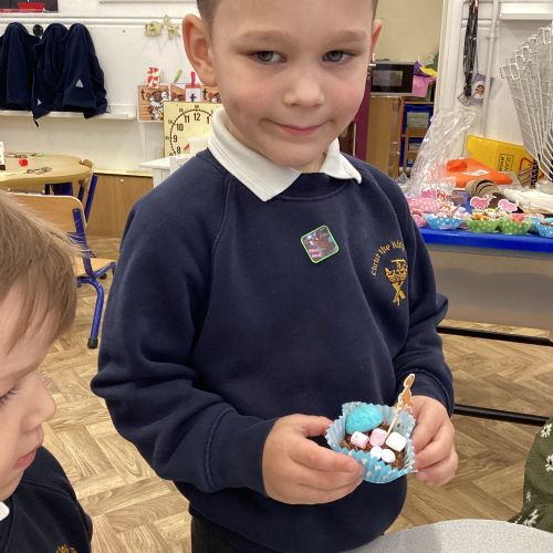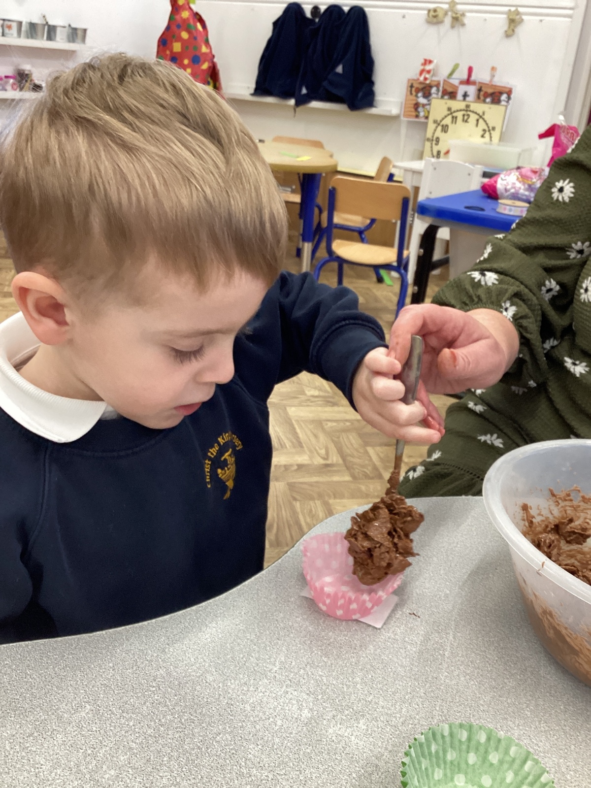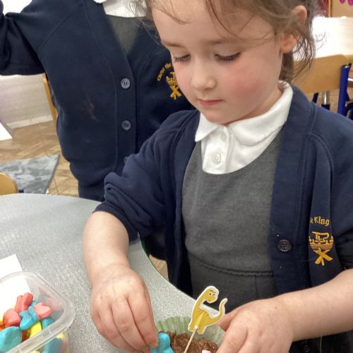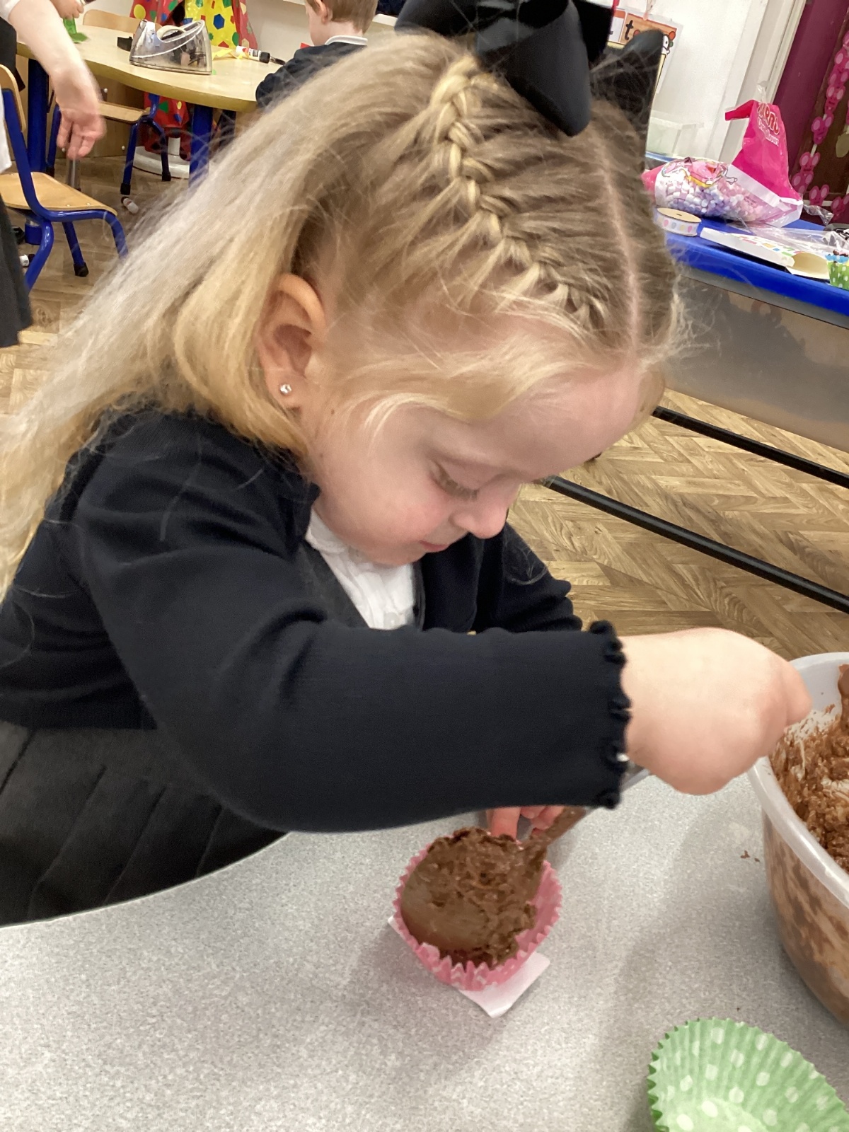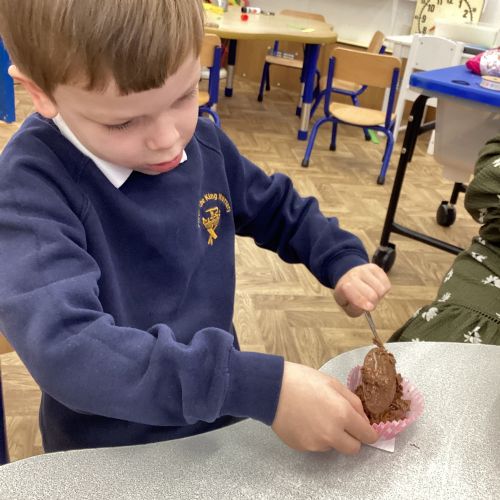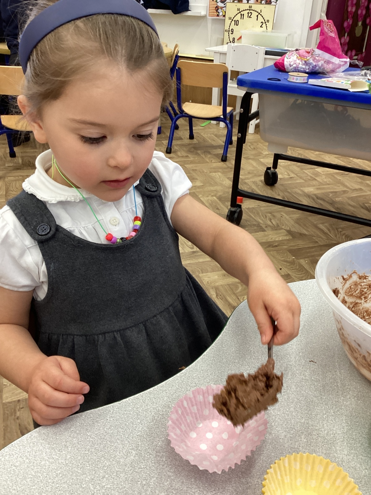The children had a wonderful time making chocolate dinosaur krispie cakes. The children helped to melt the chocolate, watching carefully as it changed from a solid to smooth and runny. They talked about how the chocolate changed, using words like, 'melting' and 'hot' to describe what they could see.