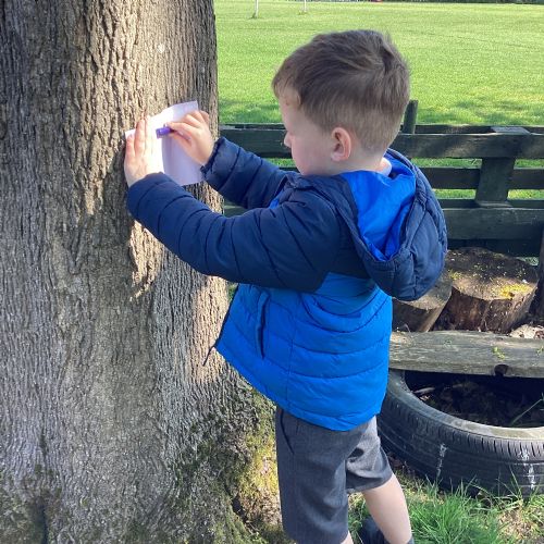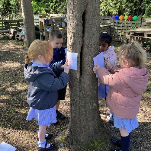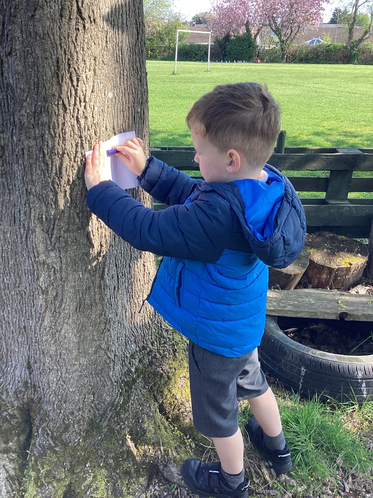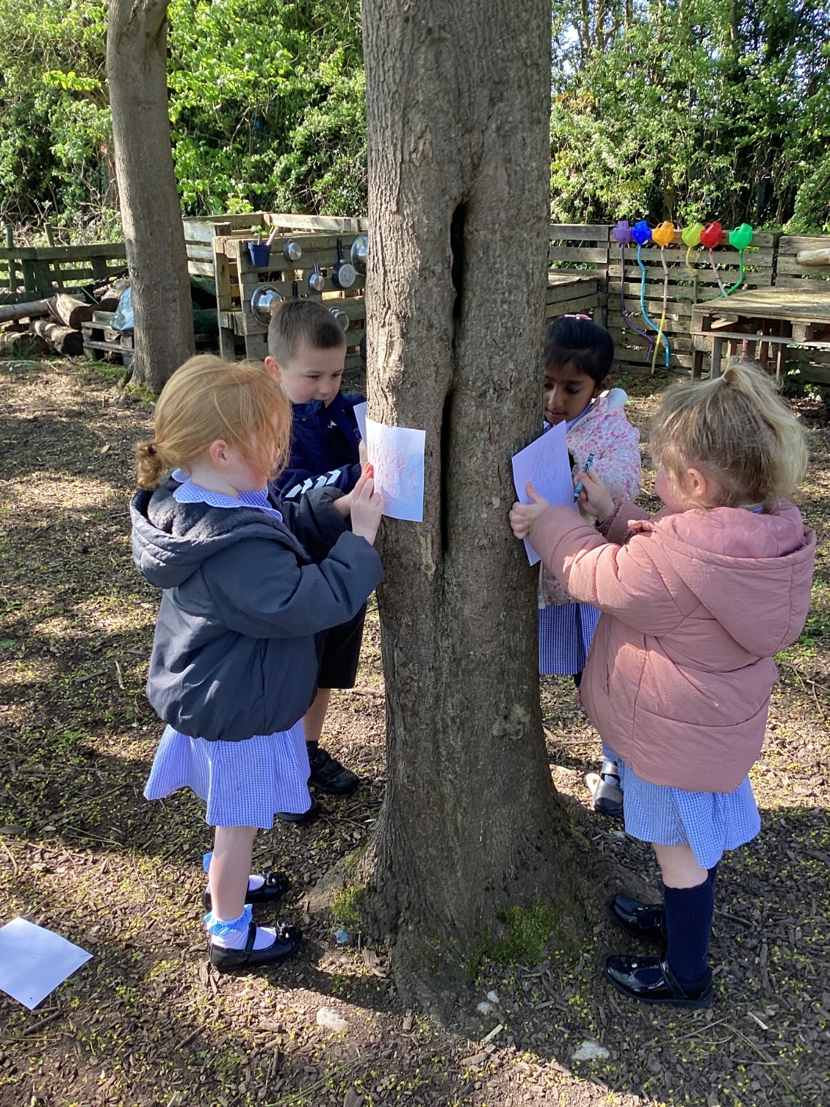 For Earth Day, we walked to Scots Lane site to learn more about how to look after our trees. We learnt about how important trees are for our climate and their special powers.  We used our senses to explore the area and we collected lots of natural treasures and did bark rubbings too. We also made some tree guardians to help look after our trees,