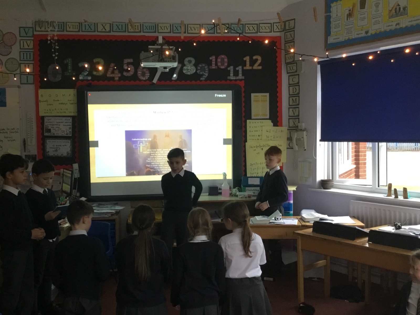 This afternoon, as part of our RE lesson, we read the Transfiguration in St Matthew's Gospel and went on to enact out the scene.  Leo also found the story in Luke and Mark!