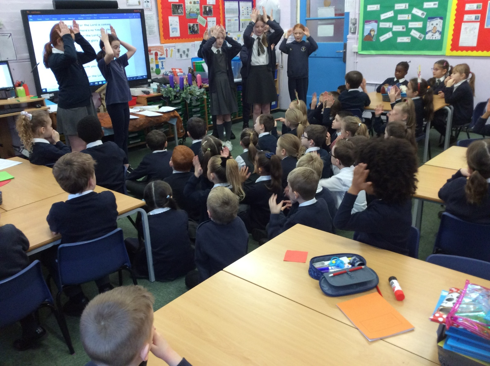 Children in Year Five and Six visited Year Two to lead a special Advent assembly. After talking about their advent promises, pupils cut out outlines of their hands and wrote their promises down. They then made a special advent wreath with their hand cut-outs. Thank you to Year Five and Six pupils for such a lovely morning!